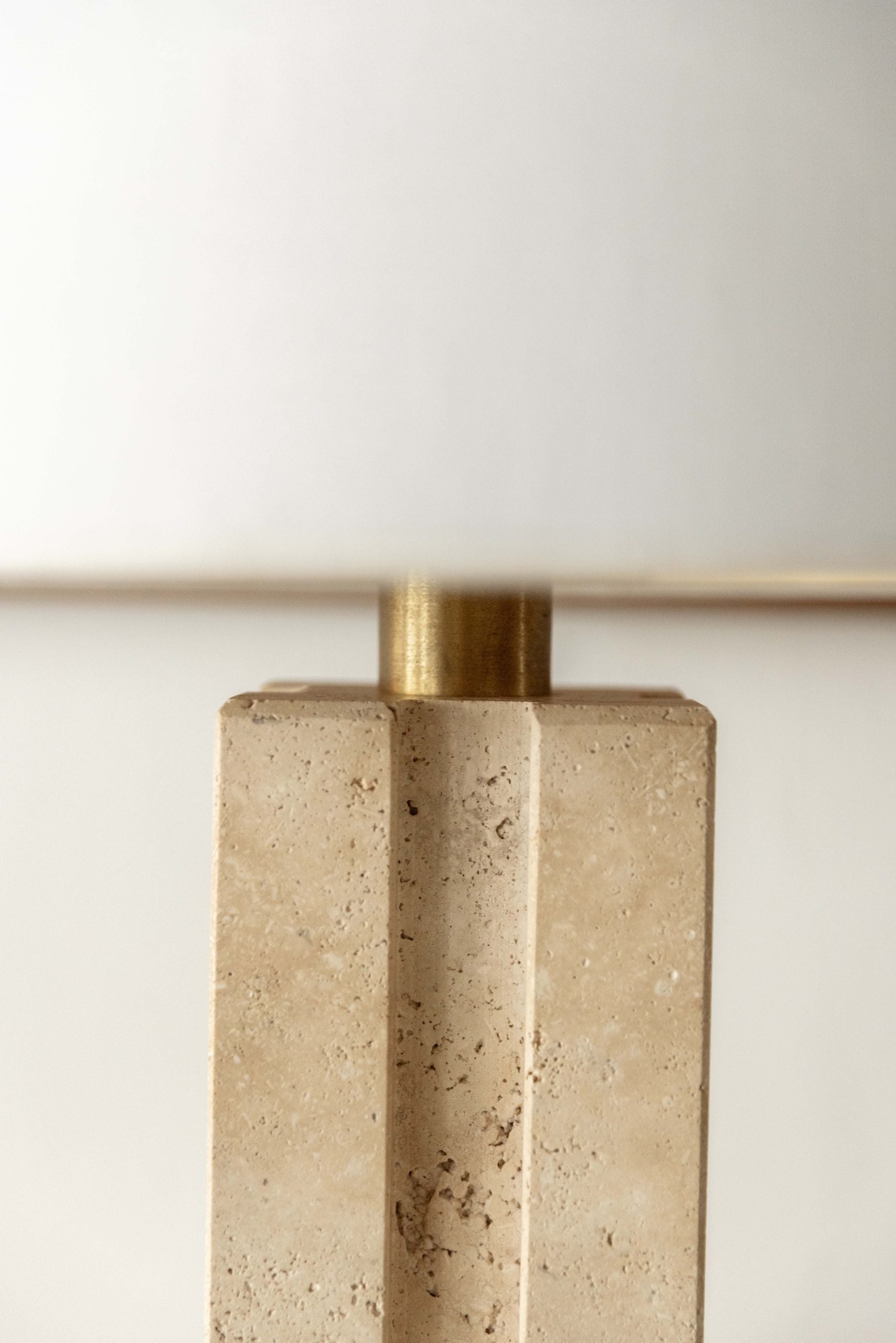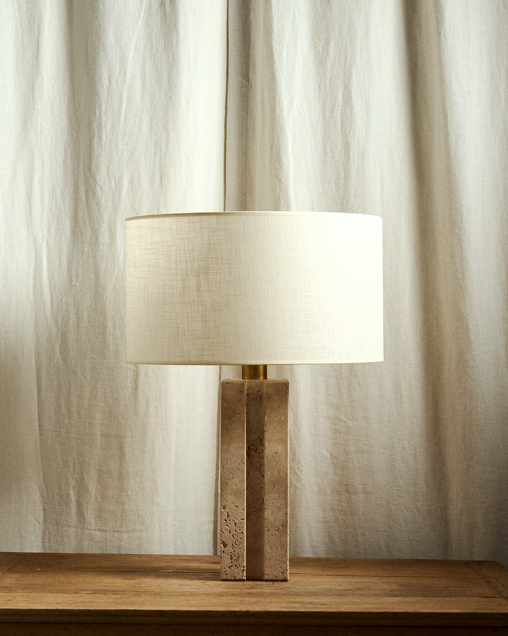 Lámpara de mesa realizada en mármol travertino, con base cuadrada. Las vetas y poros naturales de la piedra aportan textura y singularidad, haciendo de cada pieza un objeto único.