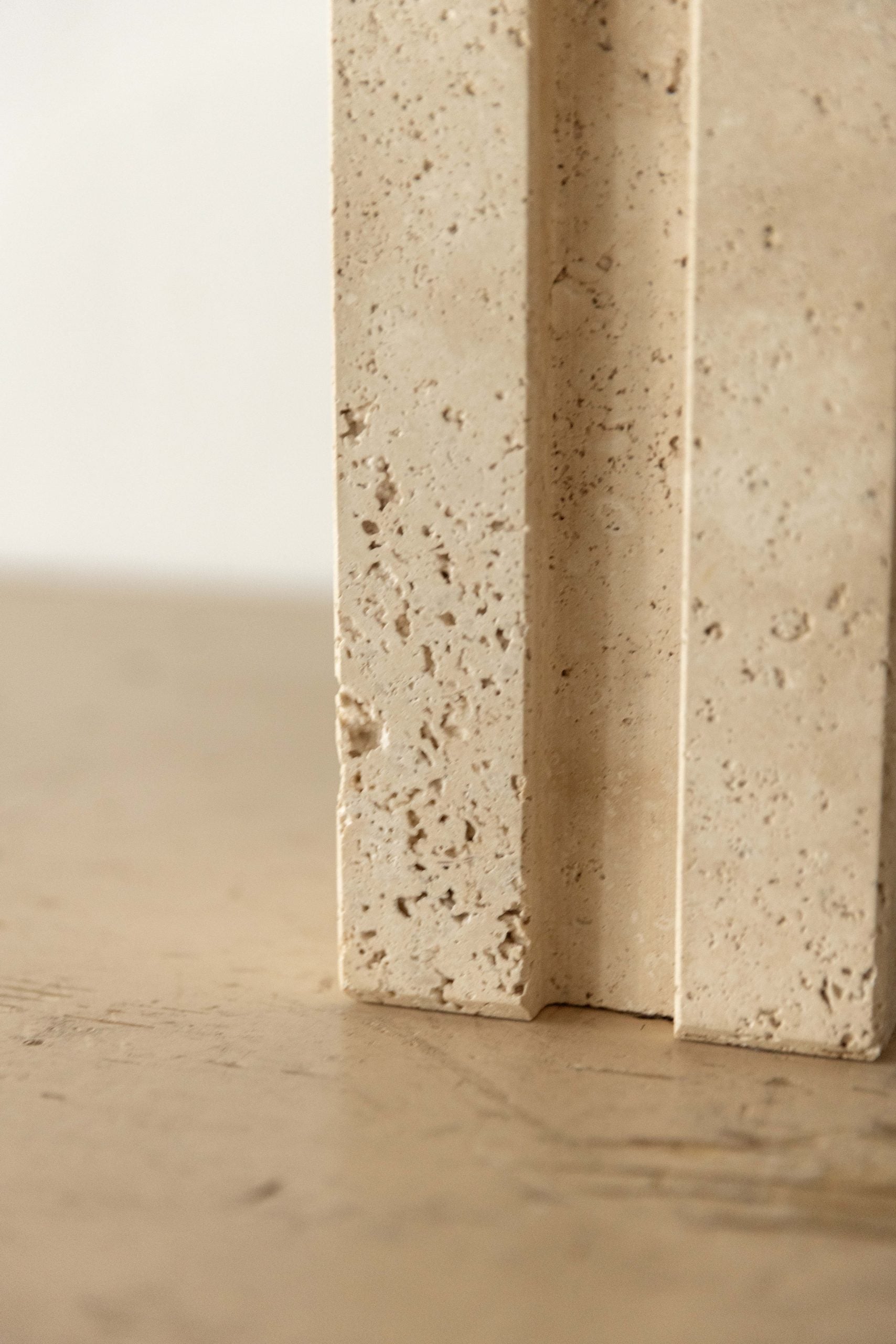 El travertino, empleado desde la antigüedad en la arquitectura y el mobiliario, es apreciado por su resistencia y su carácter atemporal. En esta lámpara, la forma pura y el acabado natural resaltan la belleza del material, convirtiéndola en una pieza que une la esencia escultórica de la piedra con la funcionalidad de la luz.