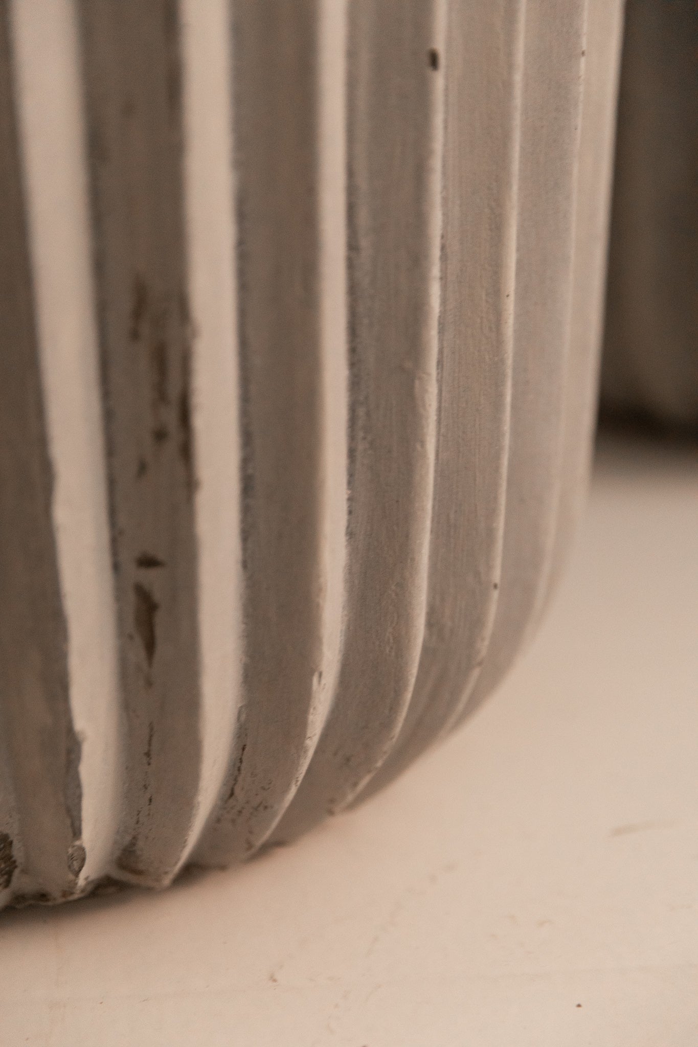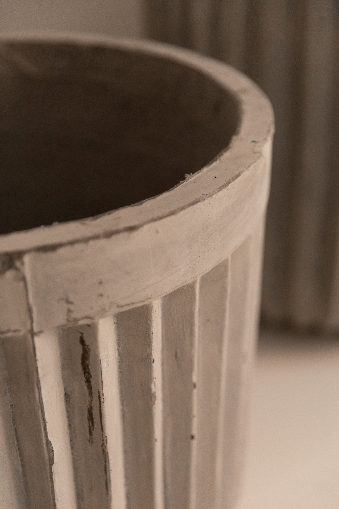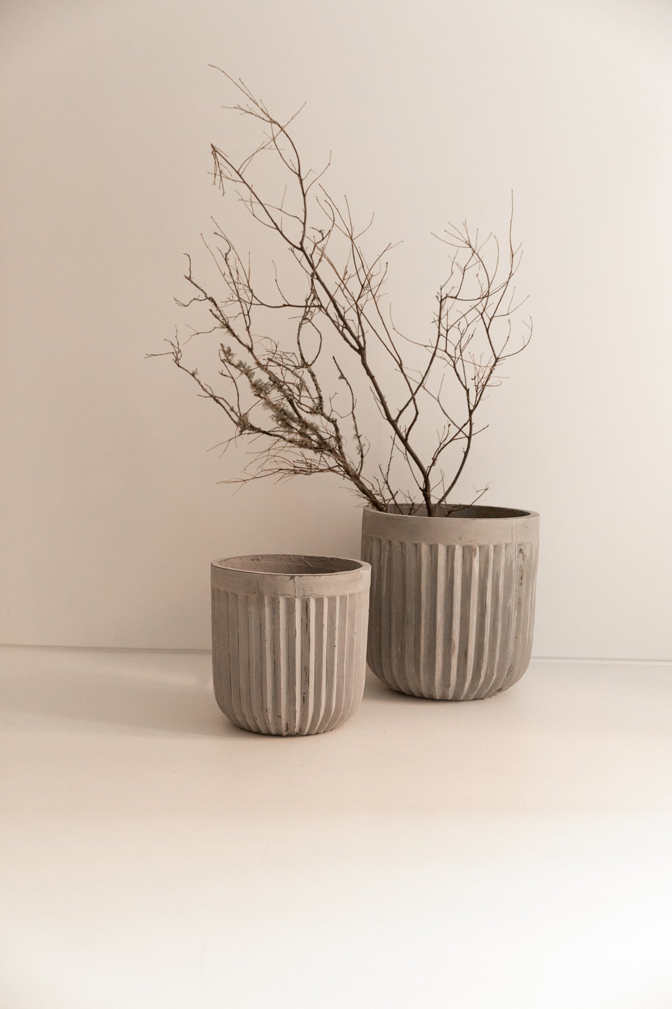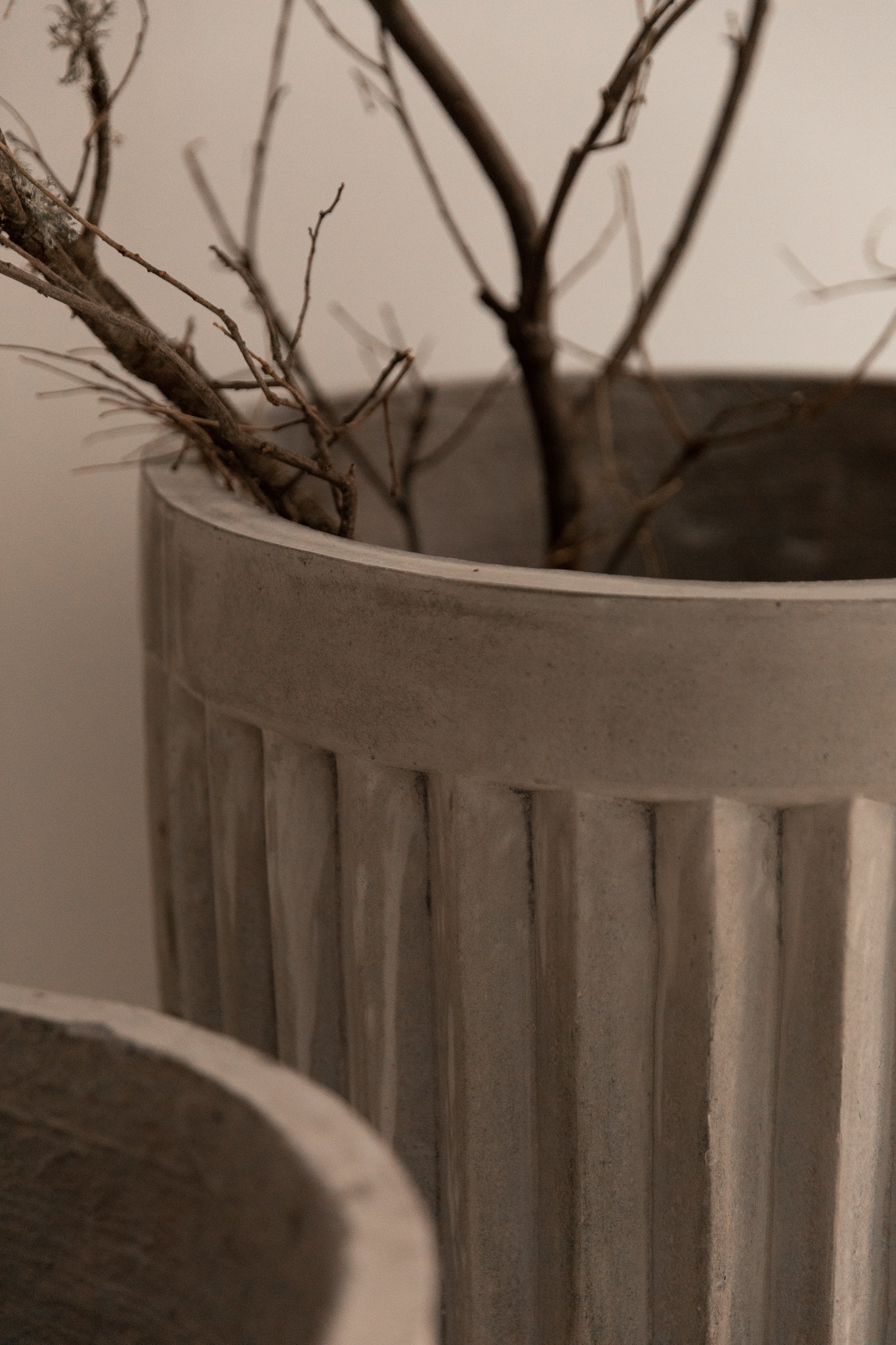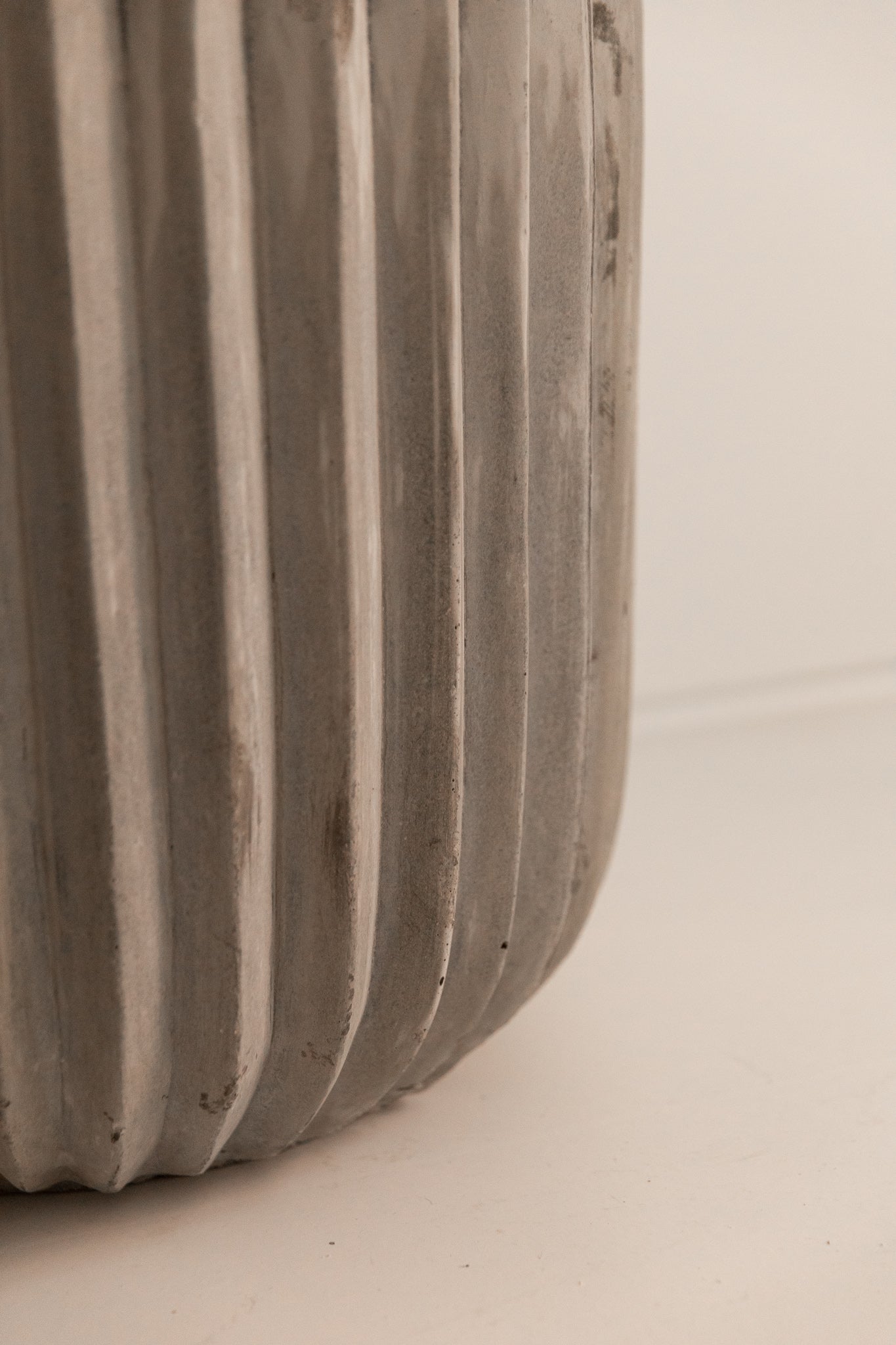 Macetero elaborado de forma artesanal en cemento, material mineral de alta resistencia estructural y estabilidad frente a la intemperie.