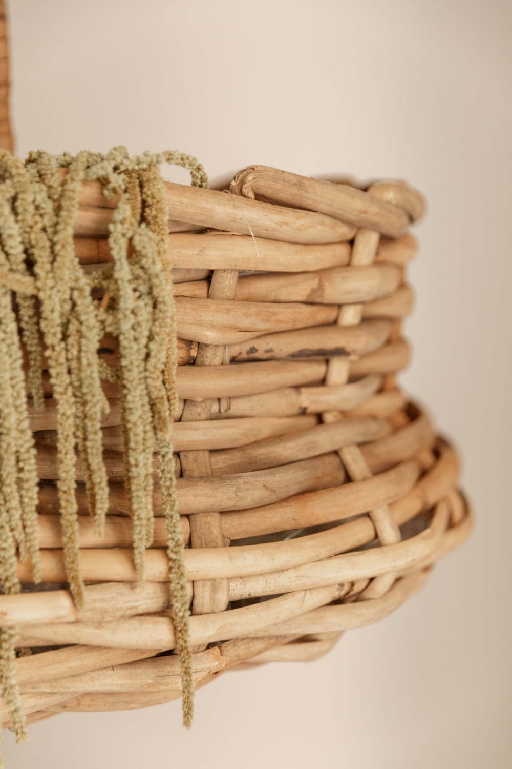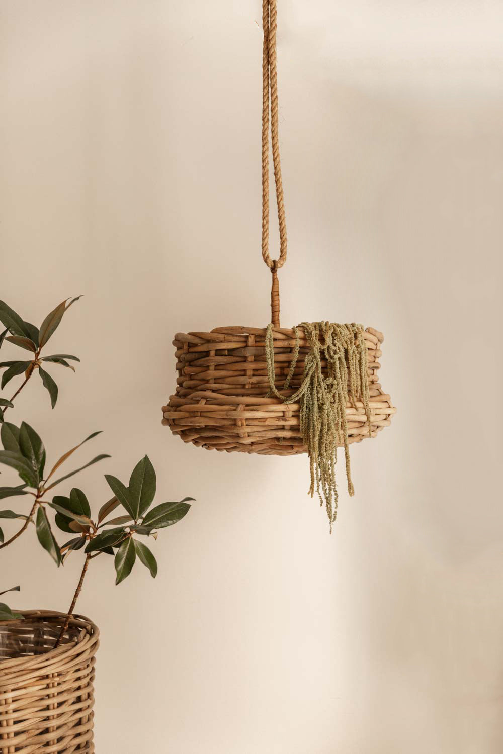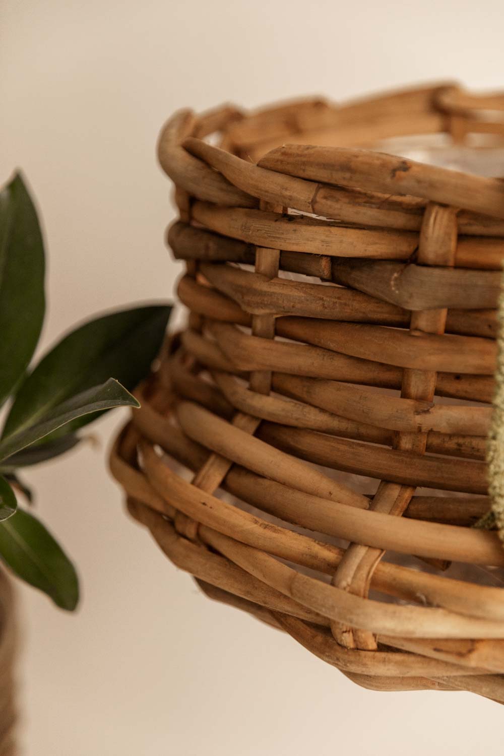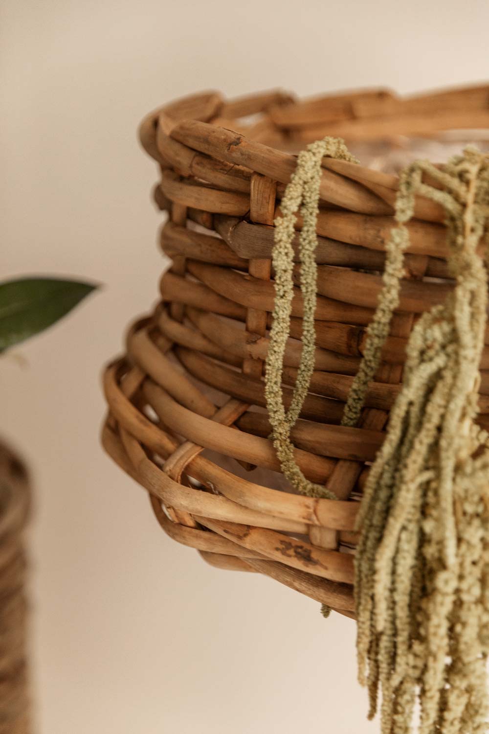 Macetero elaborado en ratán natural trenzado, con estructura ligera y resistente. Incluye una cuerda de fibra natural para su suspensión, permitiendo instalarlo fácilmente en techos, vigas o soportes, tanto en interiores como en exteriores cubiertos.