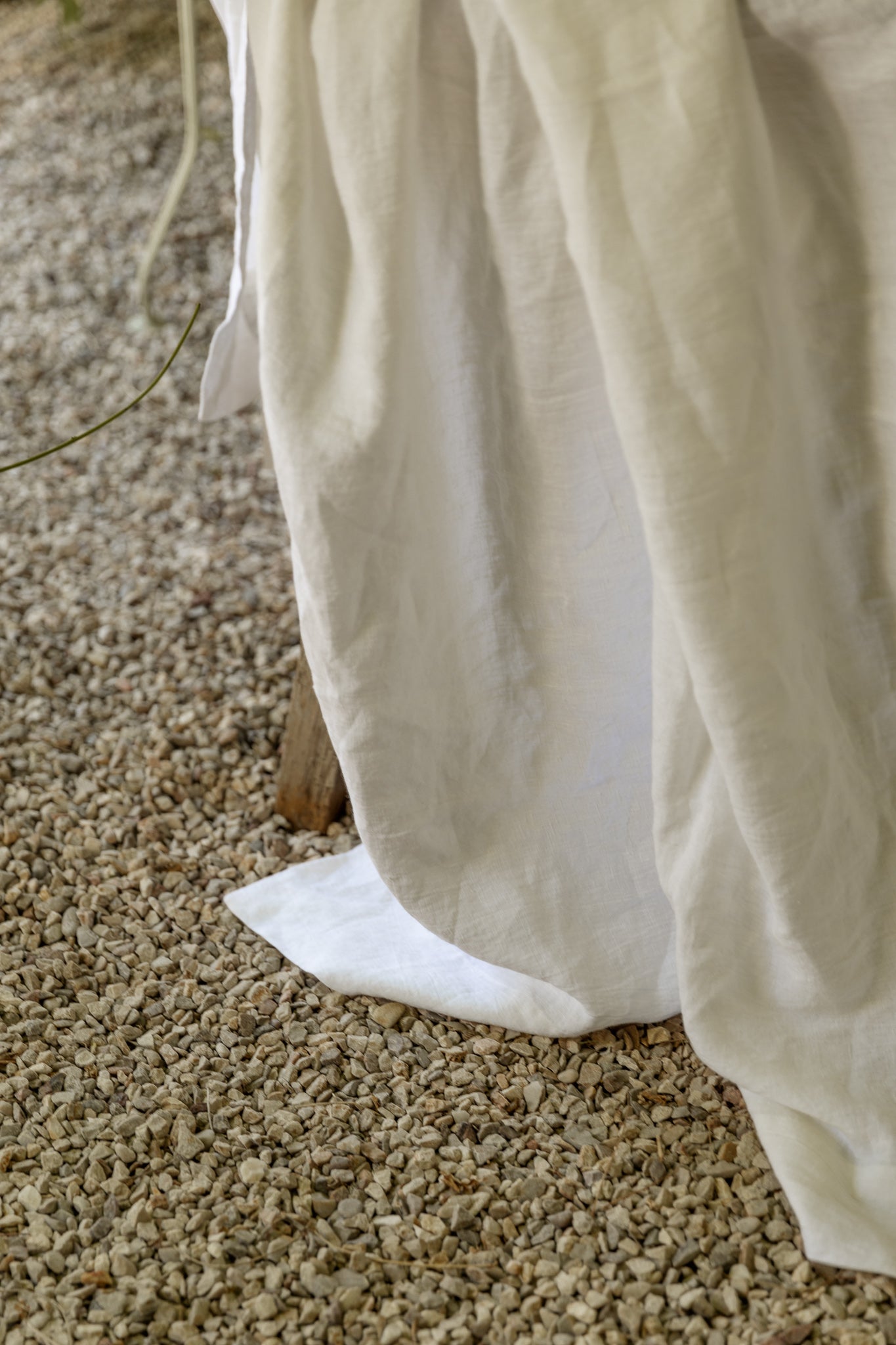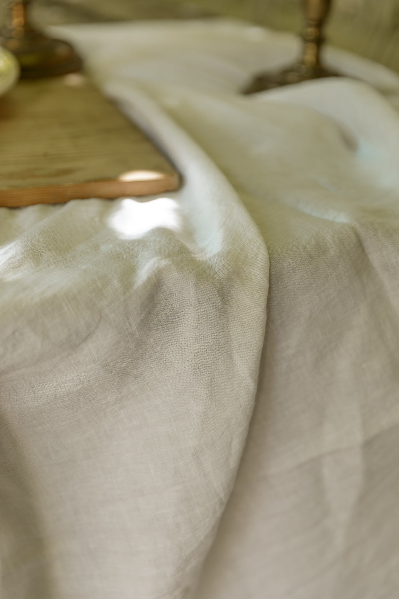 Mantel confeccionado en 100 % lino lavado en color blanco, realizado de forma artesanal en España. Disponible en distintas medidas, combina un tejido noble con una caída suave y natural, pensado para vestir la mesa con sencillez y sofisticación.