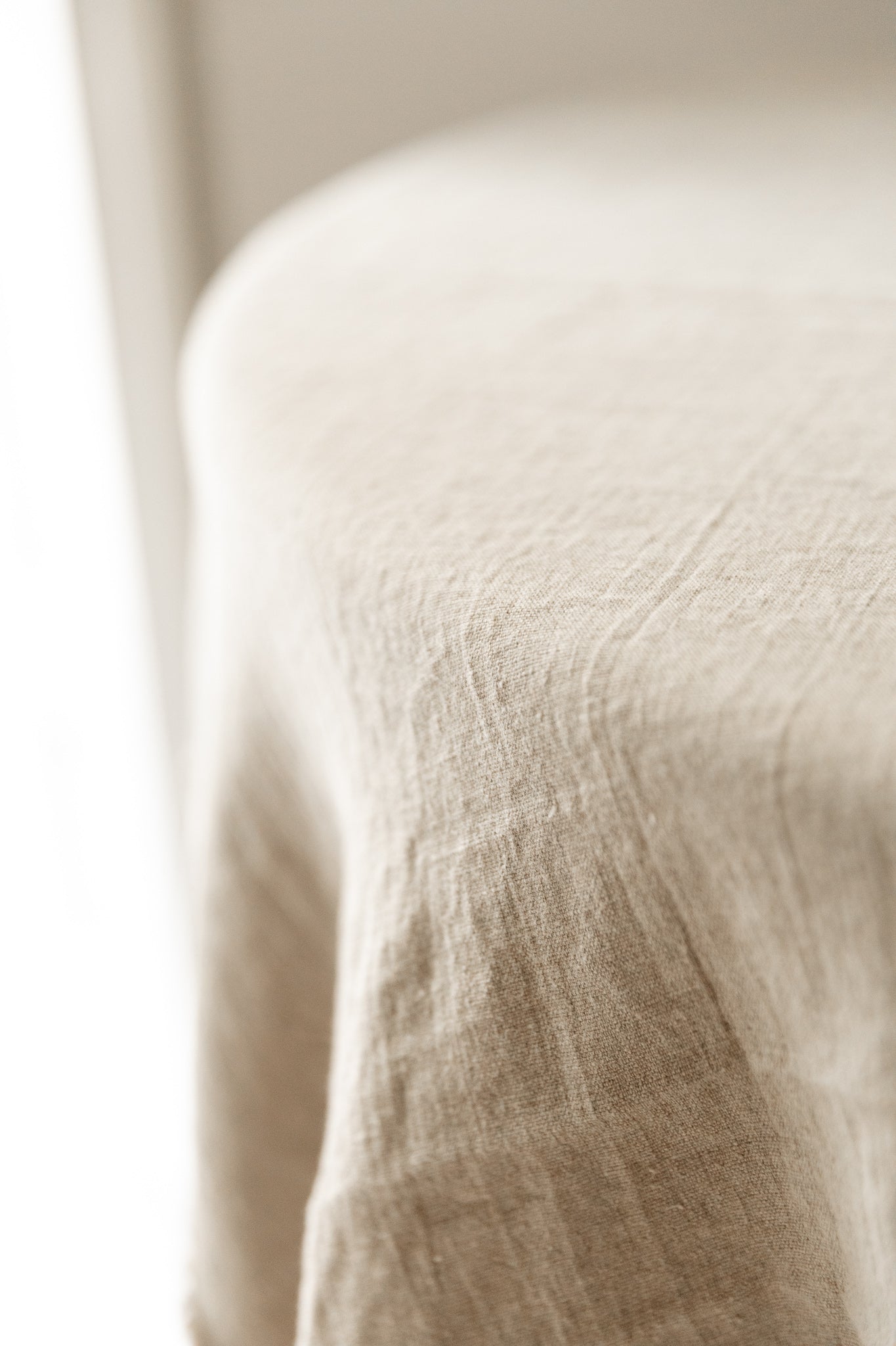Mantel confeccionado en lino rústico de color natural con acabado desflecado, elaborado artesanalmente en España y certificadas OEKO-TEX Standard 100 que garantiza un proceso textil respetuoso y seguro.