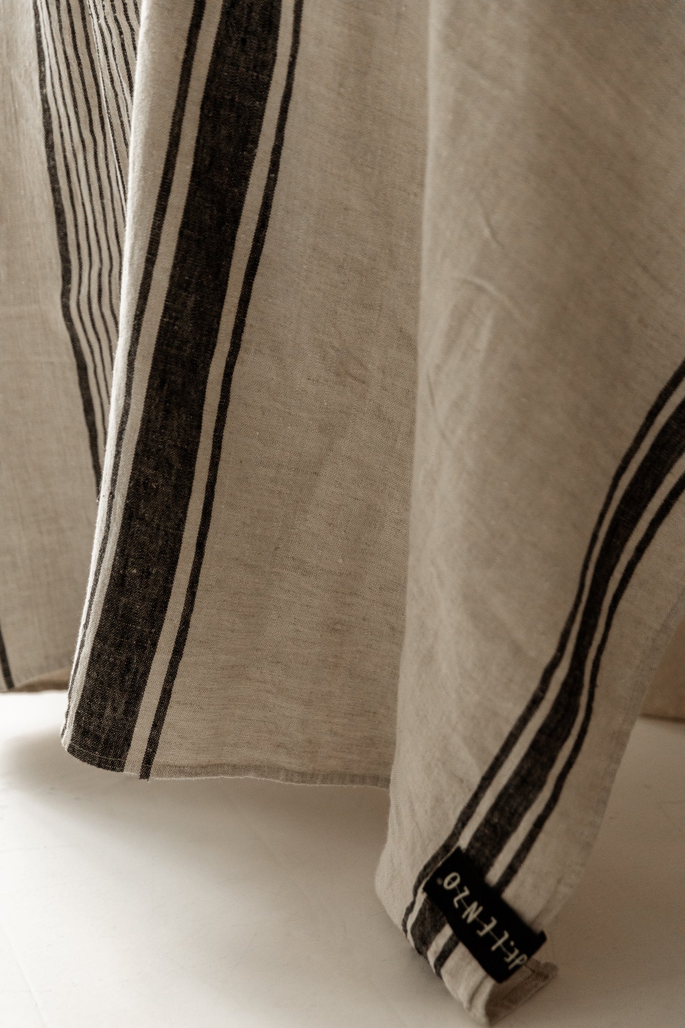 Mantel confeccionado artesanalmente en 100 % lino lavado a la piedra, en color natural con líneas negras. Elaborado en España con certificación OEKO-TEX Standard 100 (certificado n.º 2021OK068), que garantiza un proceso textil respetuoso y seguro.