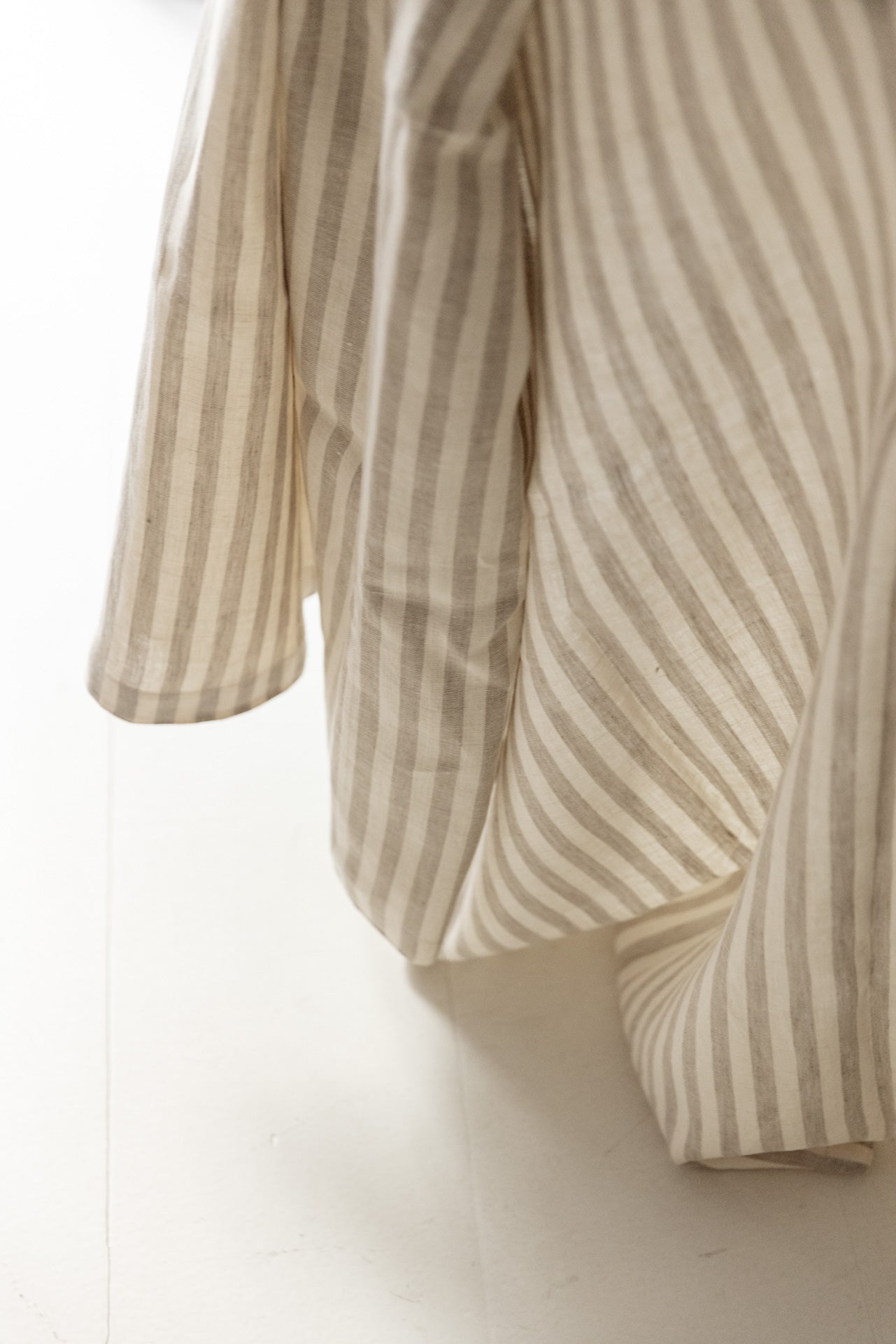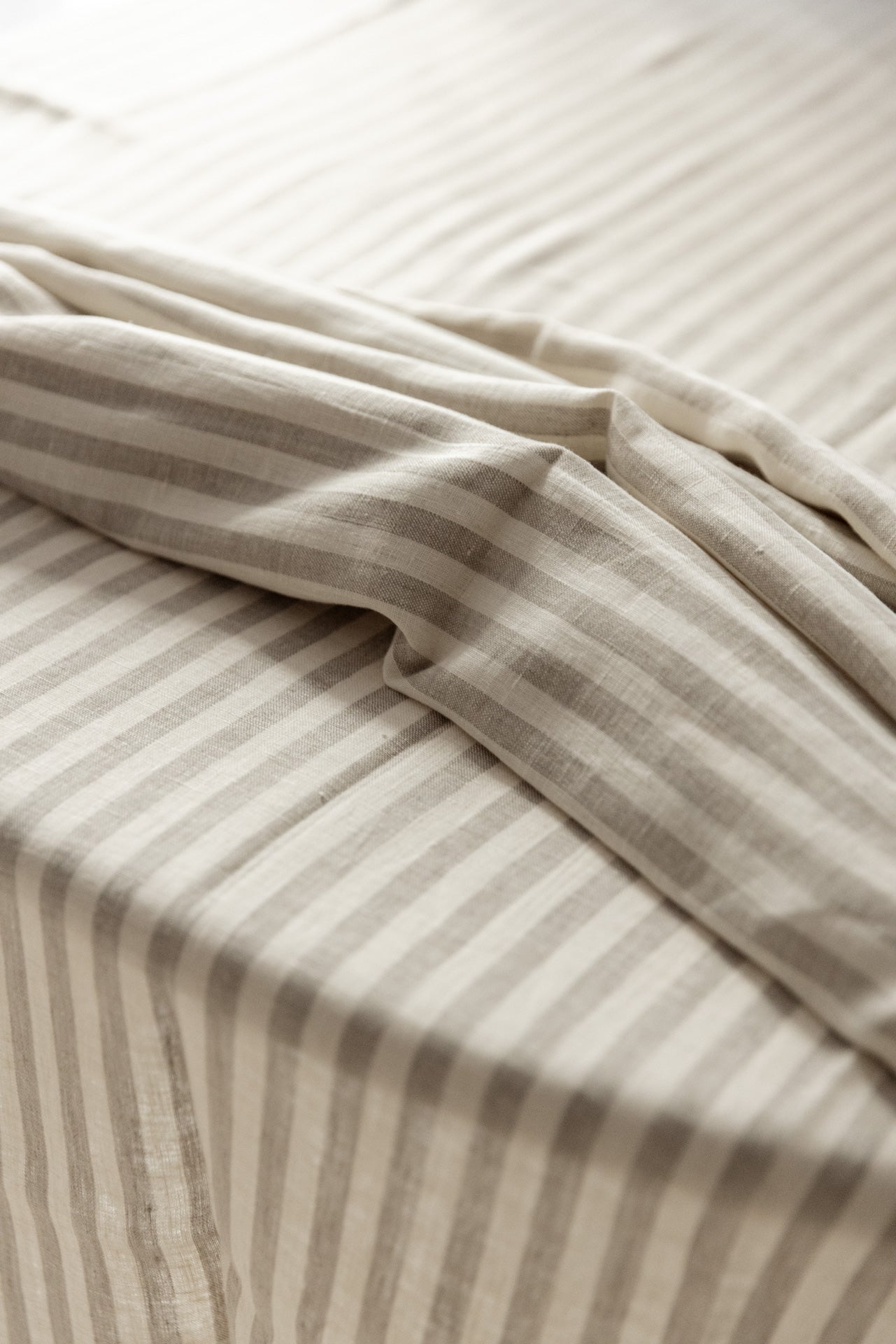 El lino natural aporta frescura, textura y durabilidad, mientras que el rayado introduce un gesto de elegancia sencilla.
