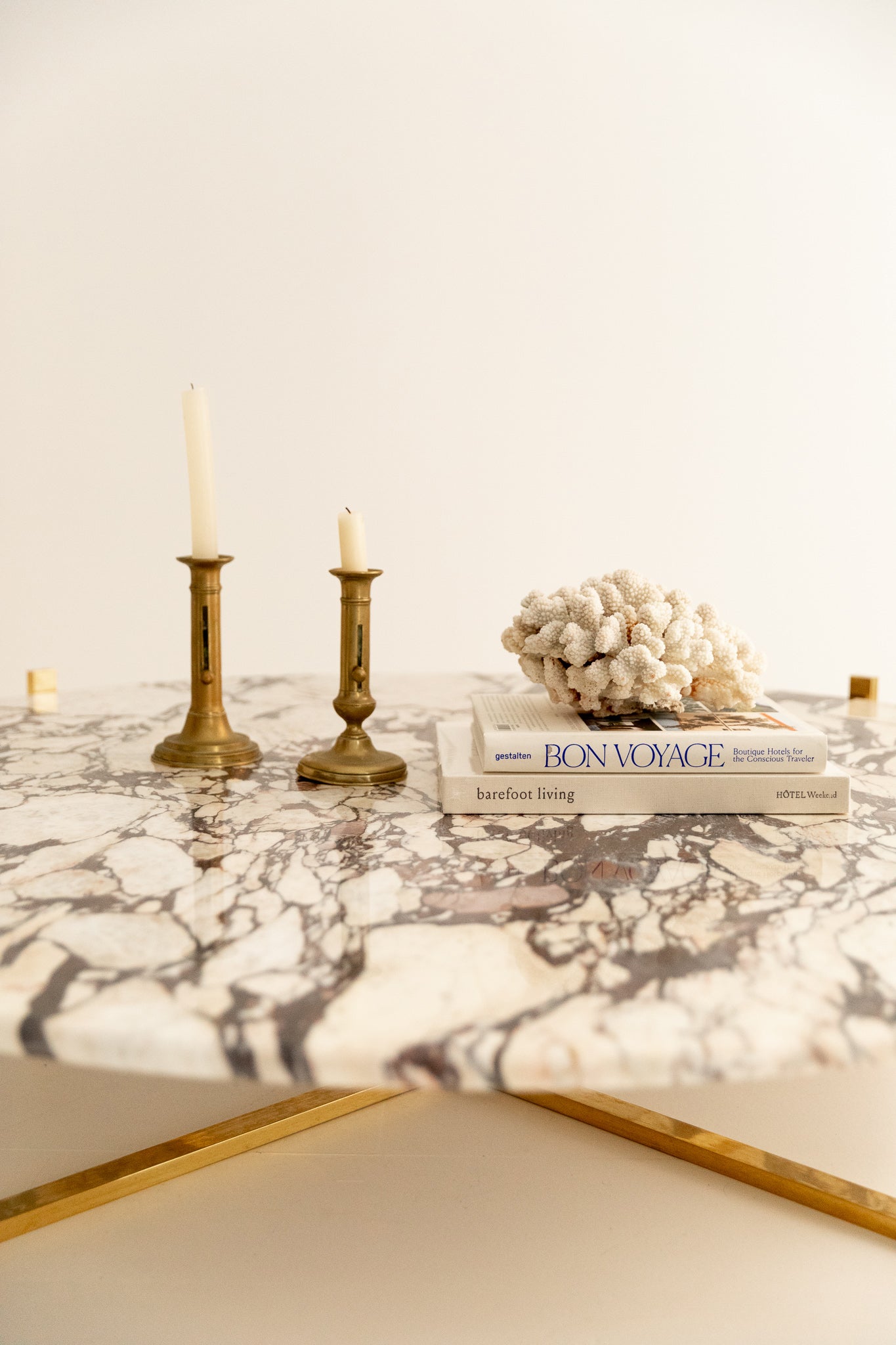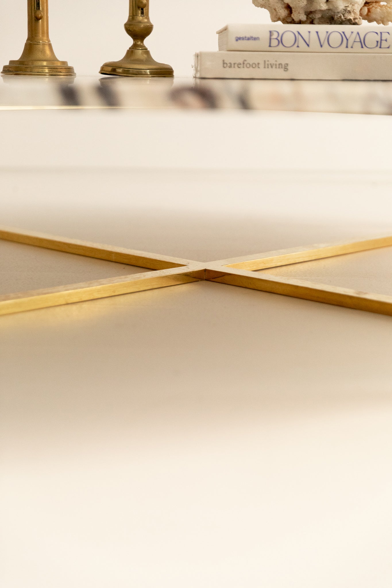 Mesa de centro con sobre de mármol Calacatta Viola y estructura en forma de aspa en latón.