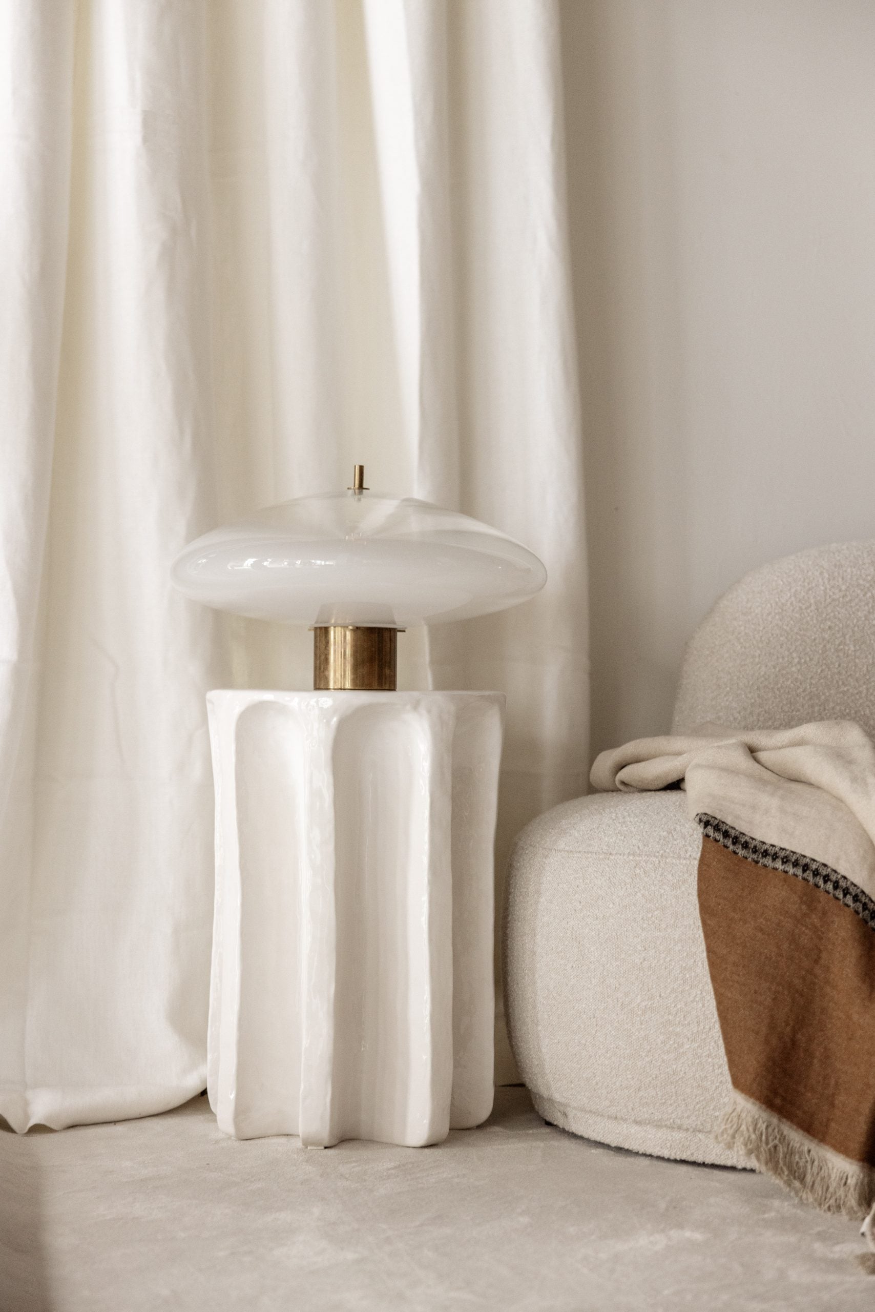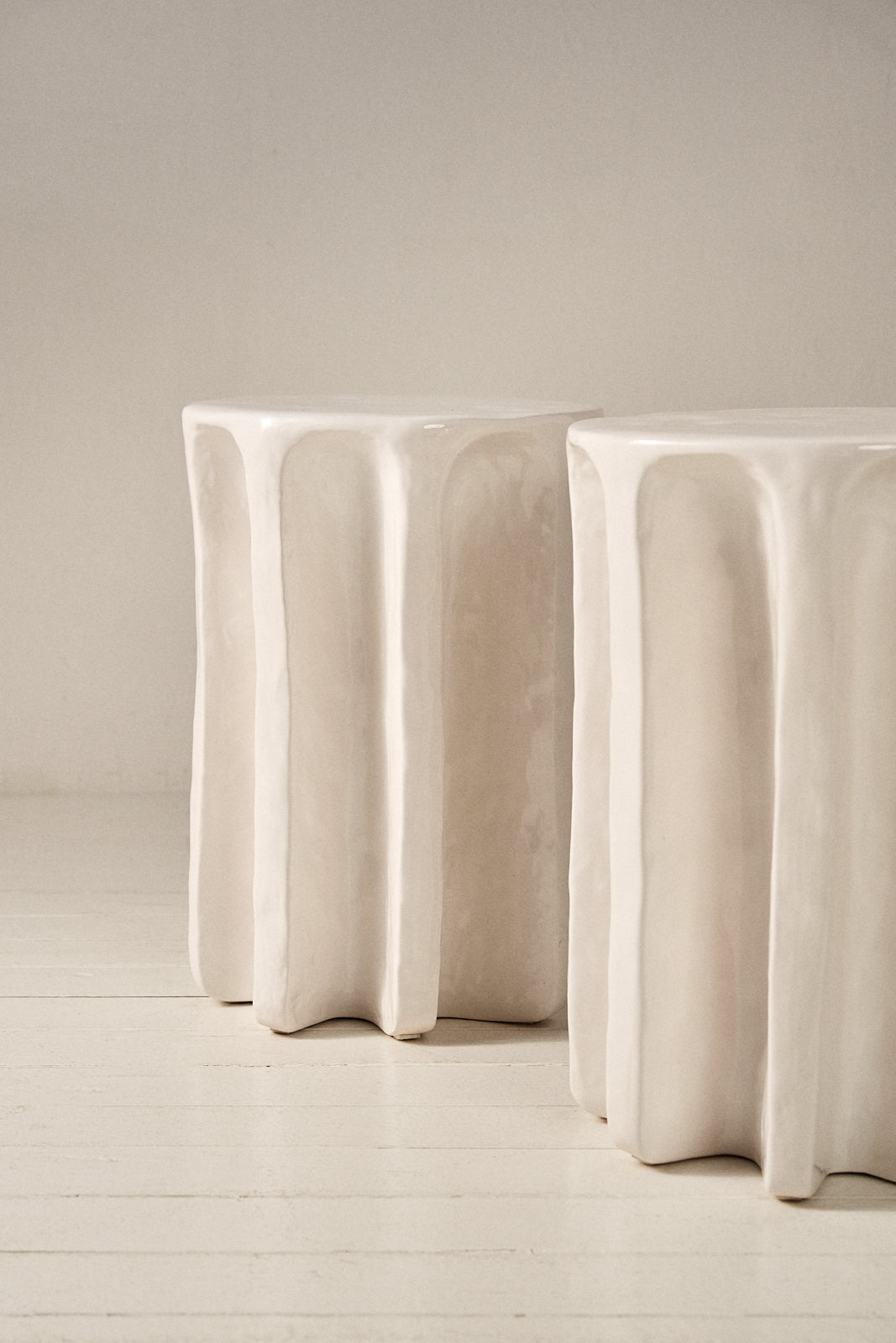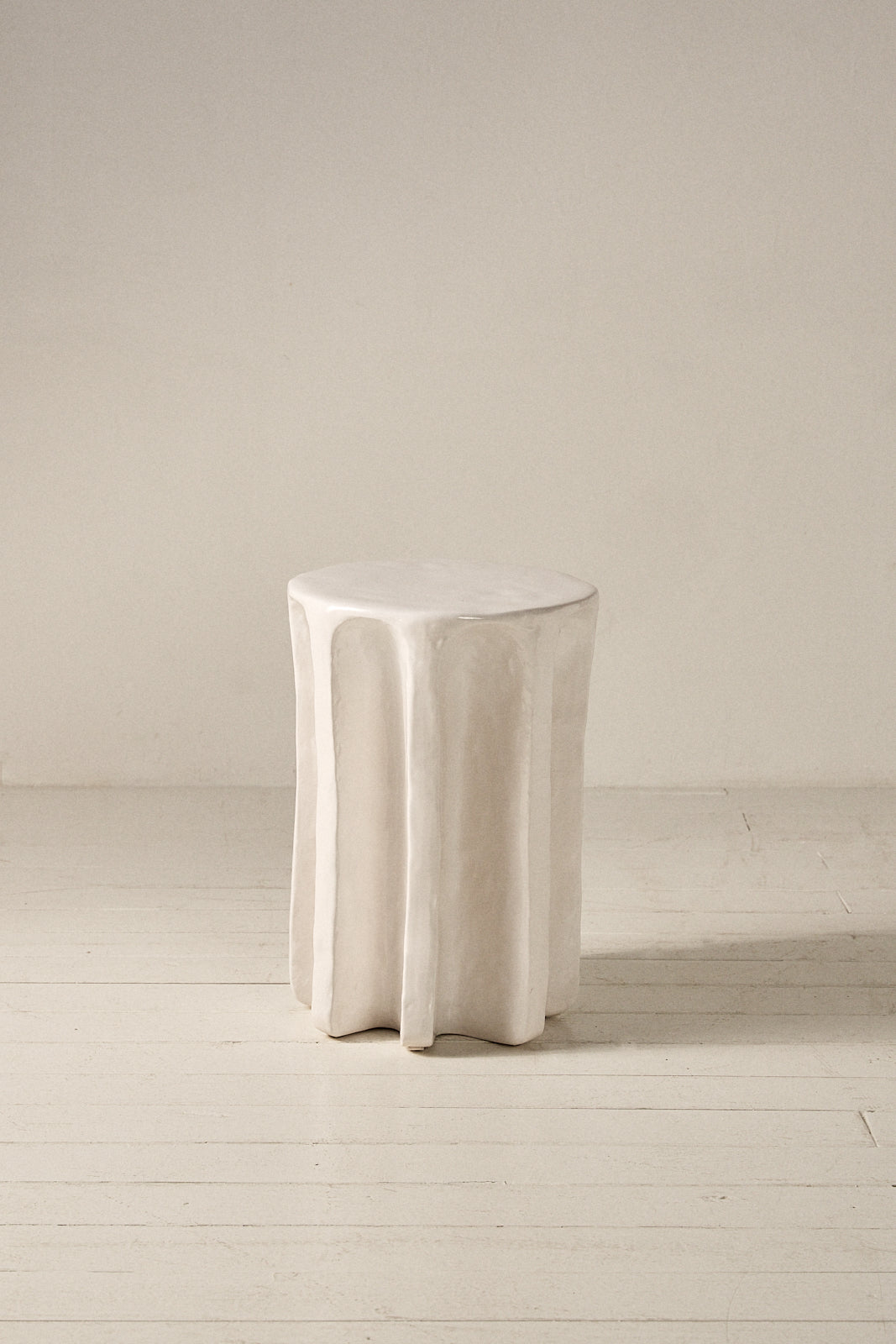 Mesa auxiliar elaborada en cerámica esmaltada en blanco, que destaca por su acabado brillante y su superficie suave al tacto. Su diseño minimalista y depurado resalta la pureza del material, aportando luminosidad y ligereza visual a cualquier espacio.