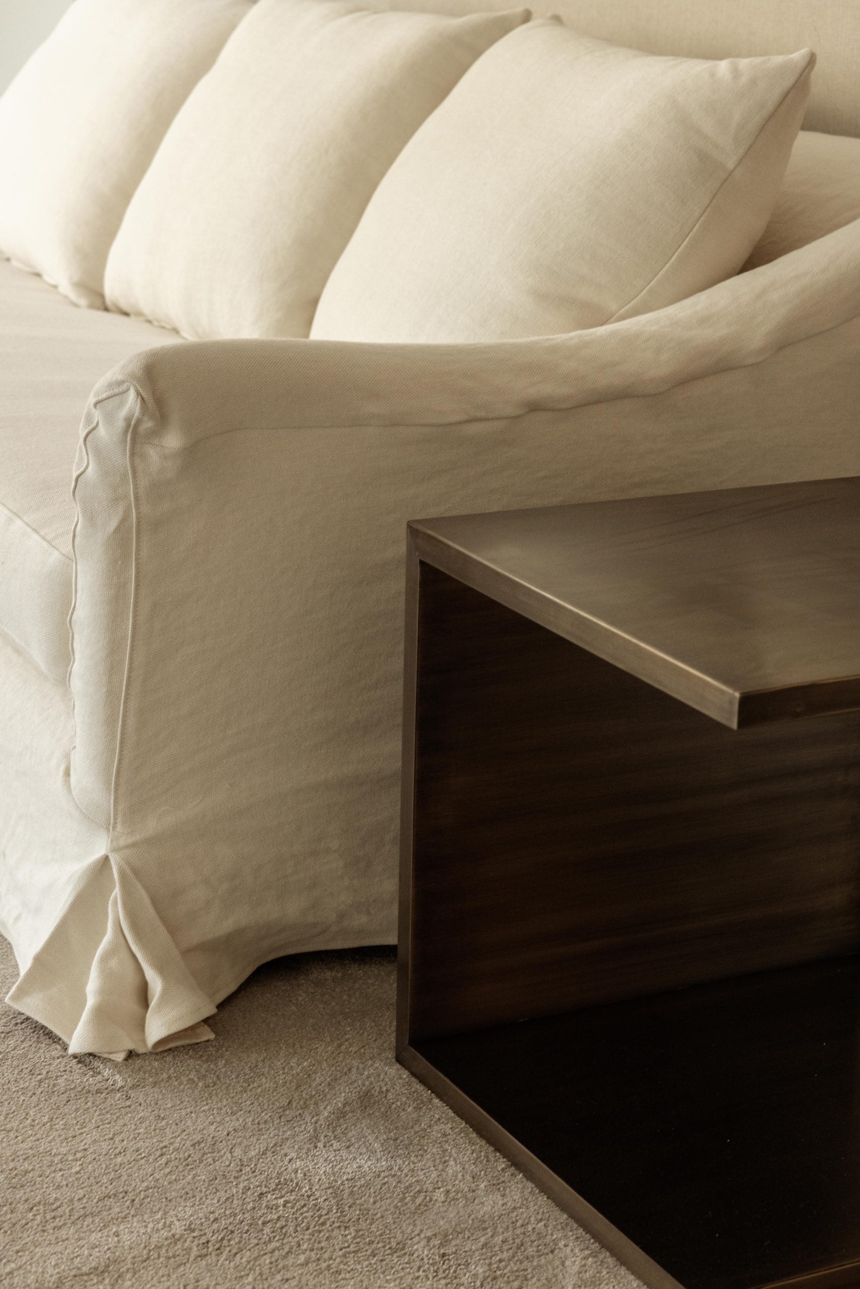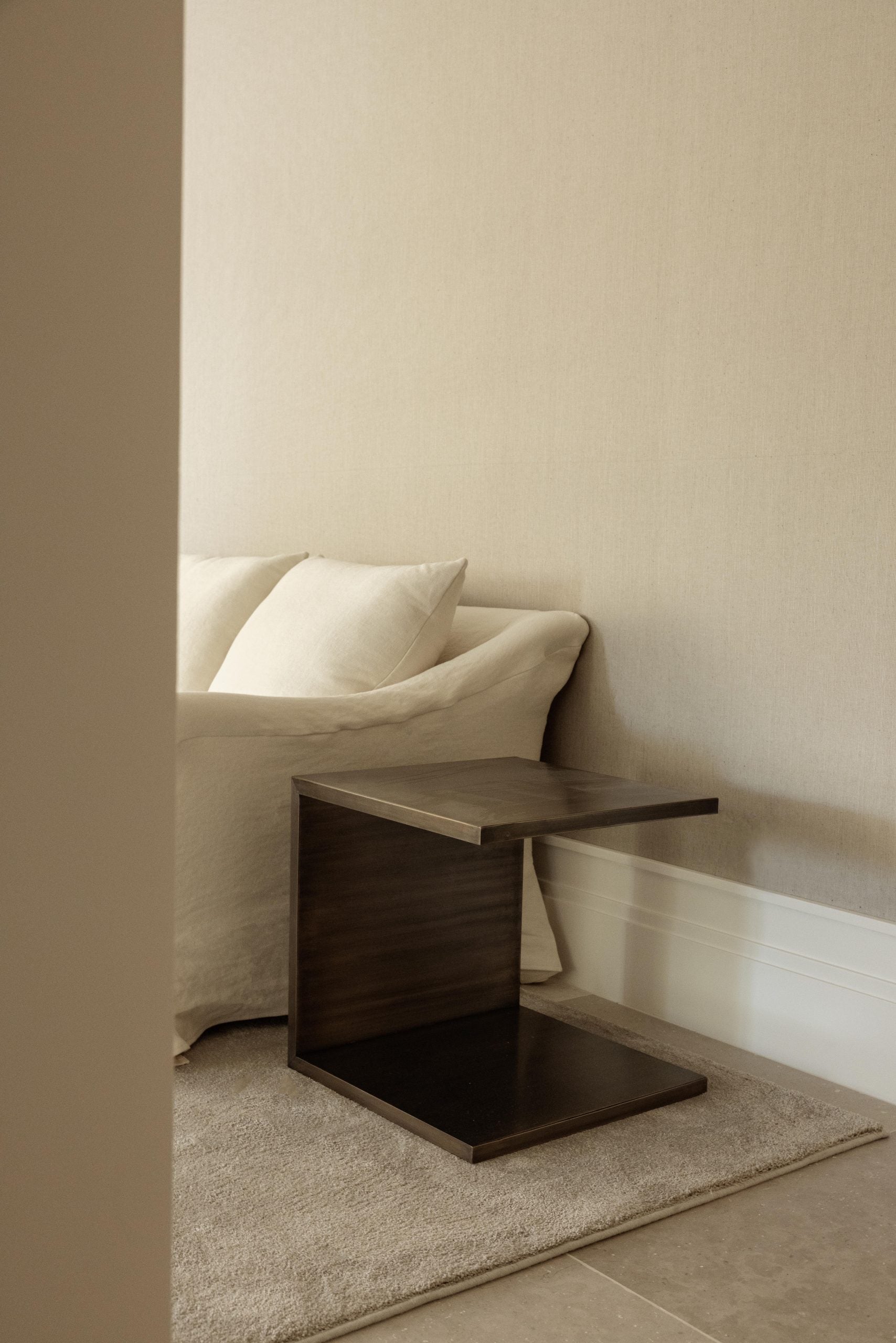 Mesa auxiliar hecha de latón, con diseño contemporáneo en forma de "C" que combina elegancia y ligereza visual.