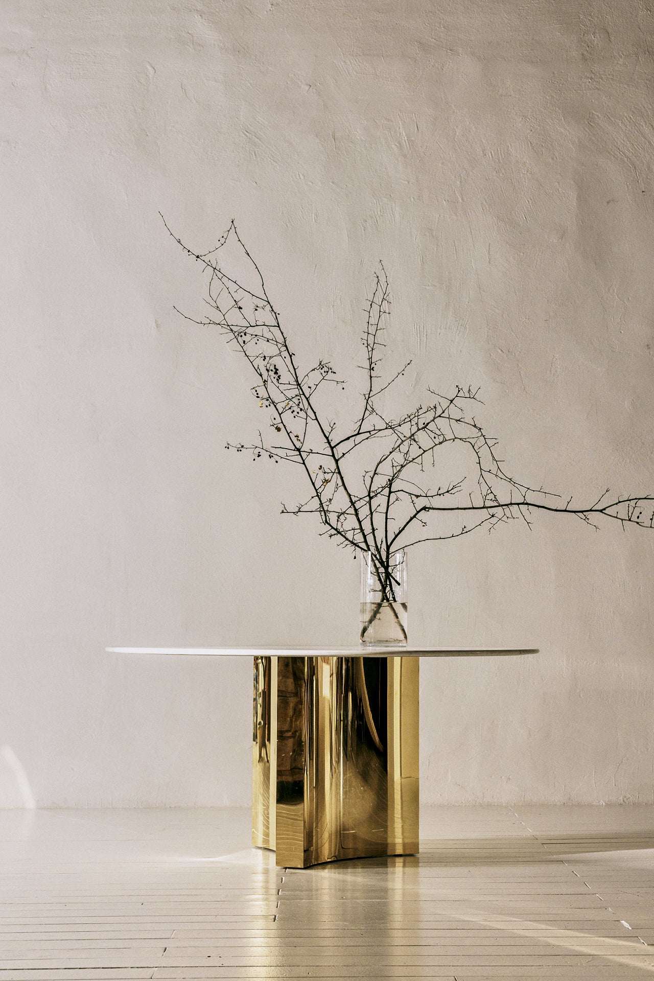 Mesa de comedor con base en forma de estrella realizada en latón y sobre de mármol natural.