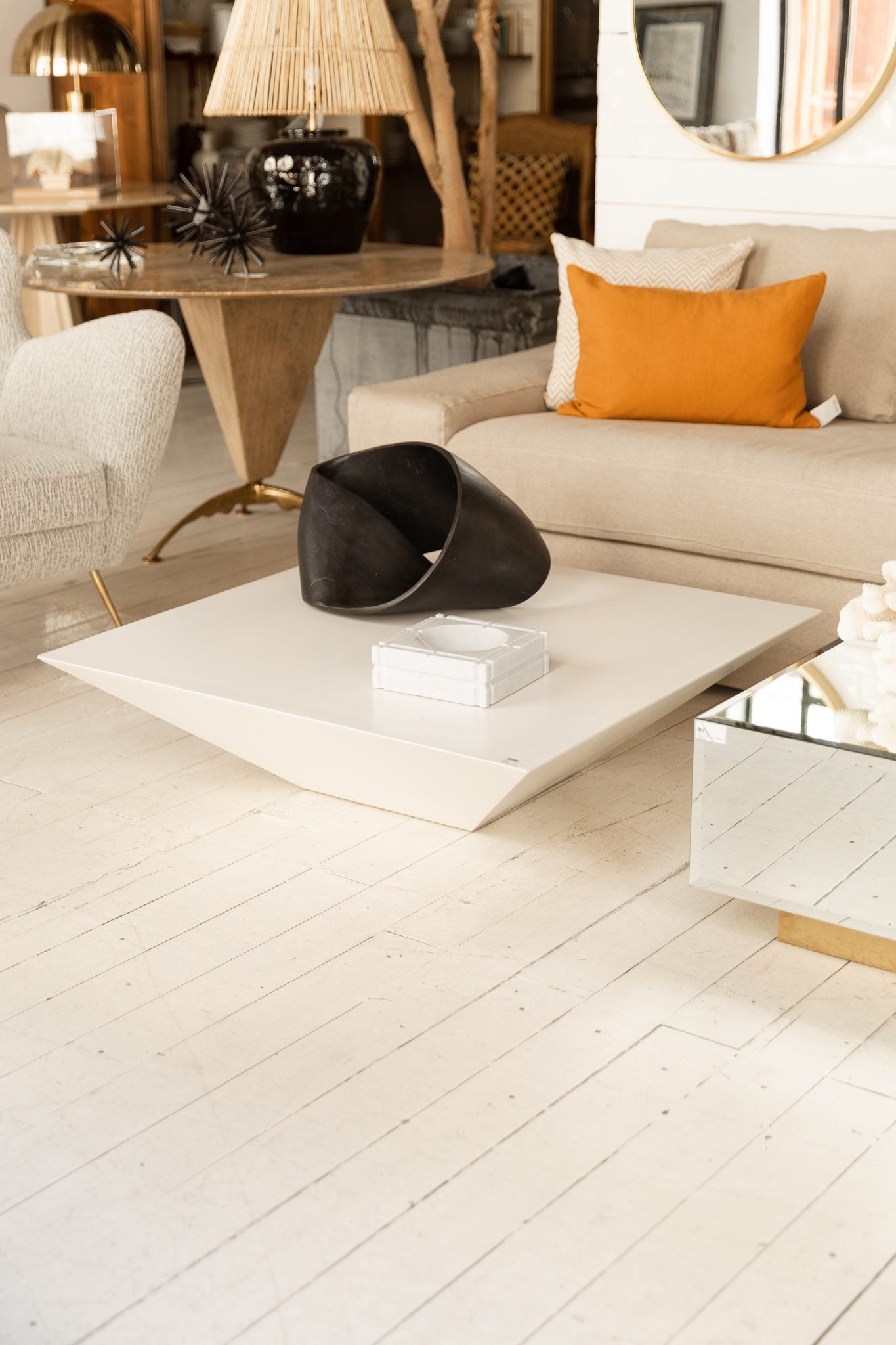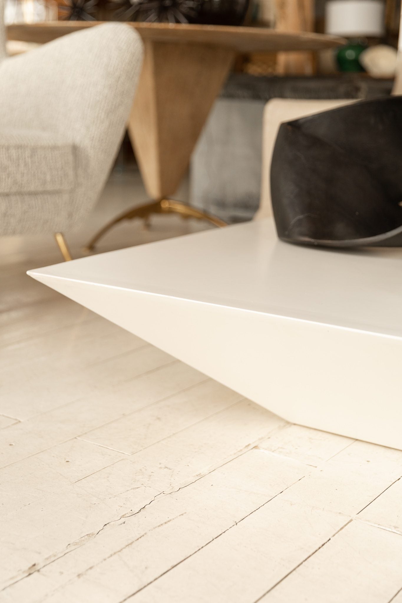 Mesa de centro elaborada en madera lacada en blanco con acabado mate con forma de pirámide invertida.