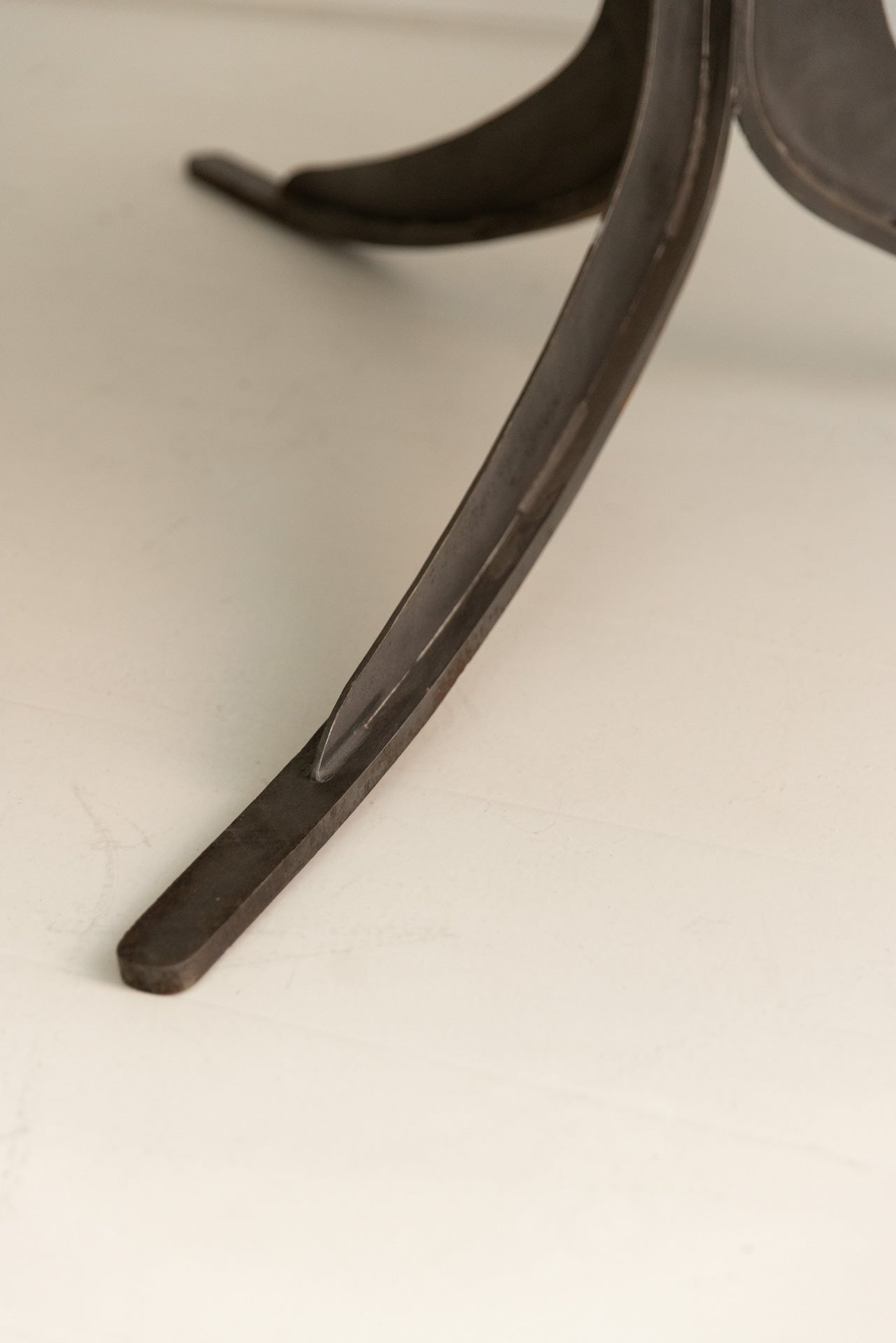 Mesa de comedor francesa de los años 70, compuesta por un sobre de mármol blanco y una base de forja artesanal.