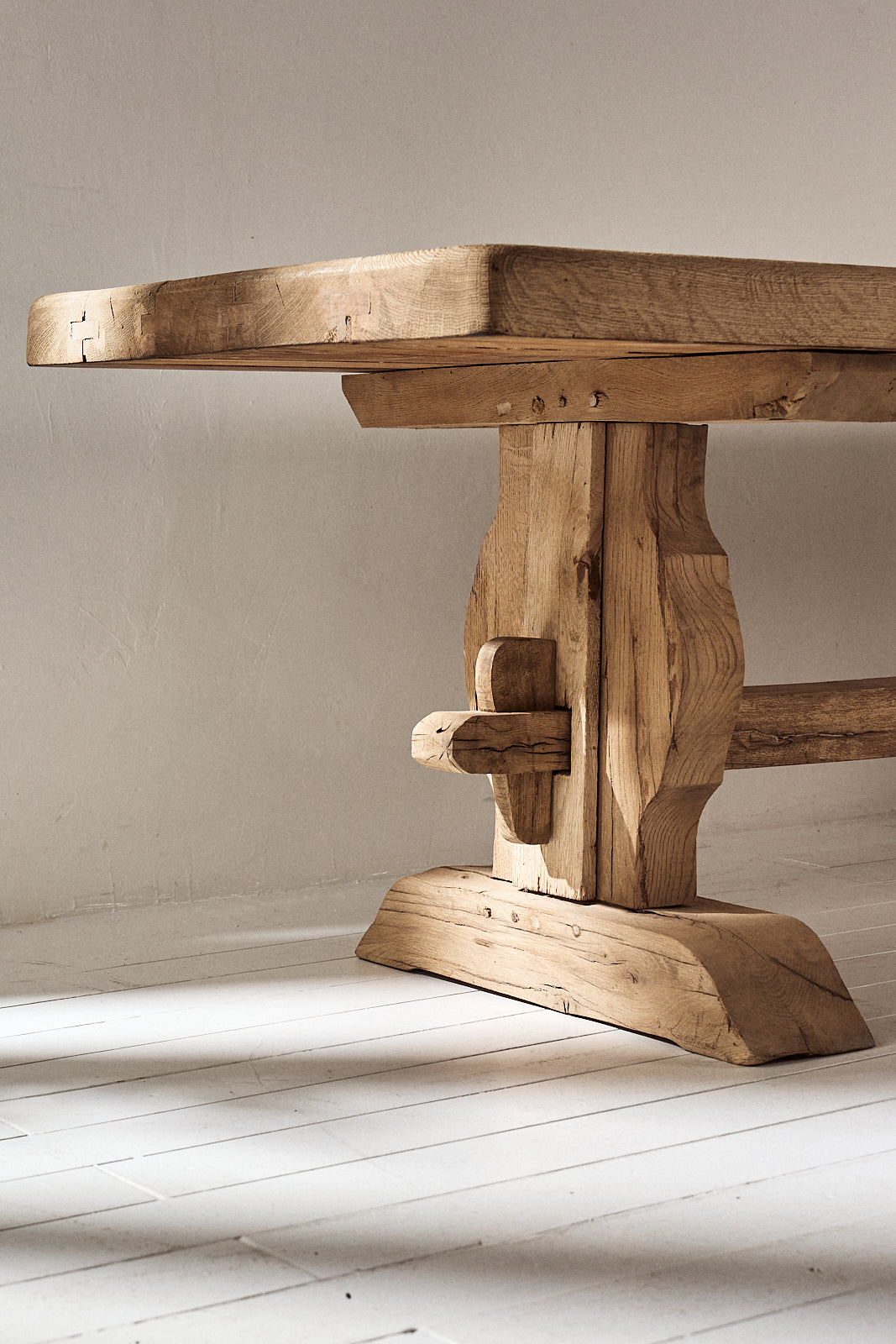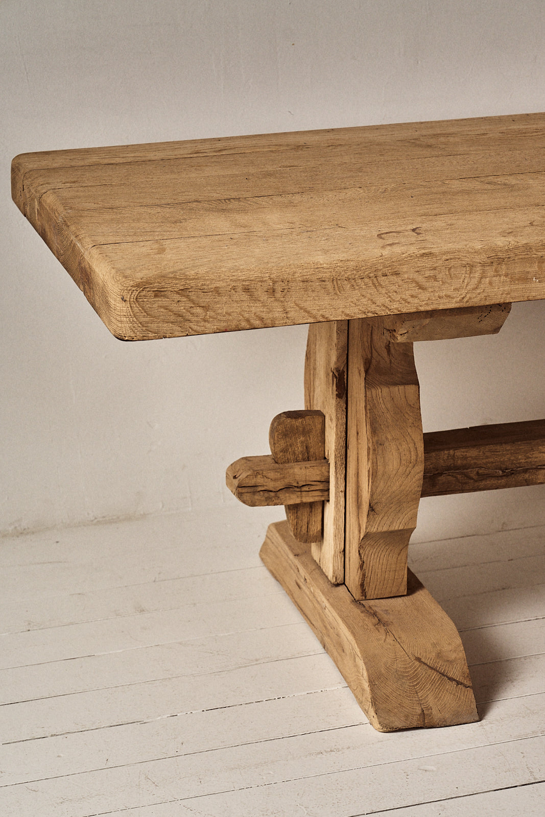 Mesa de comedor en madera maciza de roble, con pata en forma de travesaño.