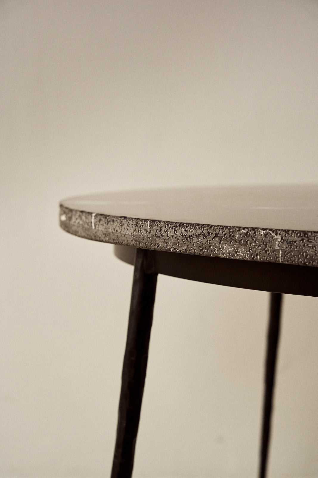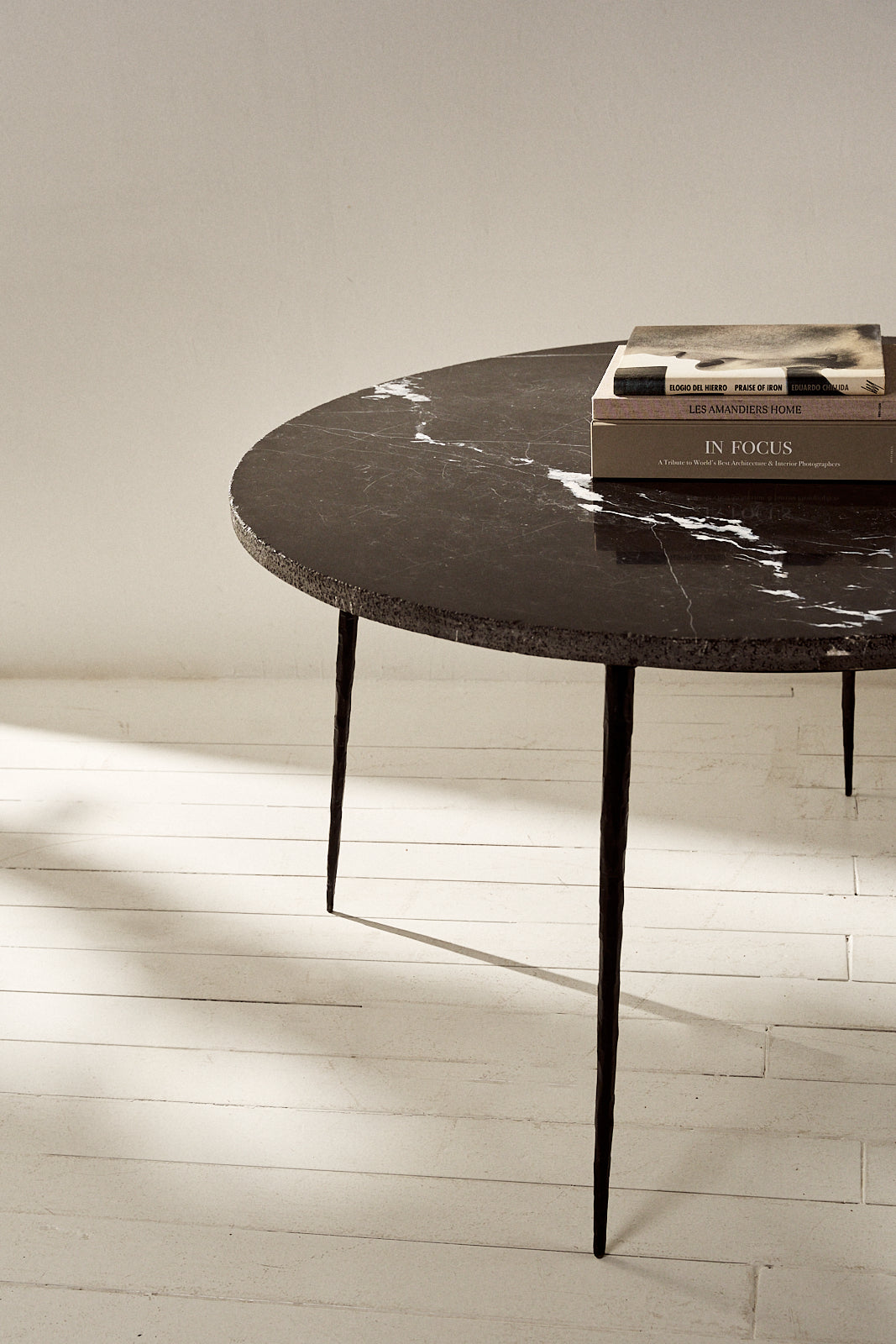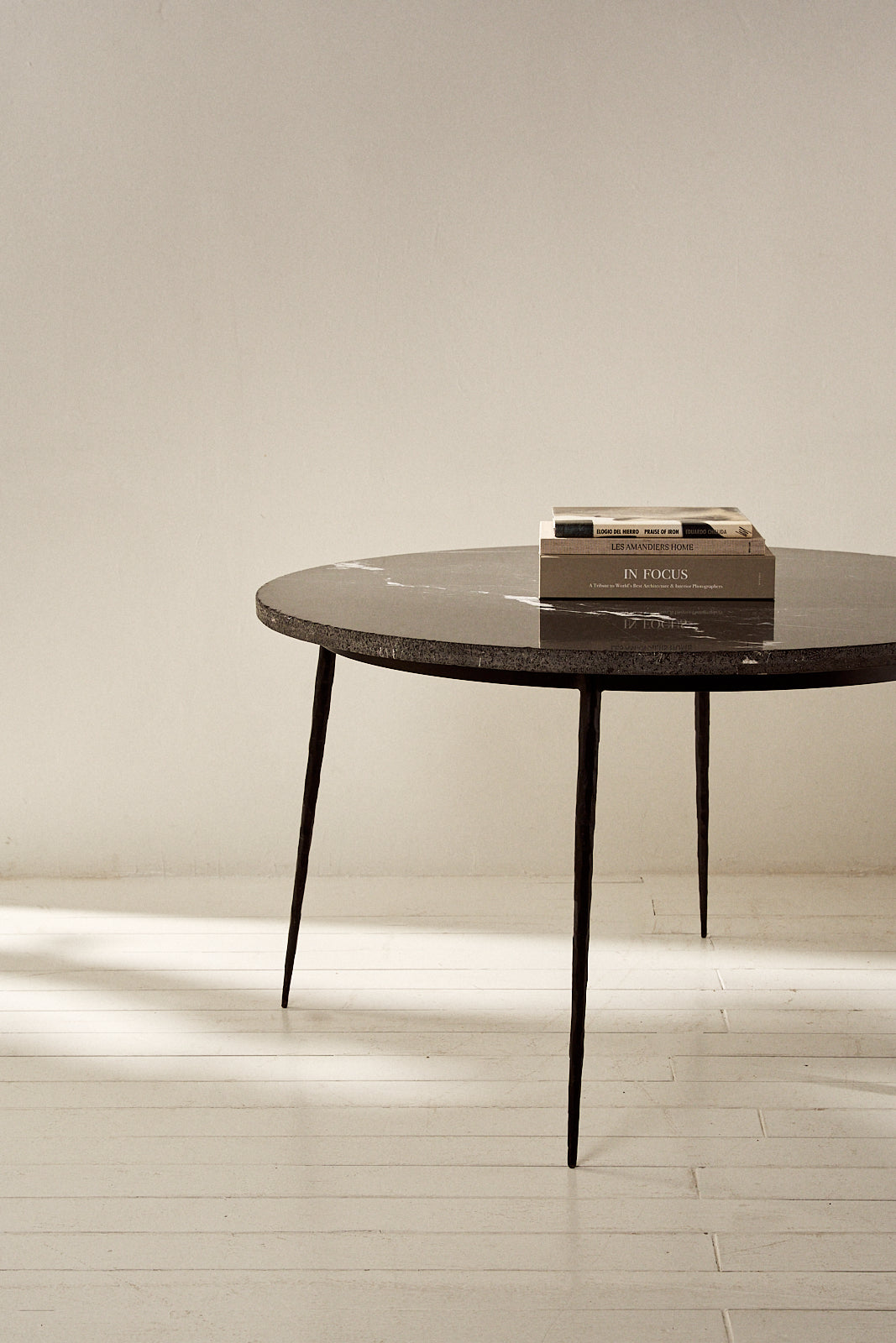 La estructura metálica, acabada en negro martelé, aporta textura y solidez, complementando la pureza del mármol con un carácter contemporáneo.