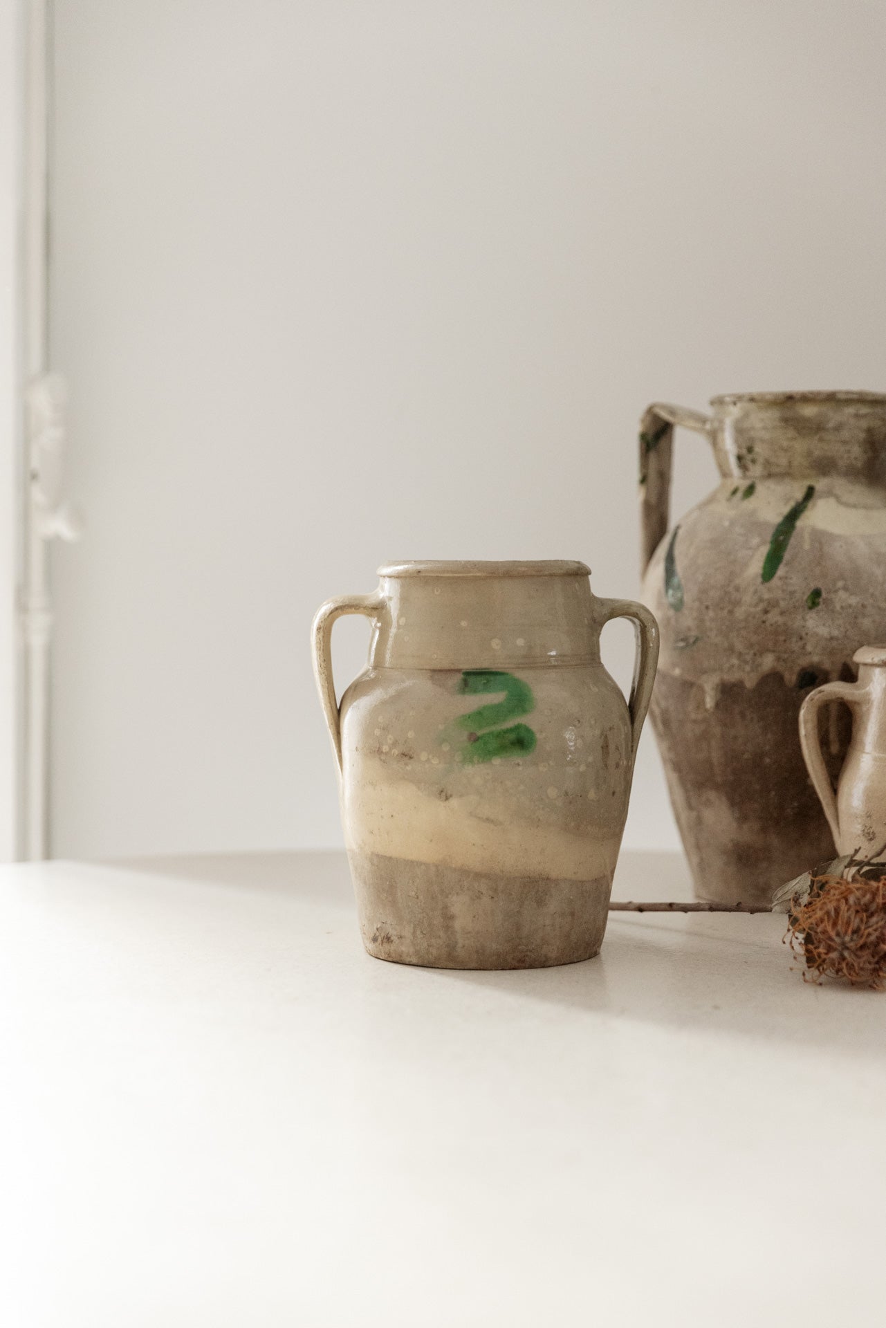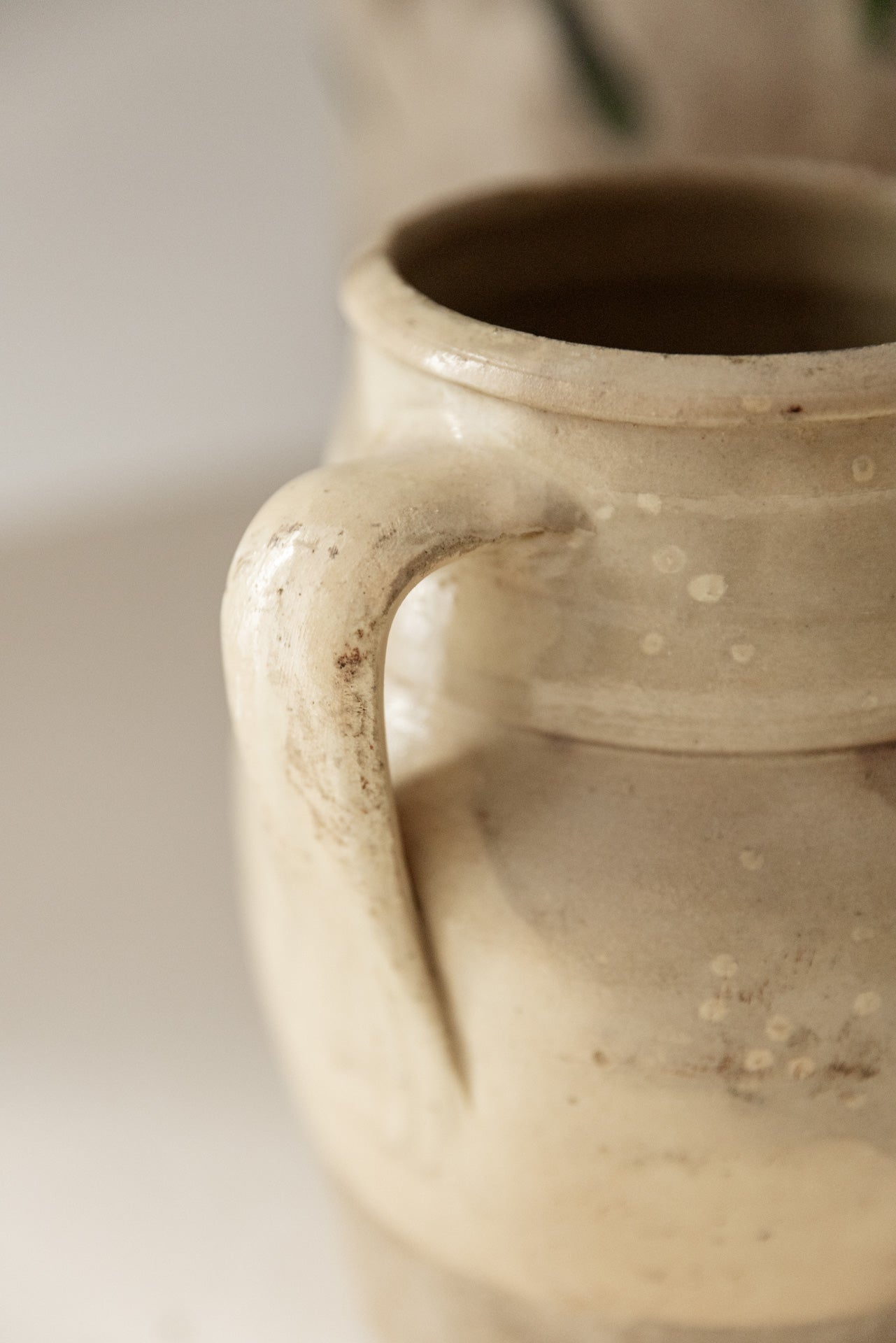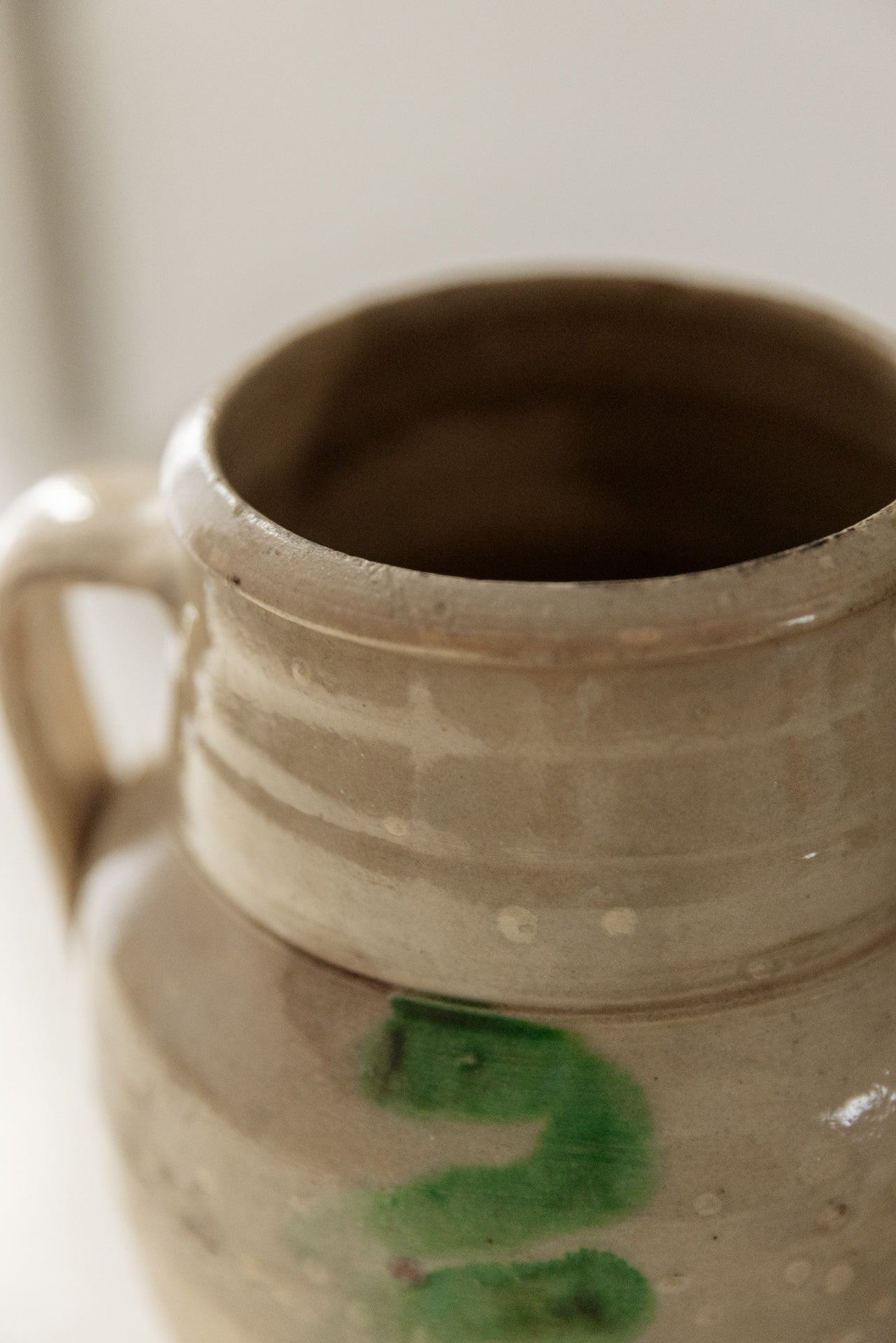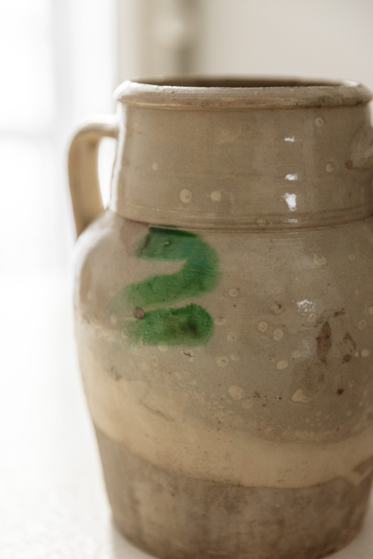 Orza elaborada en cerámica vidriada, con un acabado en tono crema y aplicaciones verdes que reflejan las técnicas decorativas tradicionales del siglo XIX. El vidriado, aplicado tras la cocción, protege la superficie y aporta un brillo característico que resalta las variaciones de color y textura.