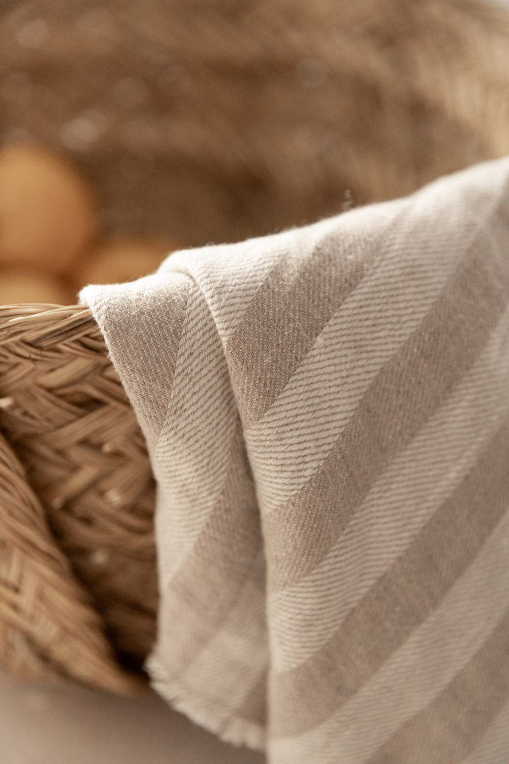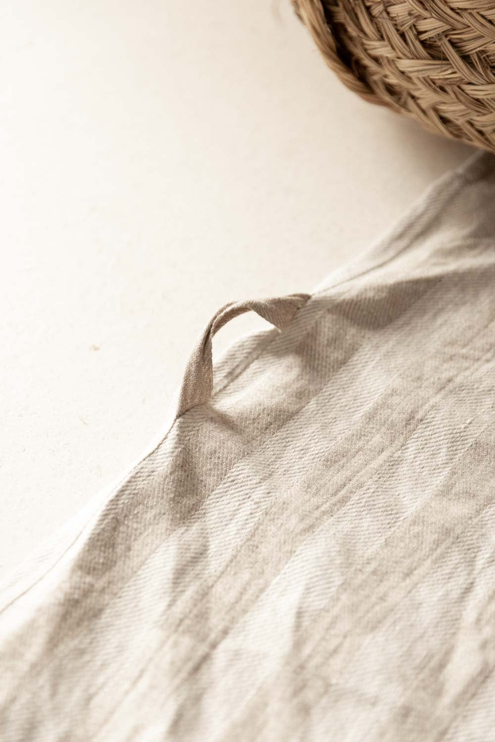 Paño de cocina confeccionado en 100% lino lavado europeo con diseño de líneas sobre fondo natural. Hecho artesanalmente en España y con certificación OEKO-TEX Standard 100, garantiza un proceso textil respetuoso y seguro.