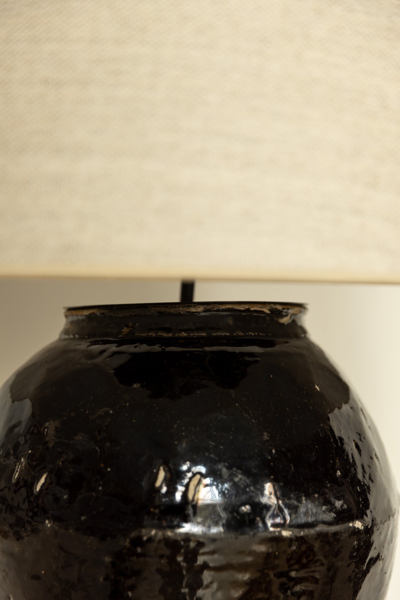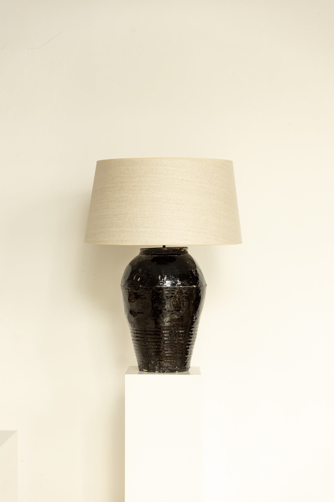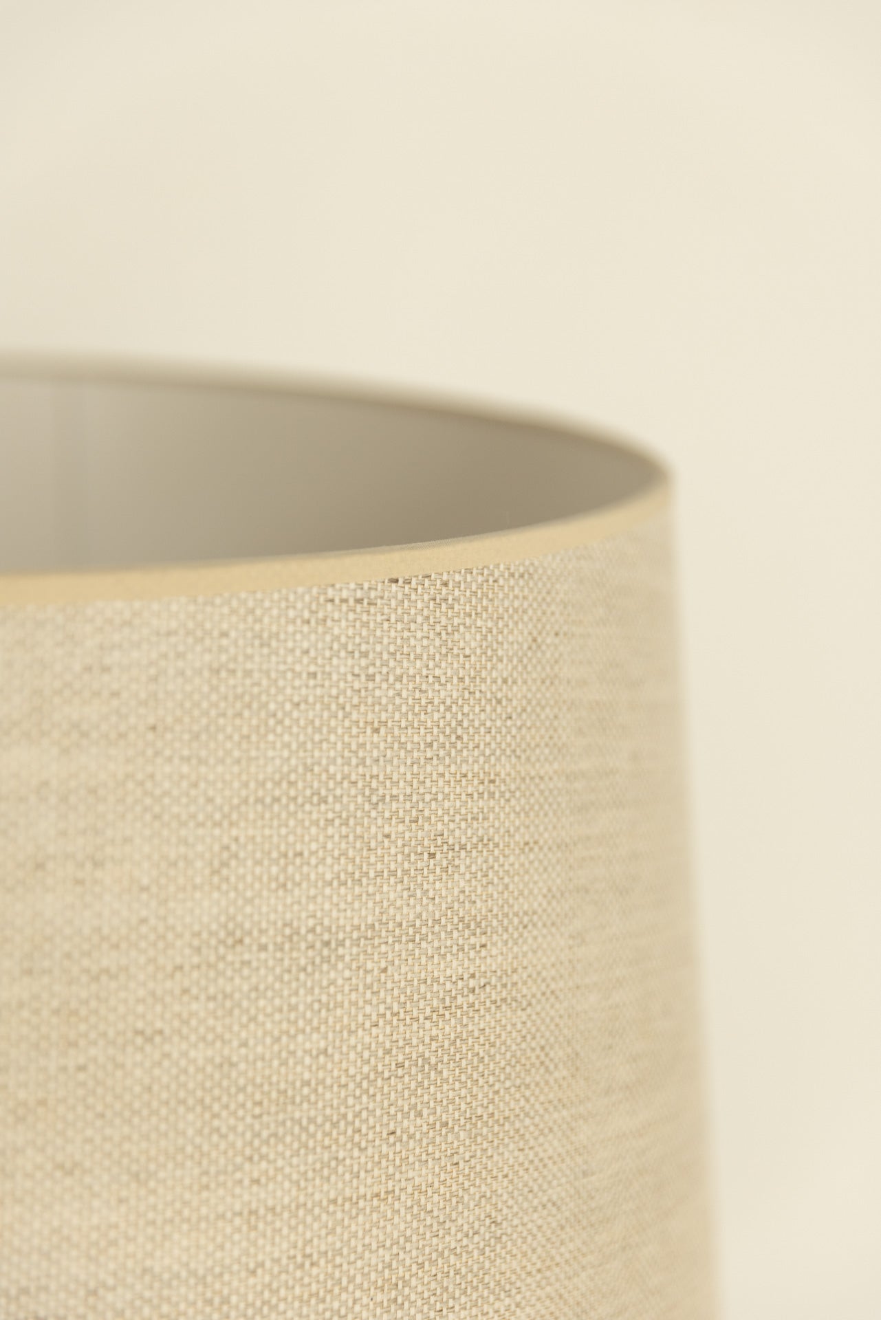 Pantalla cilíndrica diseñada en lino natural, con un interior blanco.