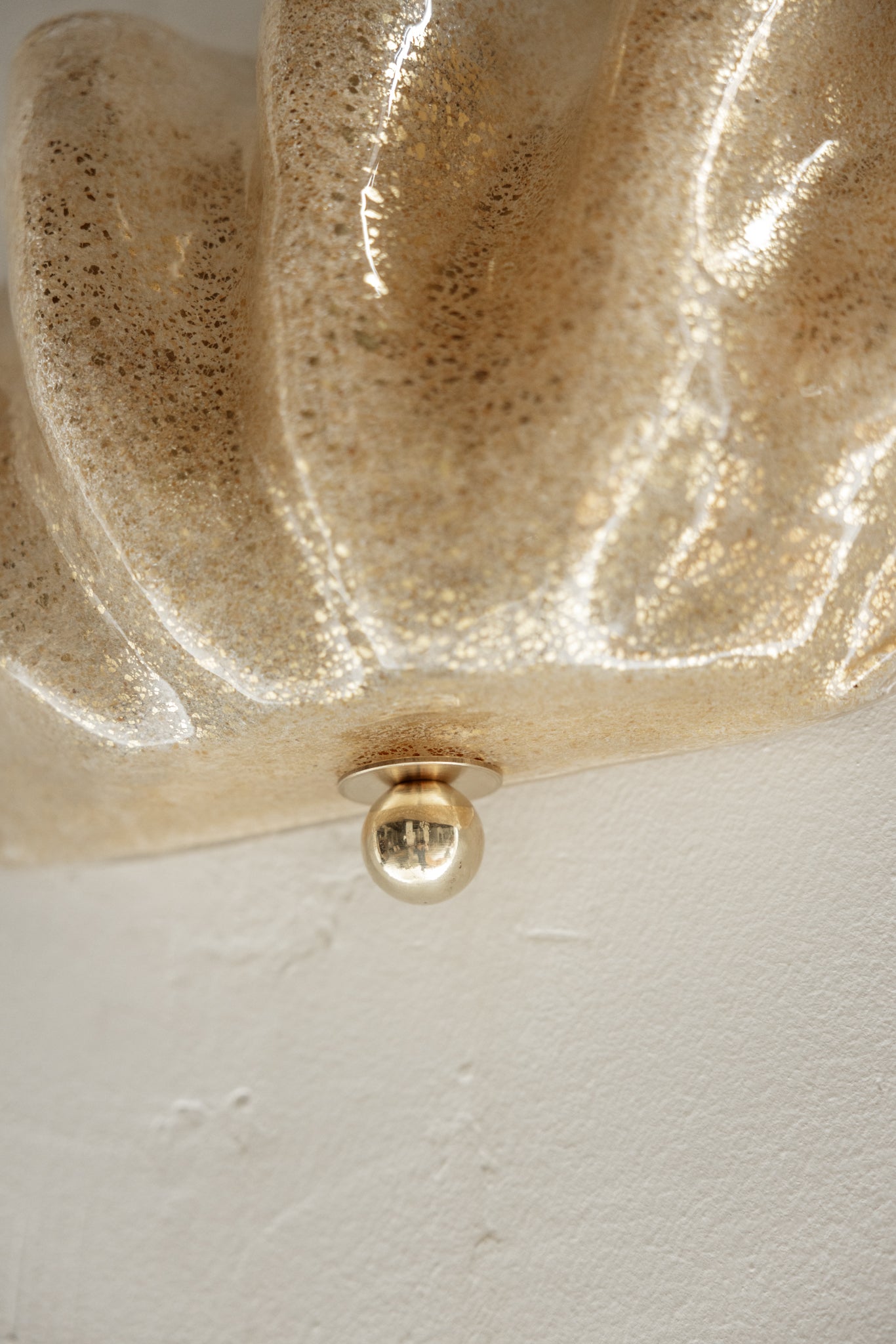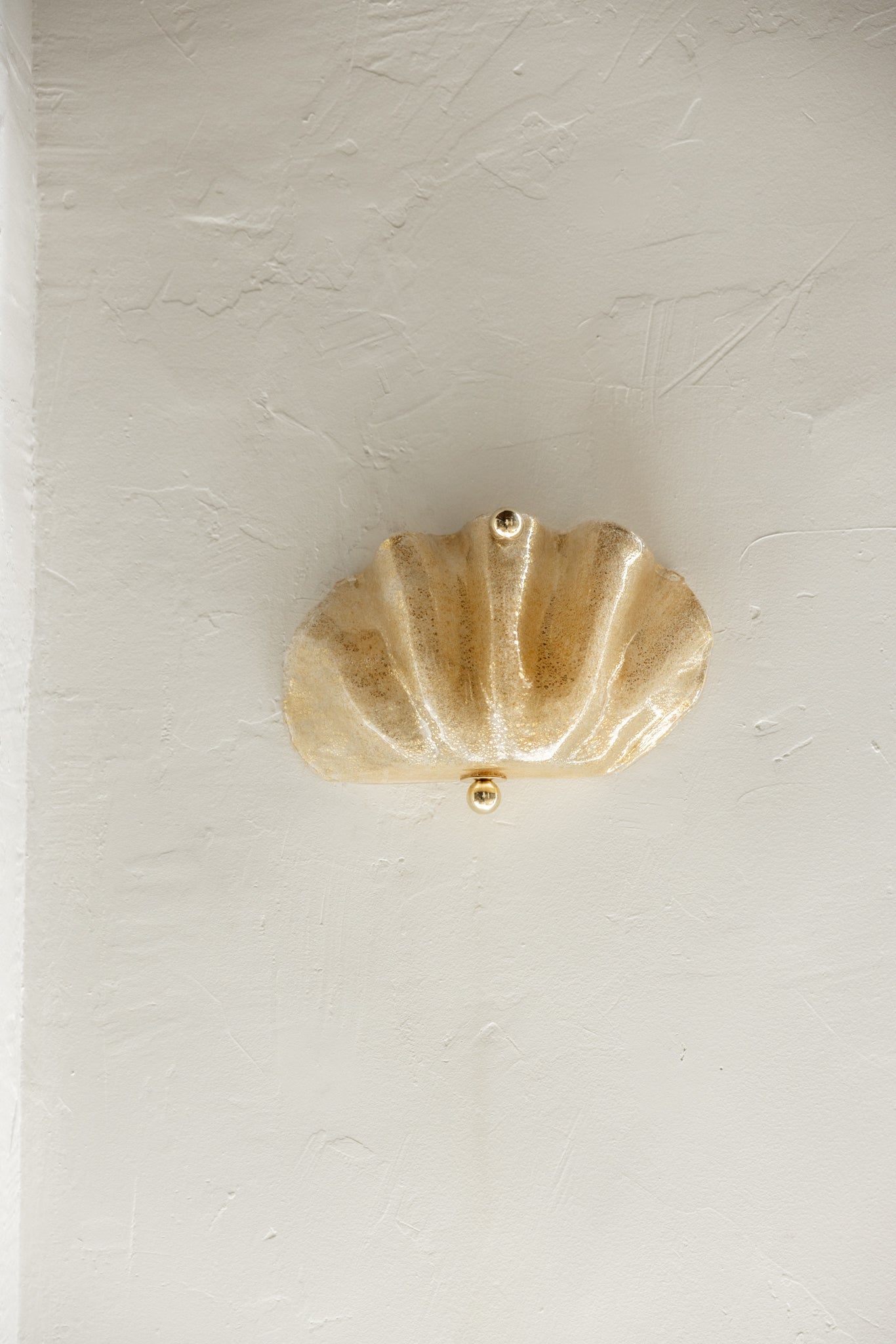 Pareja de apliques de origen italiano, elaborados en vidrio de Murano dorado con forma de concha. La pieza refleja la tradición artesanal veneciana, donde cada curva y relieve del vidrio ha sido trabajado a mano para capturar la luz y crear reflejos cálidos y sofisticados.