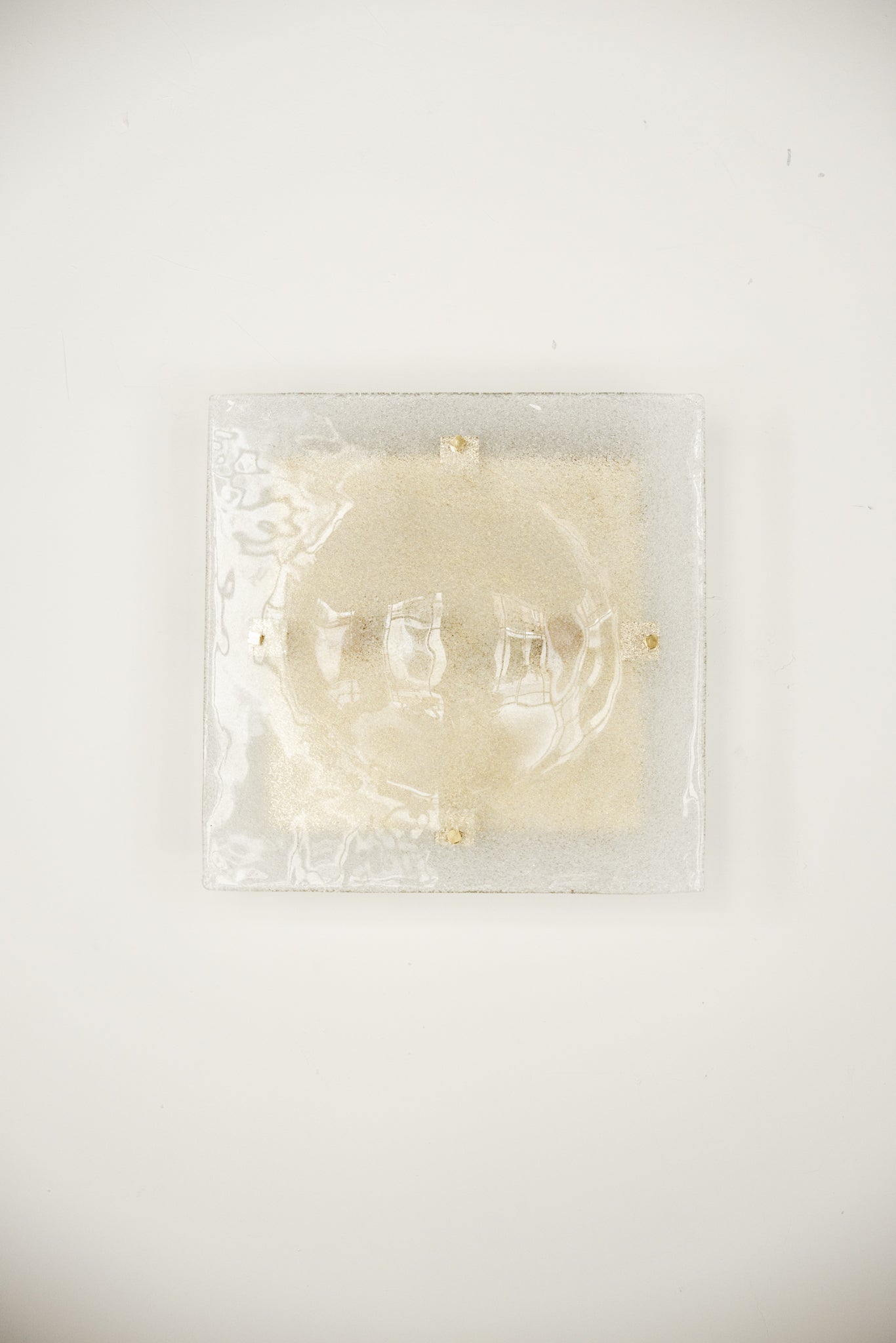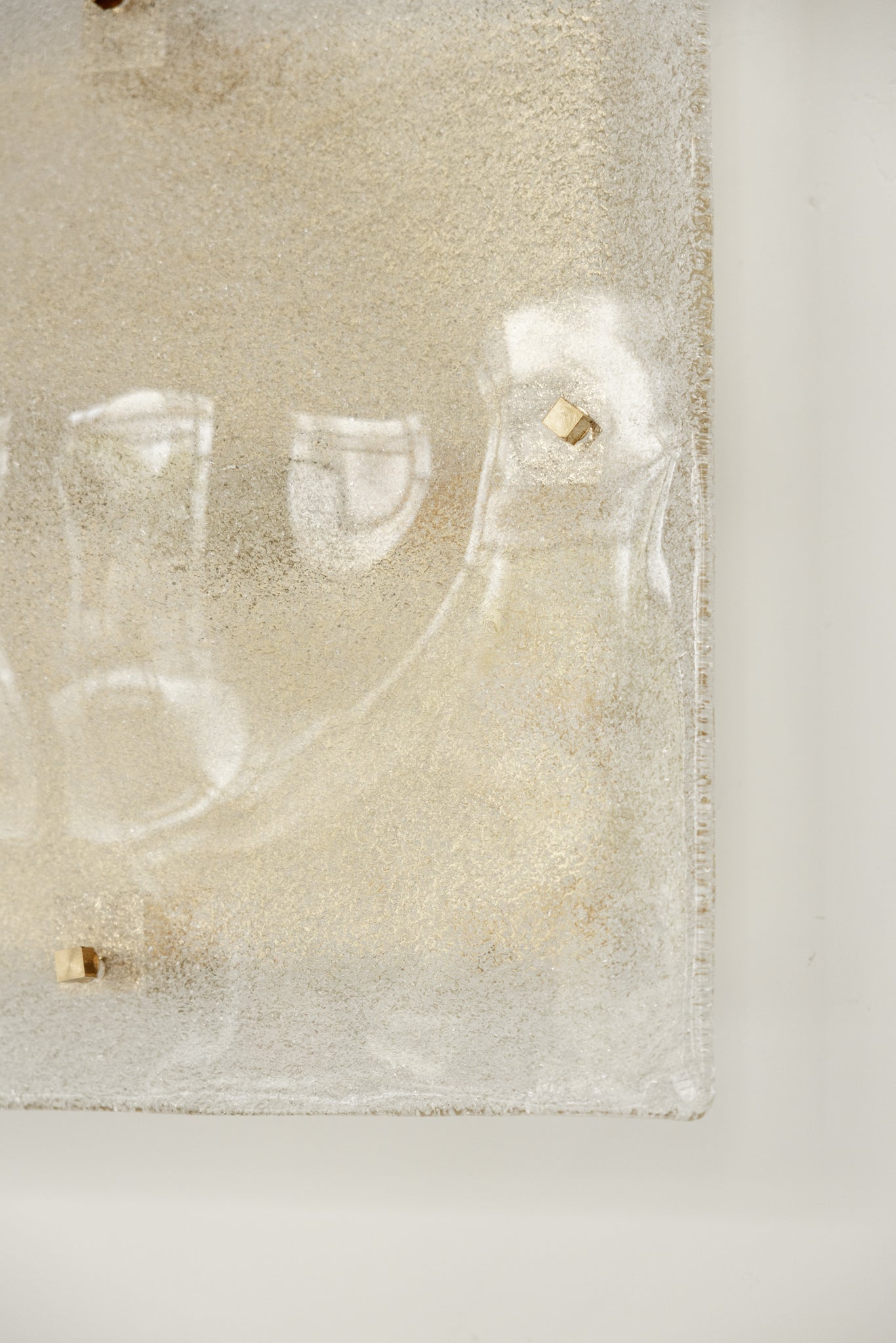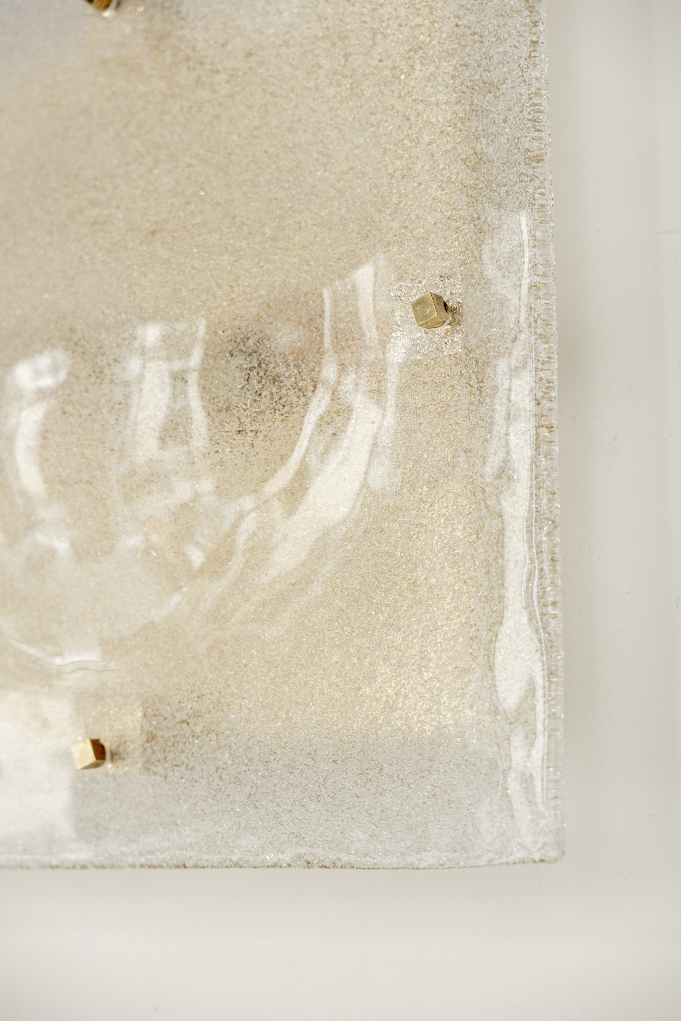 Pareja de apliques de origen italiano, de forma cuadrada XL, elaborados en vidrio texturizado que difunde la luz de manera suave y envolvente. La textura del vidrio aporta dinamismo visual, creando reflejos y matices únicos.