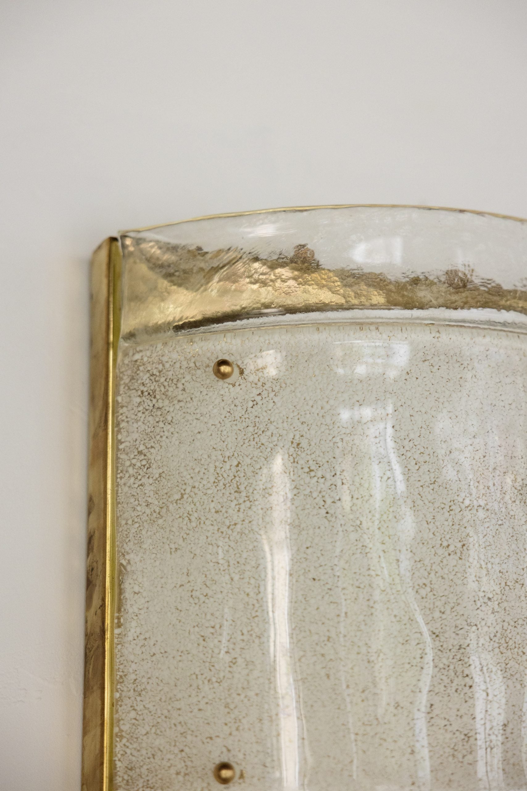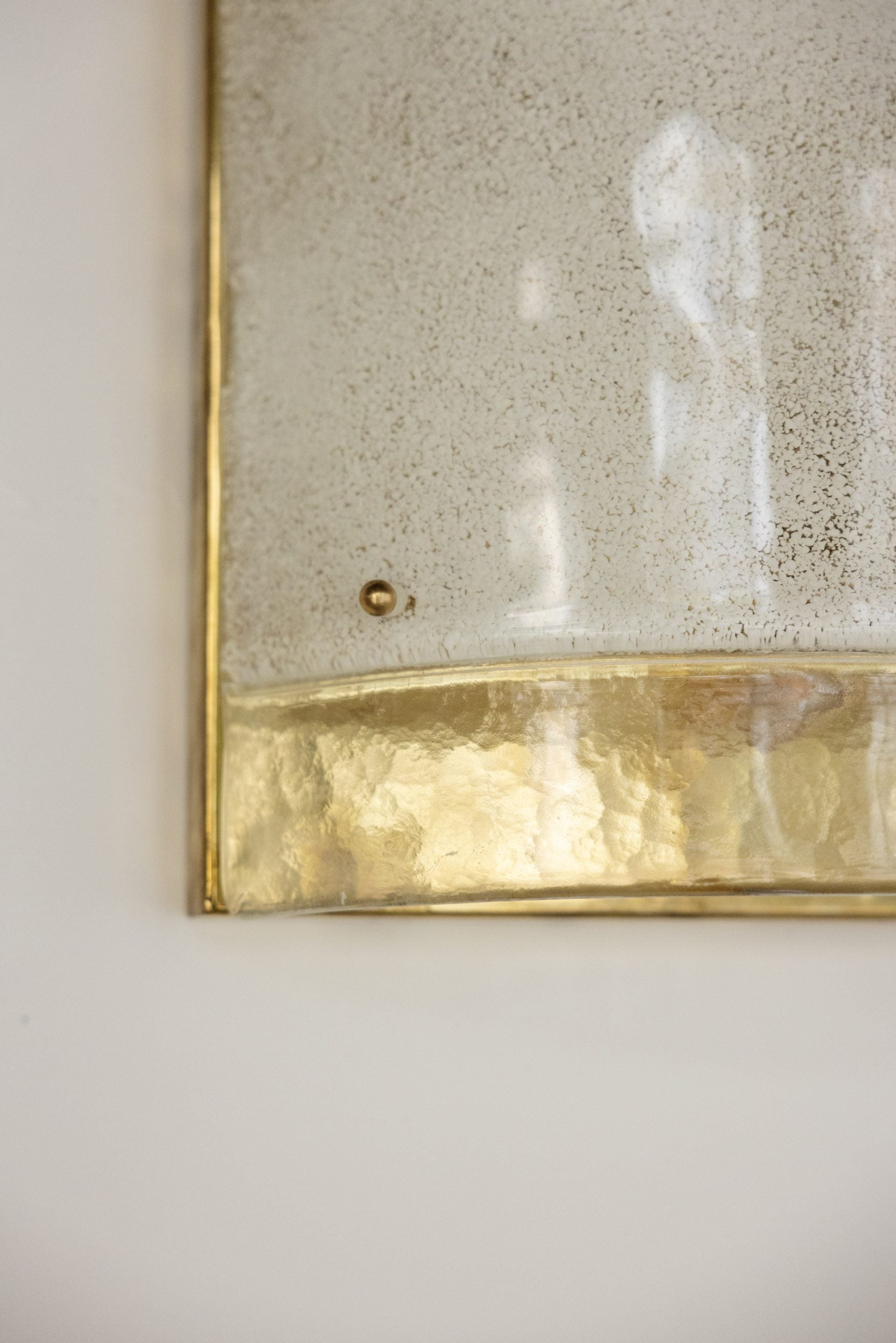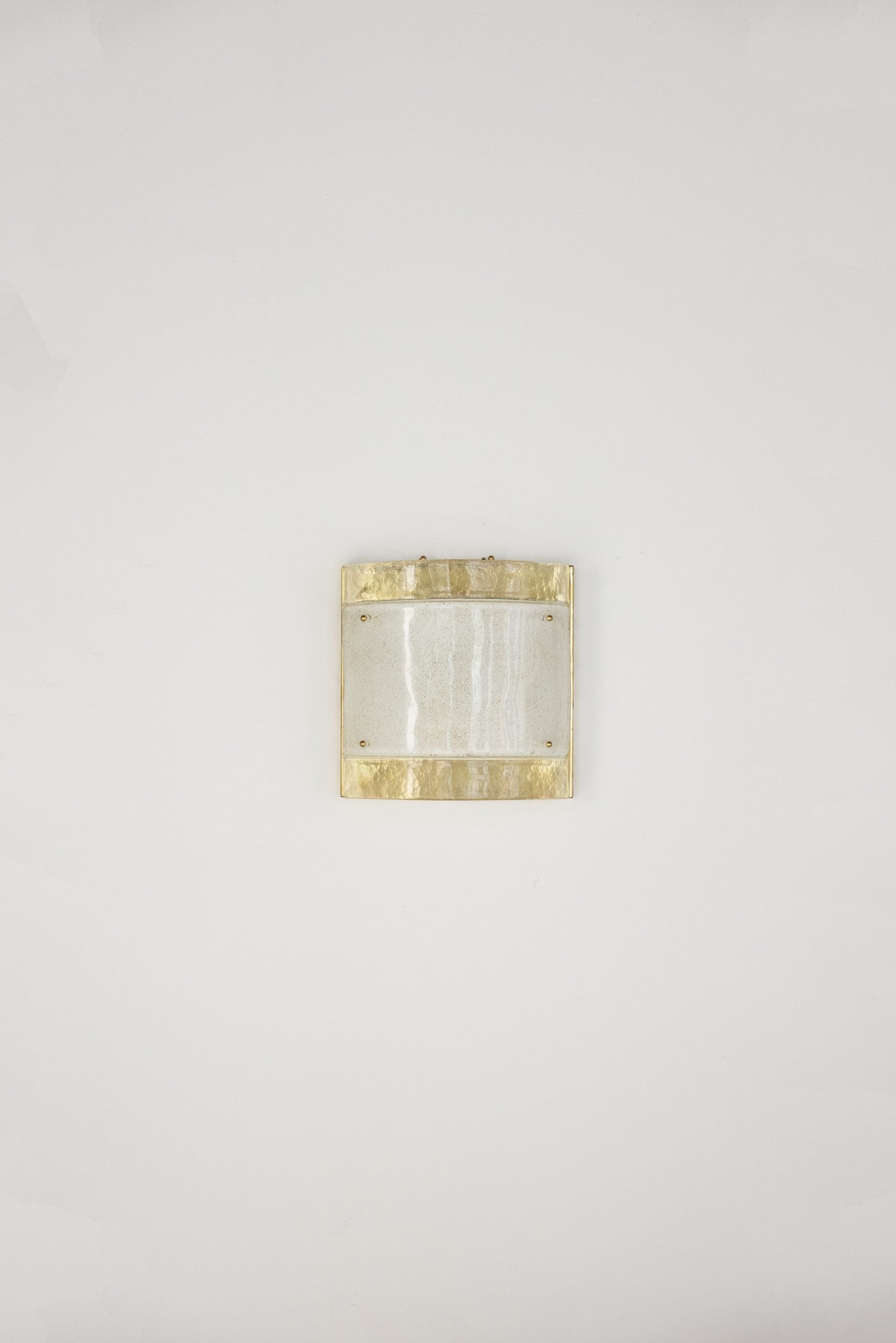 Pareja de apliques de vidrio esmaltado blanco y estructura de latón con forma de media luna. La geometría simple y el acabado delicado del vidrio resaltan la presencia escultórica.