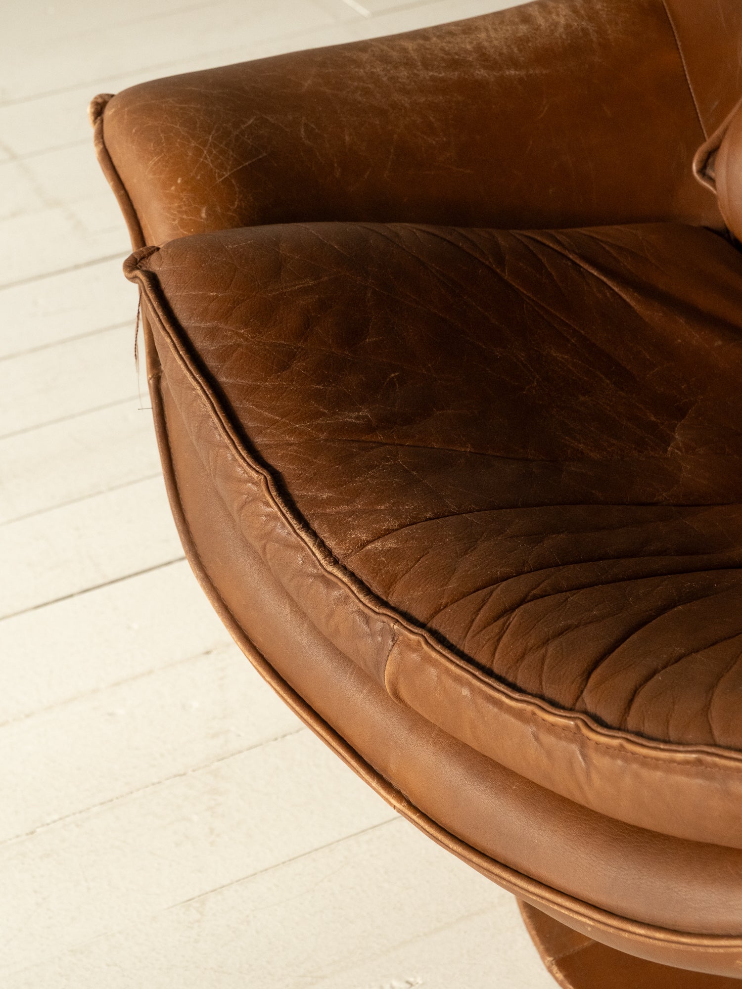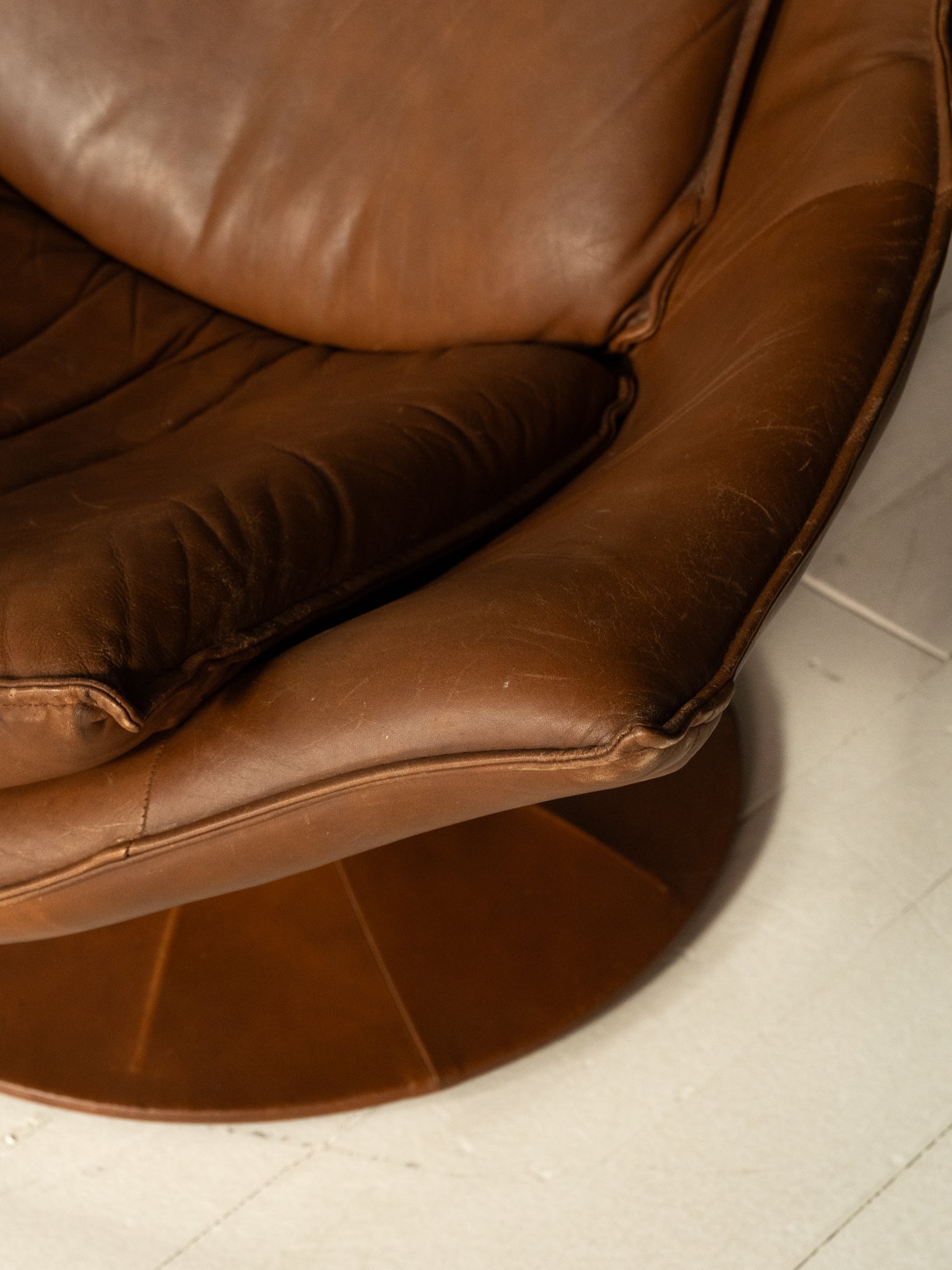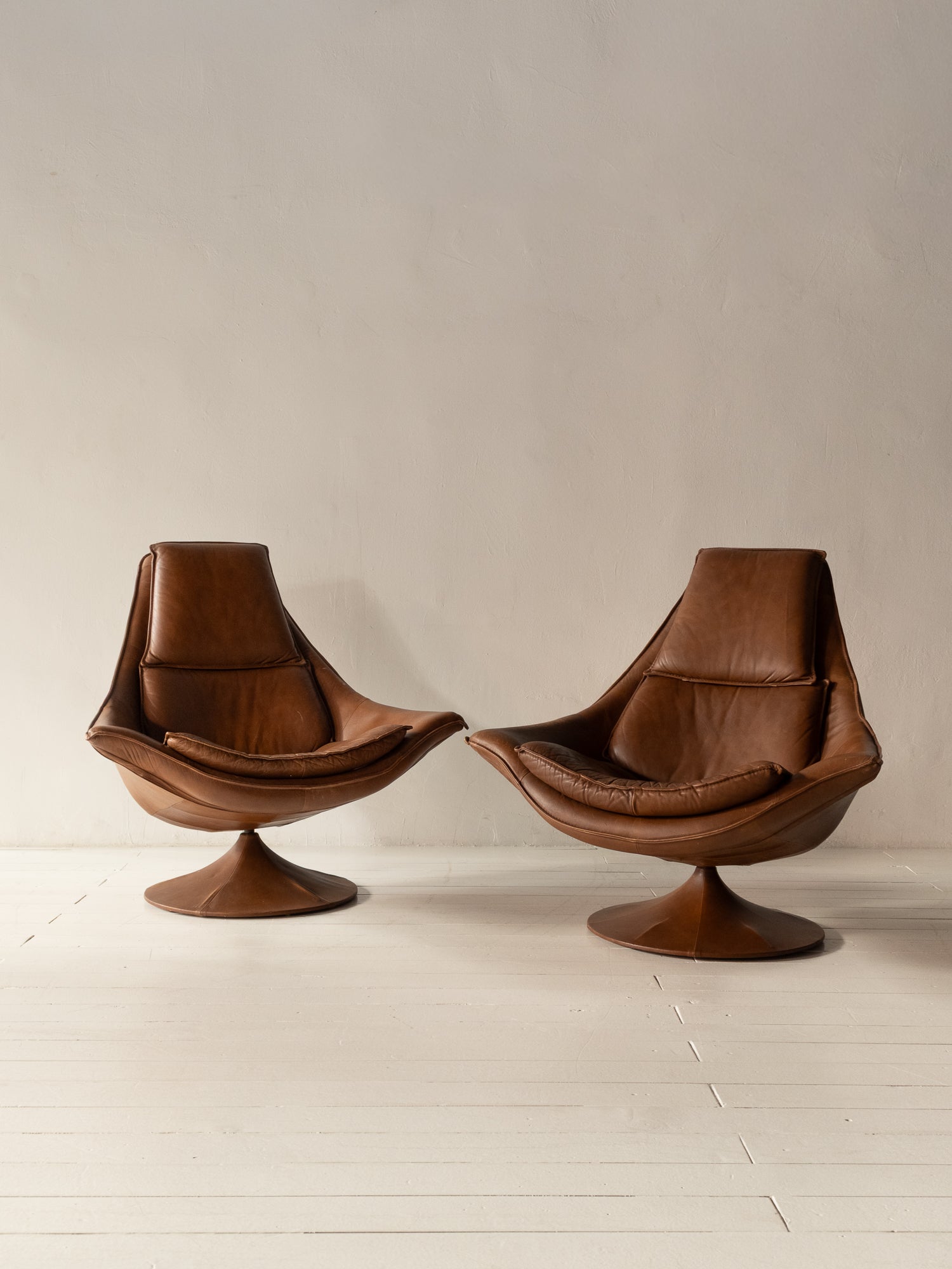 Pareja de butacas suecas originales de los años 70, pertenecientes al periodo de influencia futurista que marcó el diseño de la época. Están tapizadas en cuero original, que conserva una pátina natural fruto del uso y del paso del tiempo.
