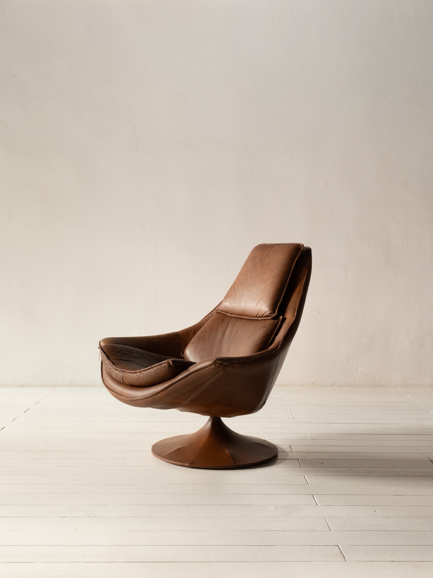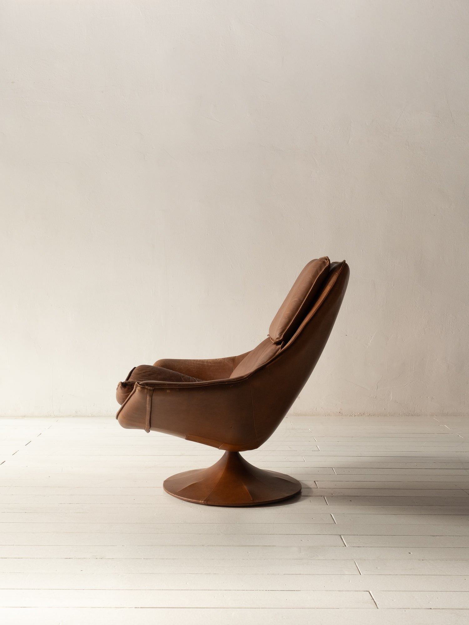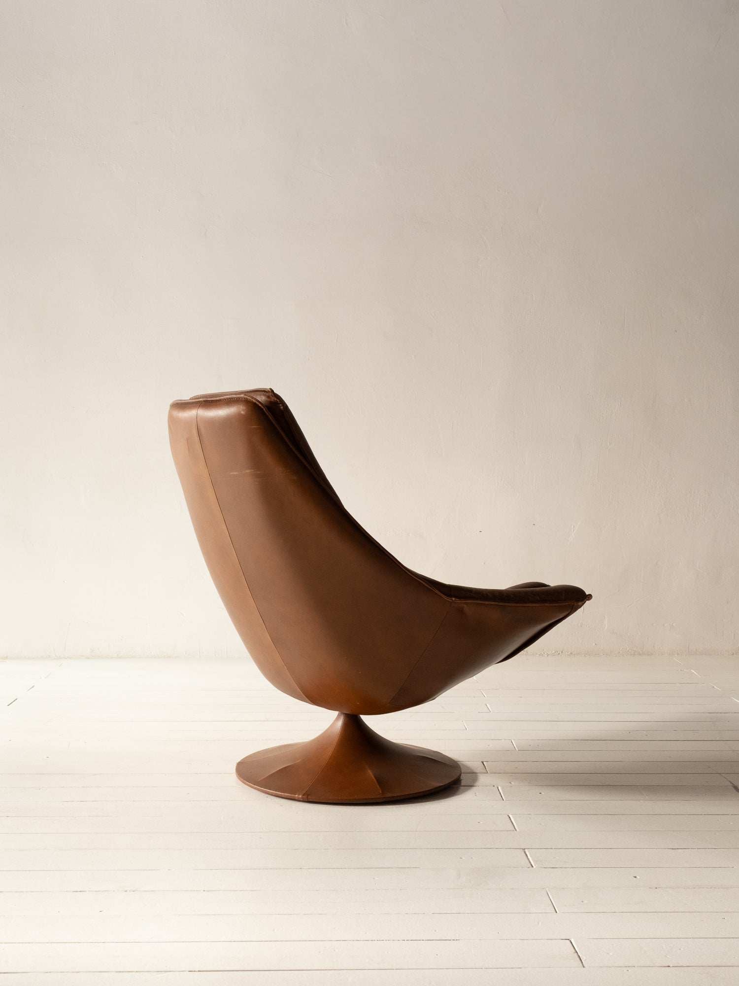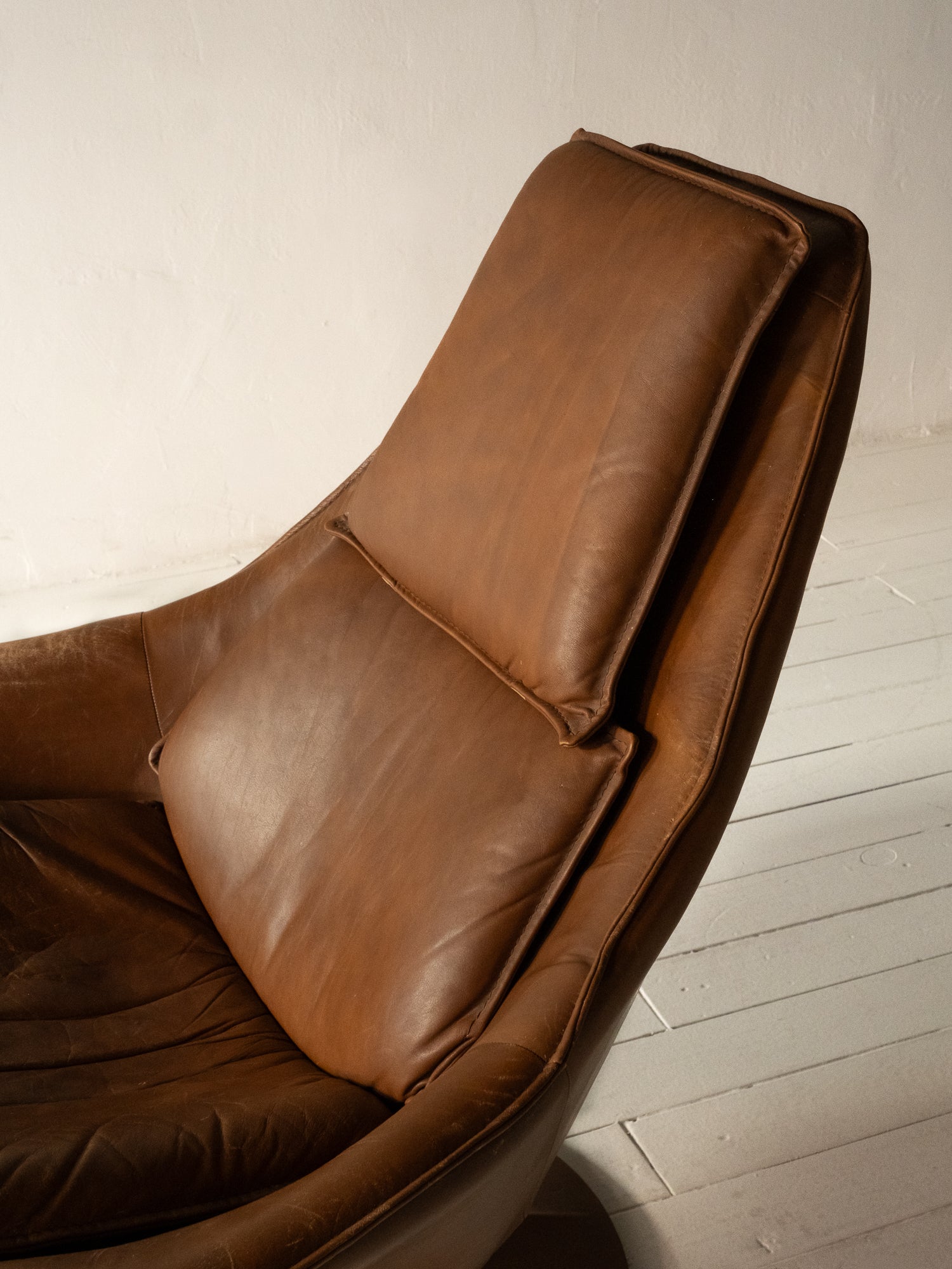 Pareja de butacas suecas originales de los años 70, pertenecientes al periodo de influencia futurista que marcó el diseño de la época. Están tapizadas en cuero original, que conserva una pátina natural fruto del uso y del paso del tiempo.