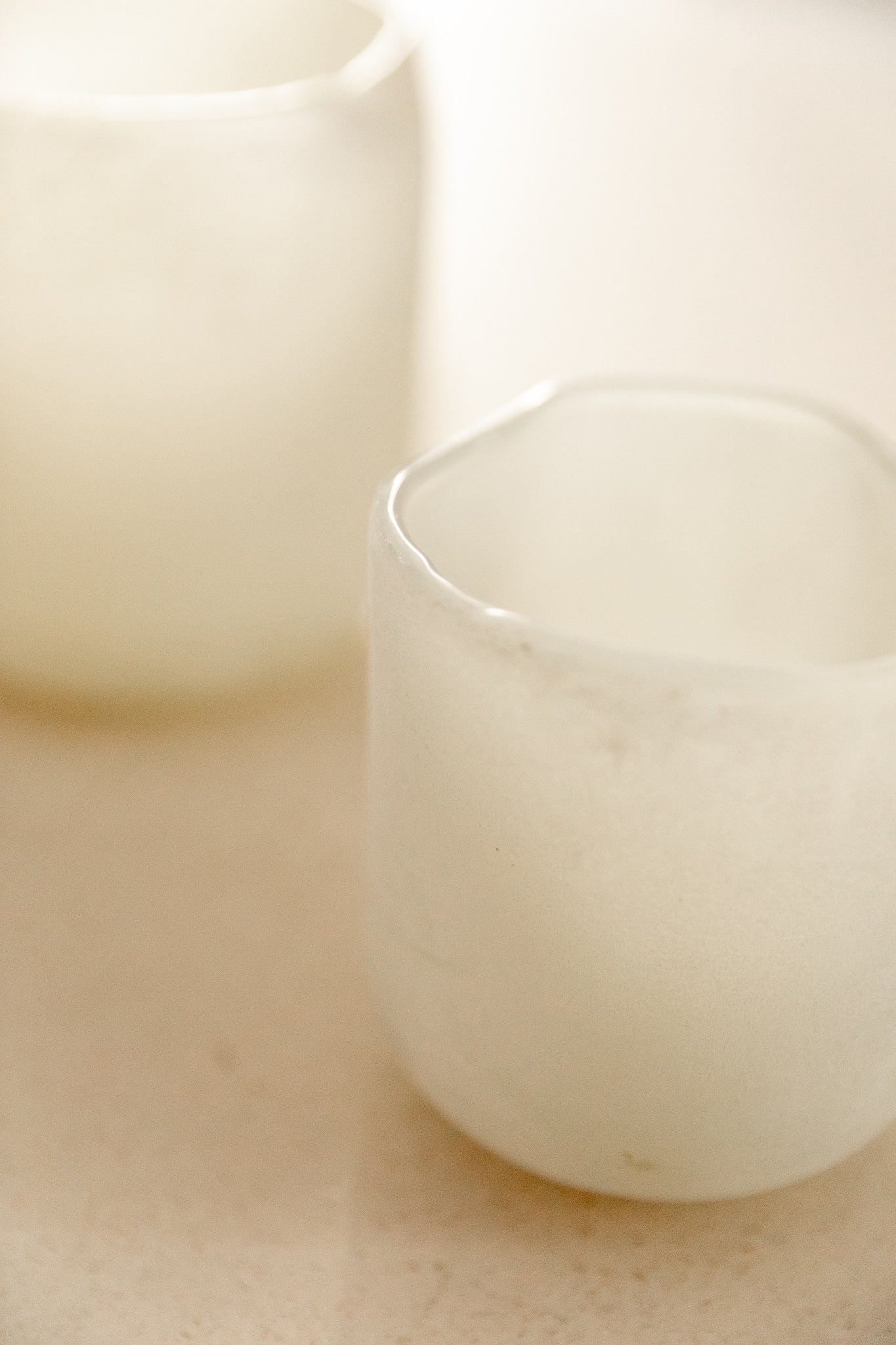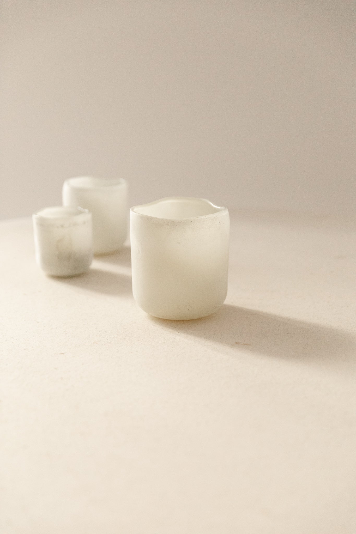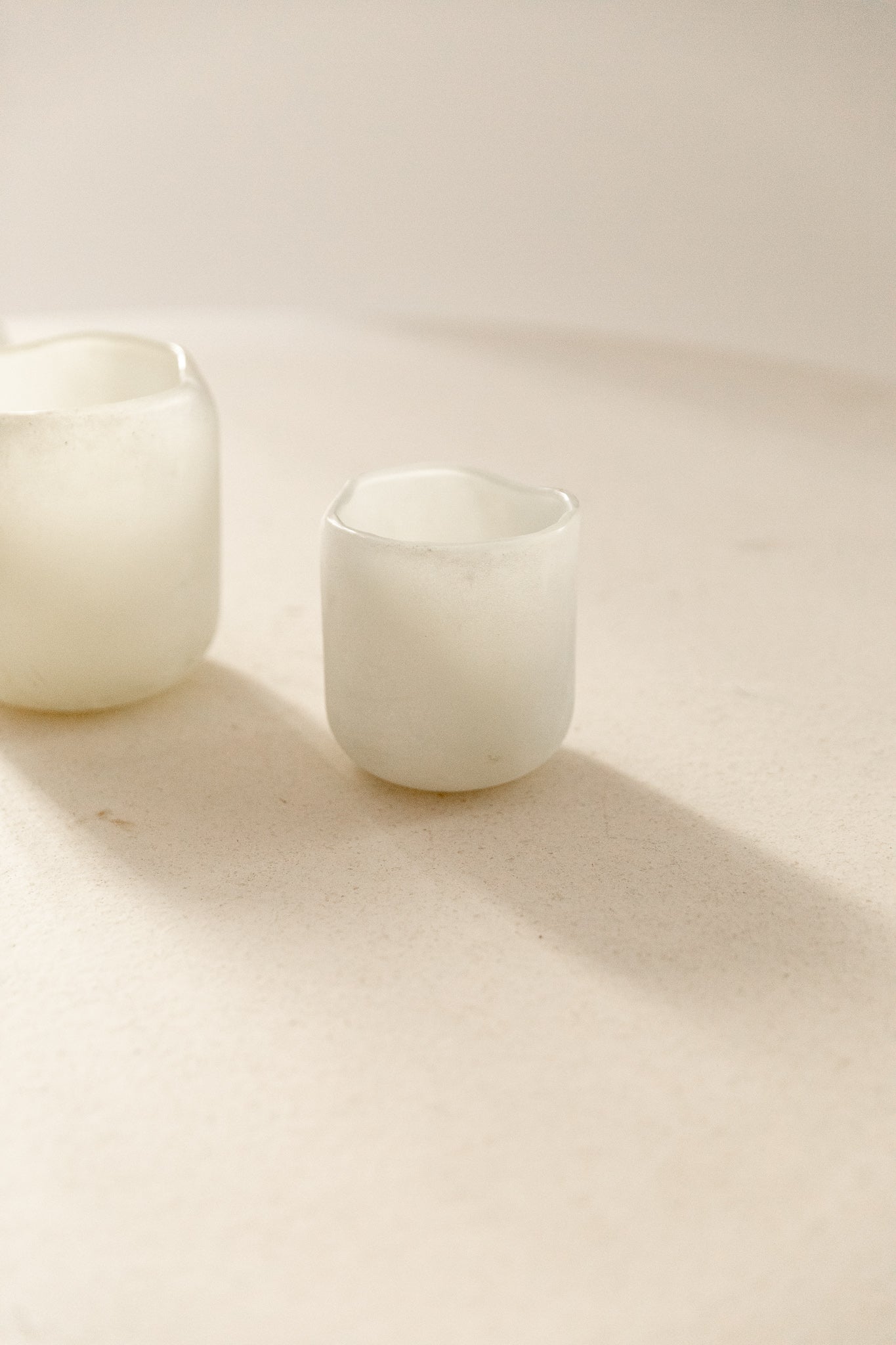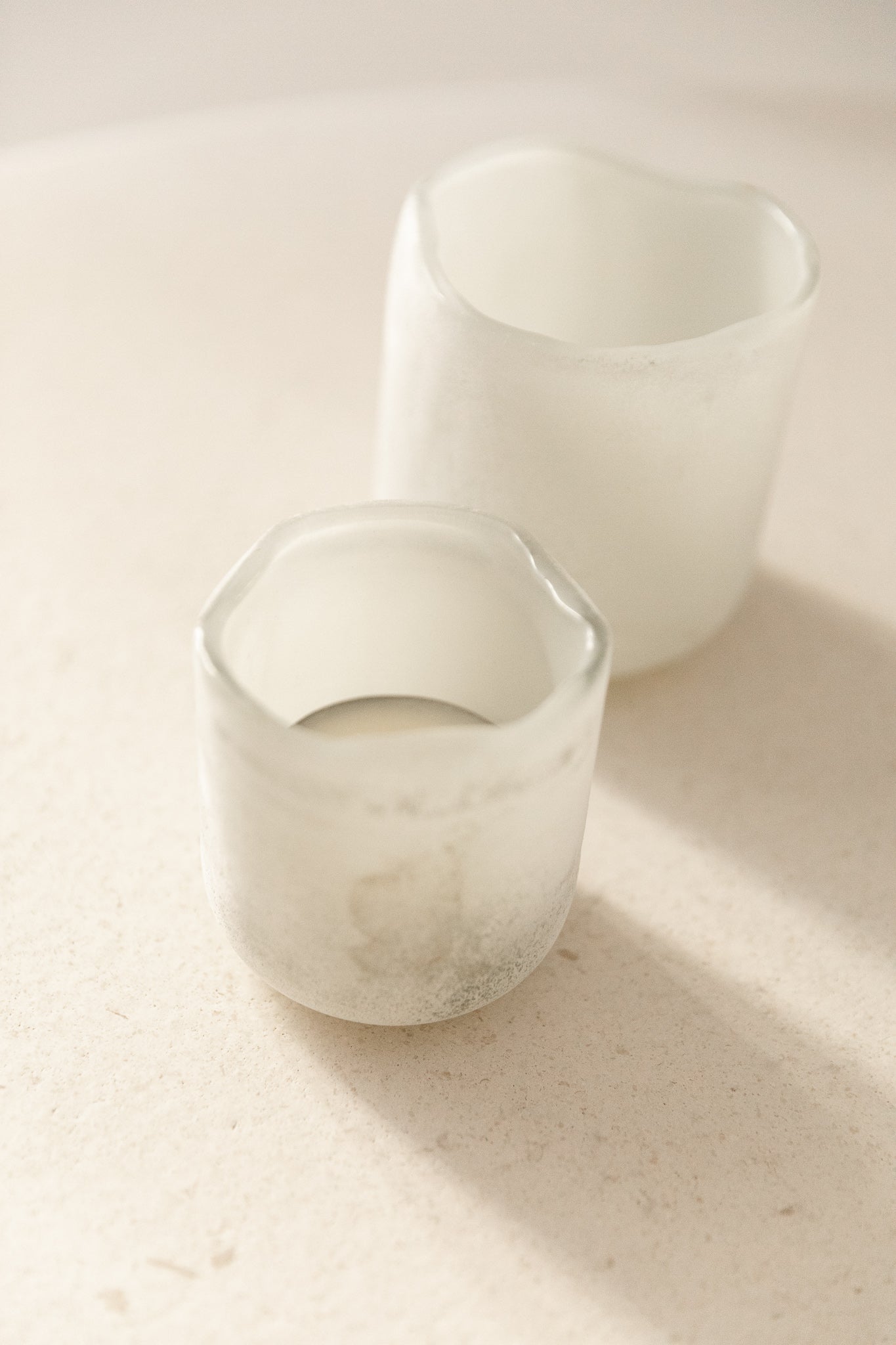 Portavelas artesanal de vidrio esmerilado blanco, disponible en varios tamaños. Su acabado mate difuso permite una iluminación suave, ideal para rincones que buscan luz ambiental.