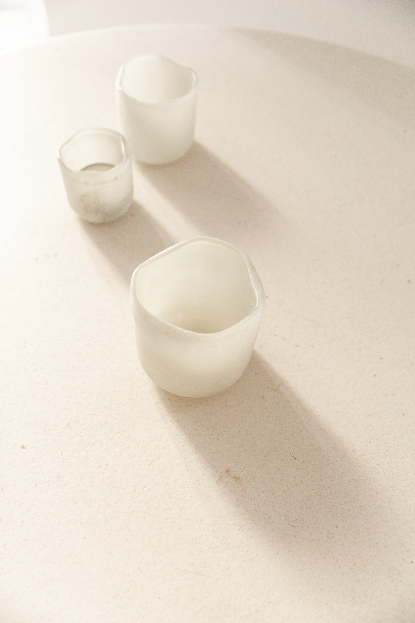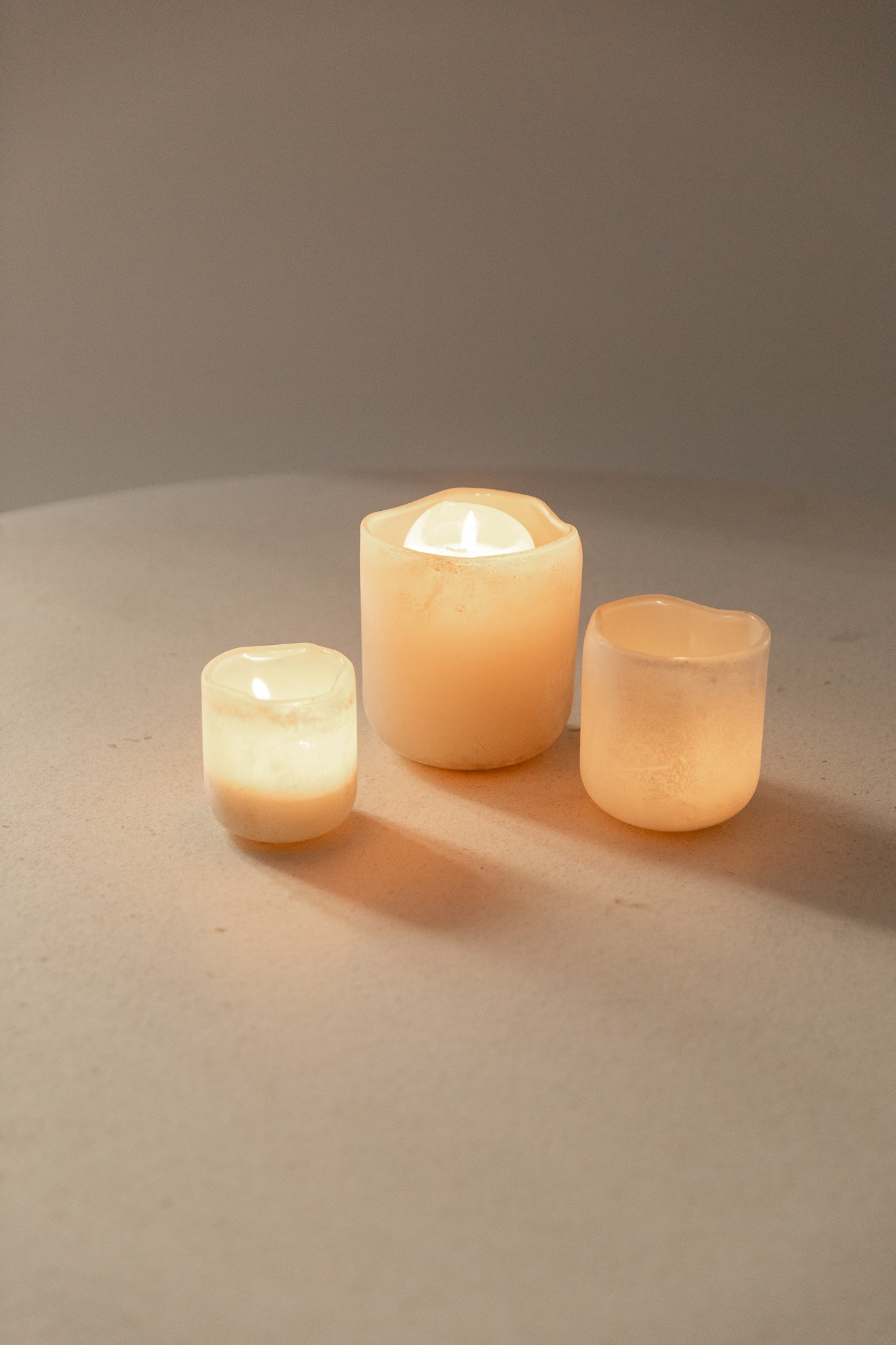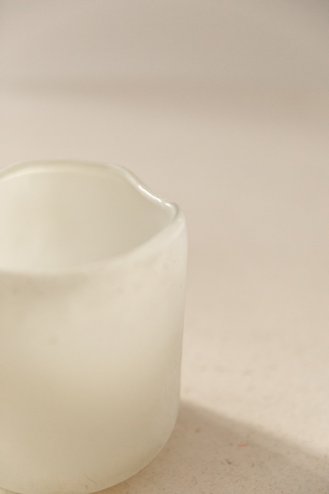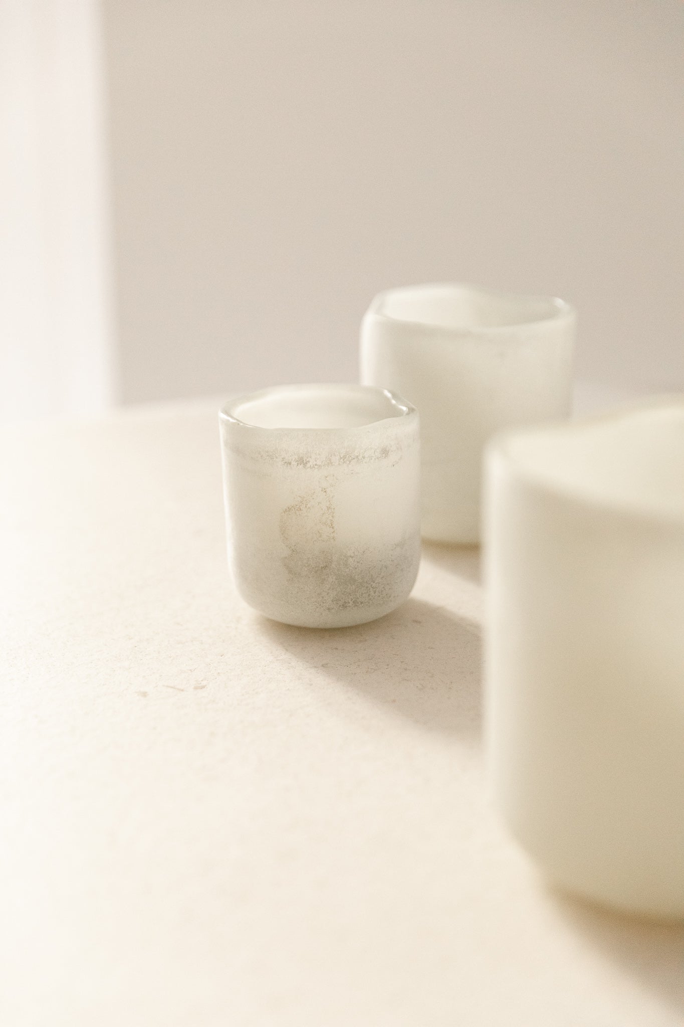 Portavelas artesanal de vidrio esmerilado blanco, disponible en varios tamaños. Su acabado mate difuso permite una iluminación suave, ideal para rincones que buscan luz ambiental.