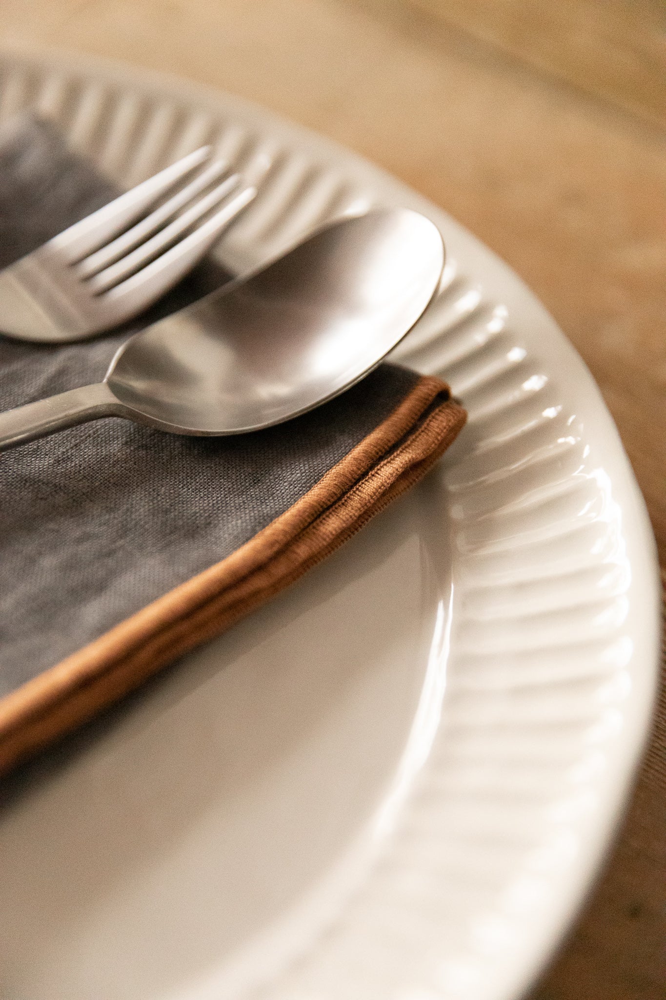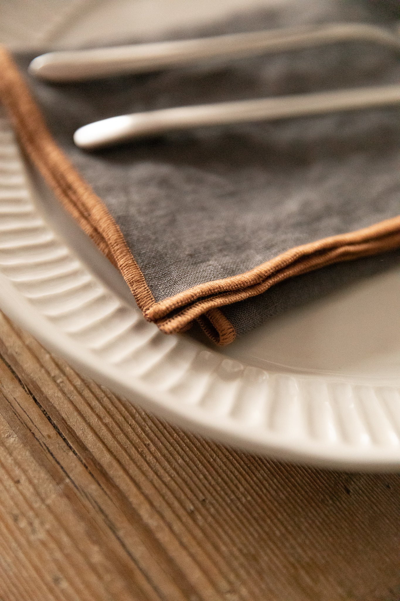 Servilleta elaborada artesanalmente en España con lino 100% natural de color gris y un delicado repulgo en tono teja. Nuestro lino cuenta con la certificación OEKO-TEX® Standard 100 (certificado nº 2021OK068), que garantiza un proceso textil respetuoso con las personas y el entorno.