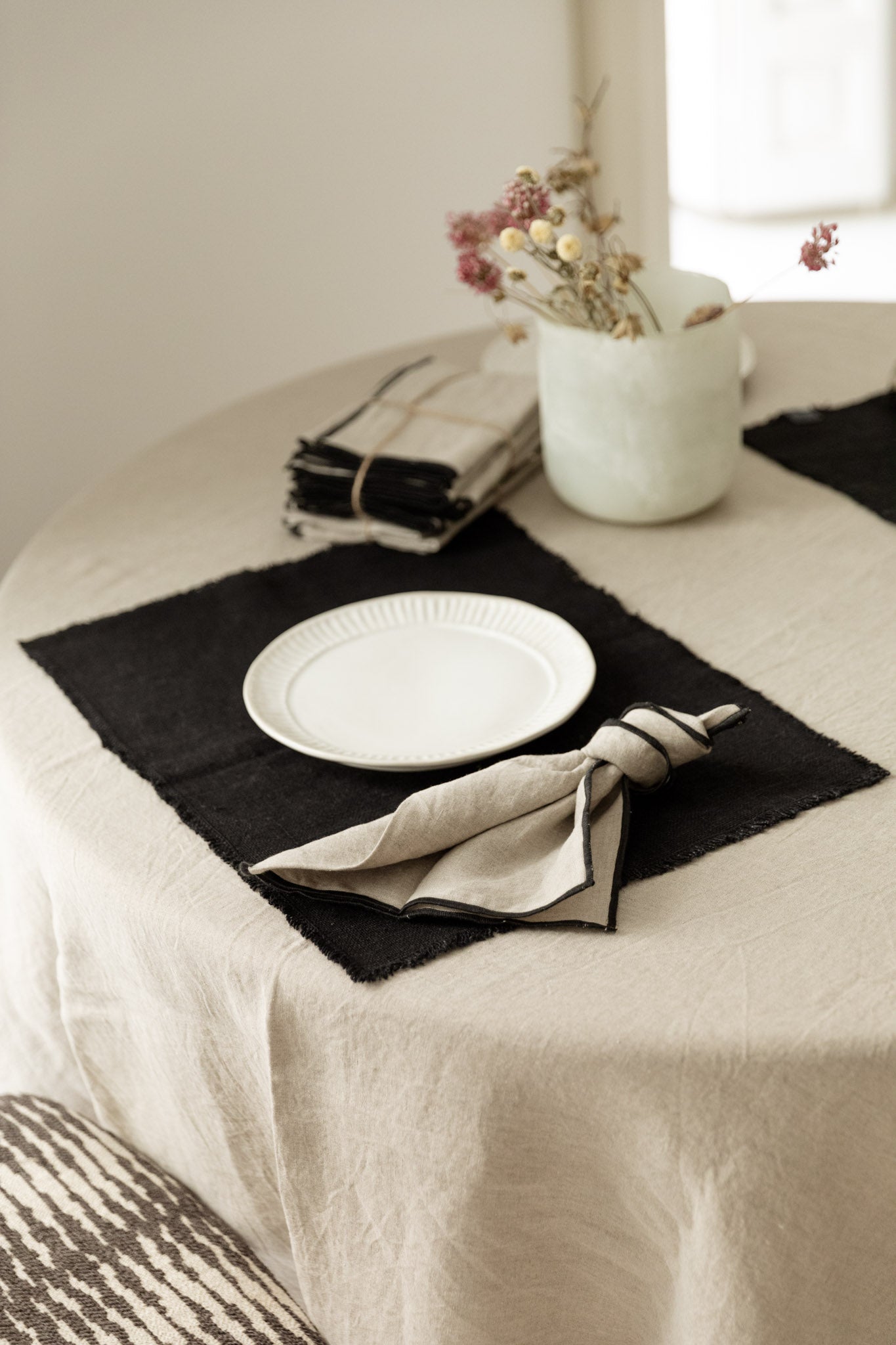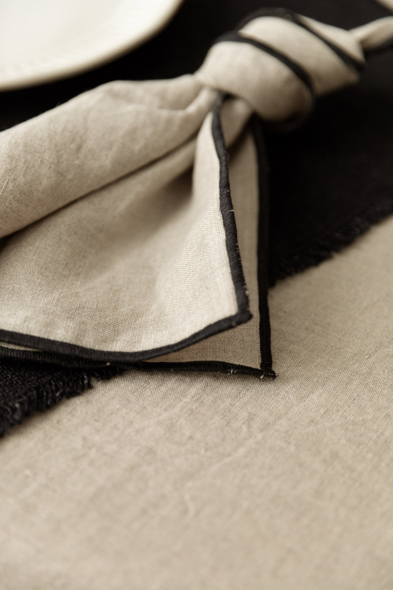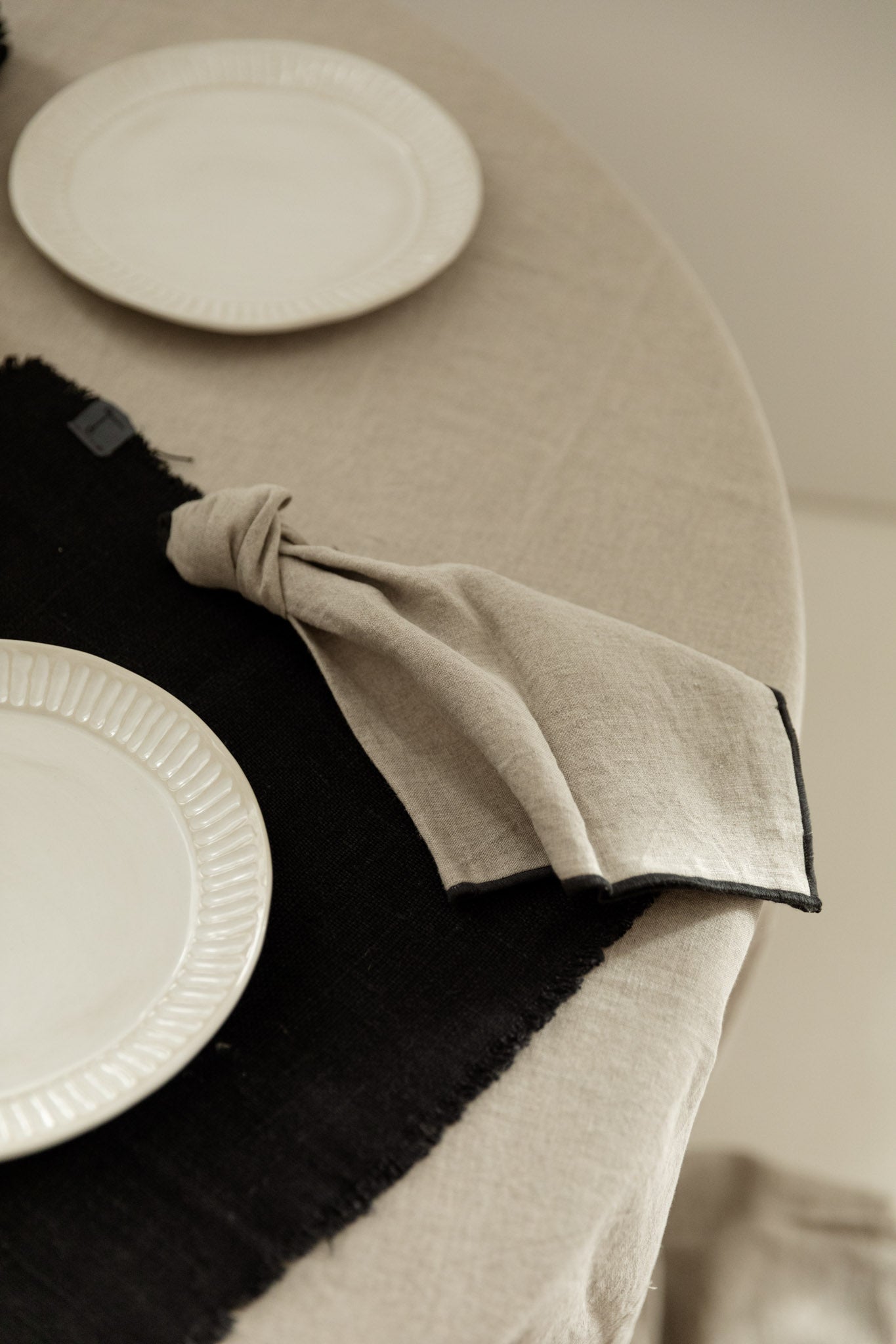 Servilleta elaborada artesanalmente en España con lino 100% natural y un delicado repulgo en tono negro. Nuestro lino cuenta con la certificación OEKO-TEX® Standard 100 (certificado nº 2021OK068), que garantiza un proceso textil respetuoso con las personas y el entorno.