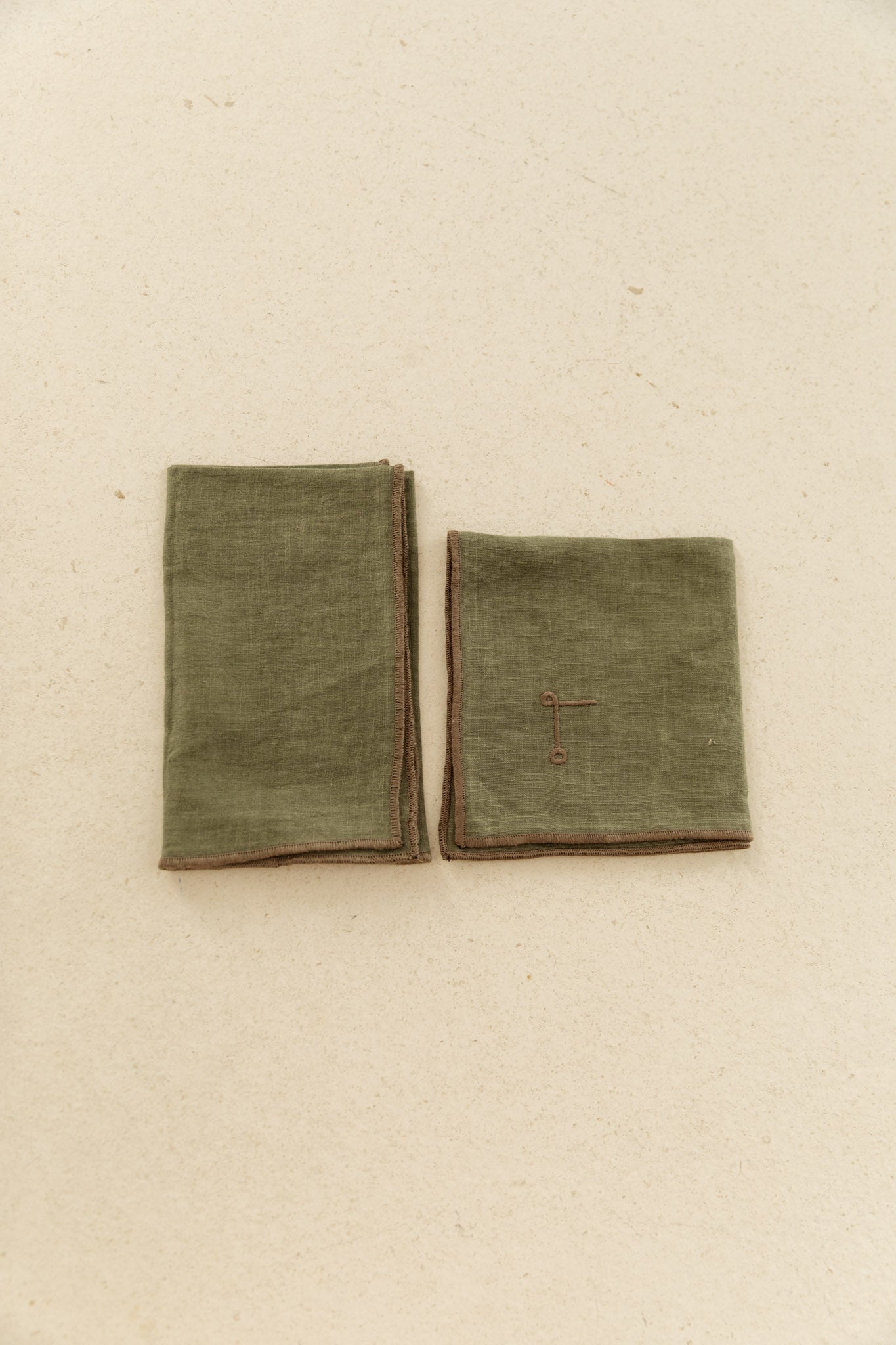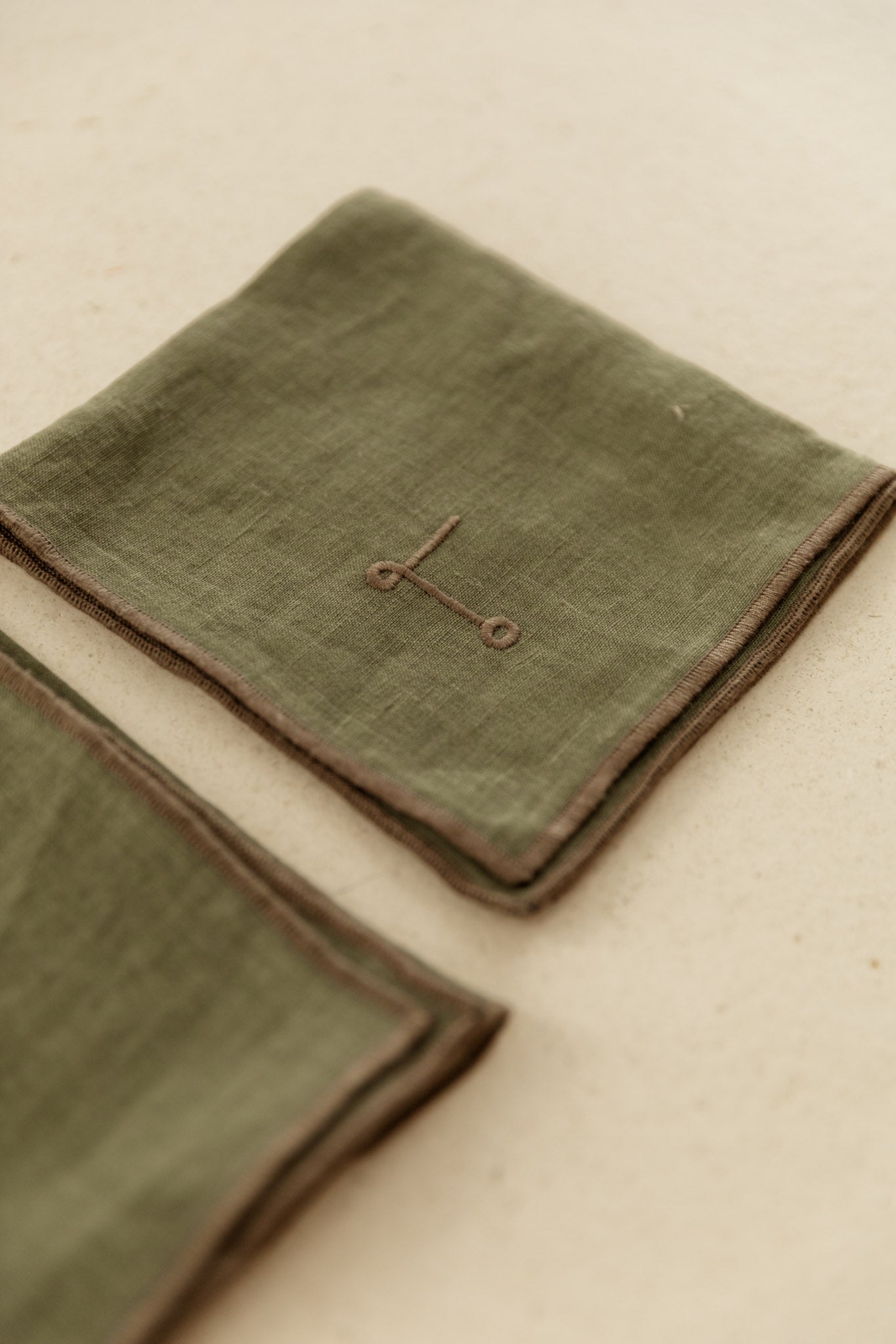 Servilleta de cóctel color verde, elaborada artesanalmente en España con lino 100% con bordado marrón. Nuestro lino cuenta con la certificación OEKO-TEX® Standard 100 (certificado nº 2021OK068), que garantiza un proceso textil respetuoso con las personas y el entorno.