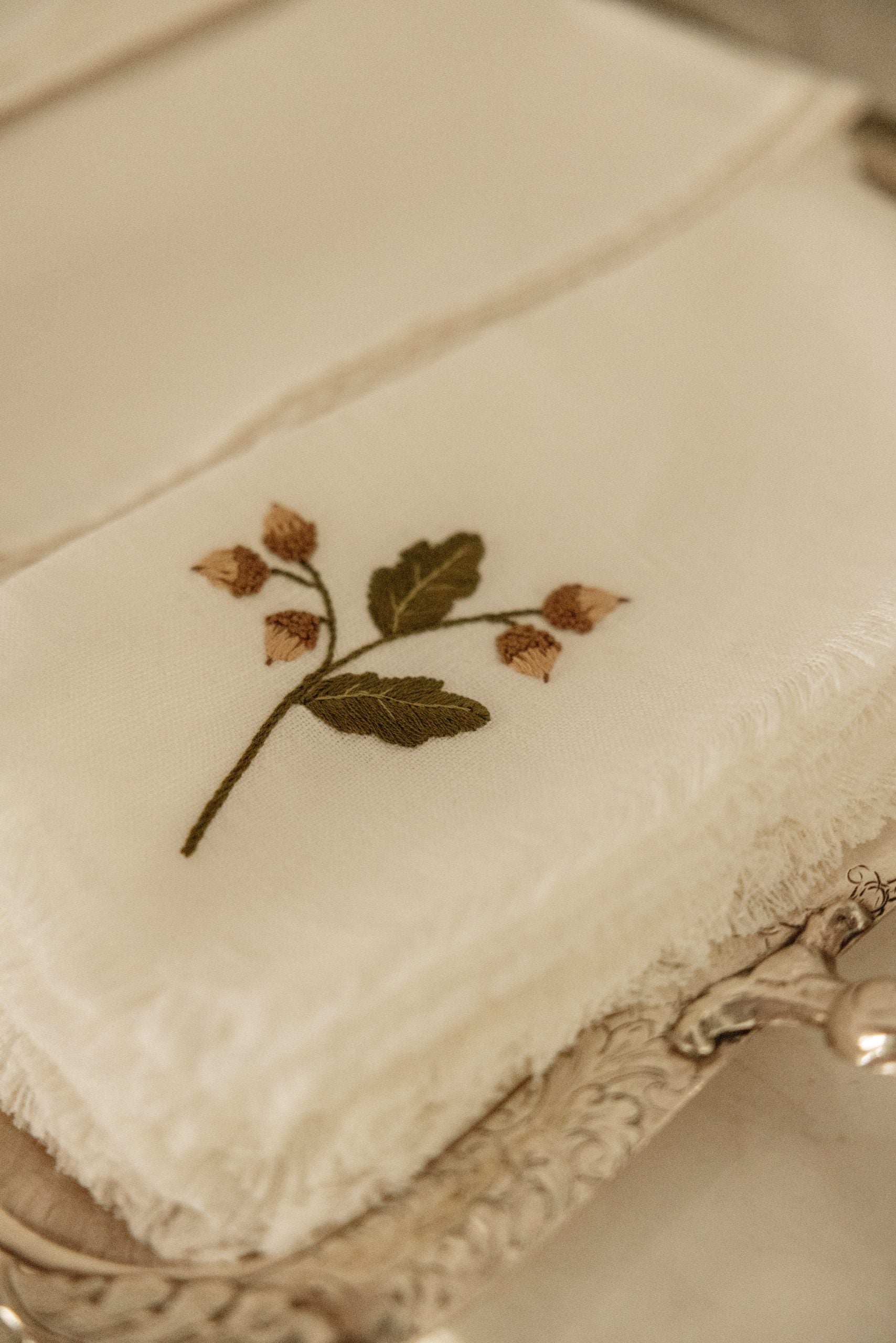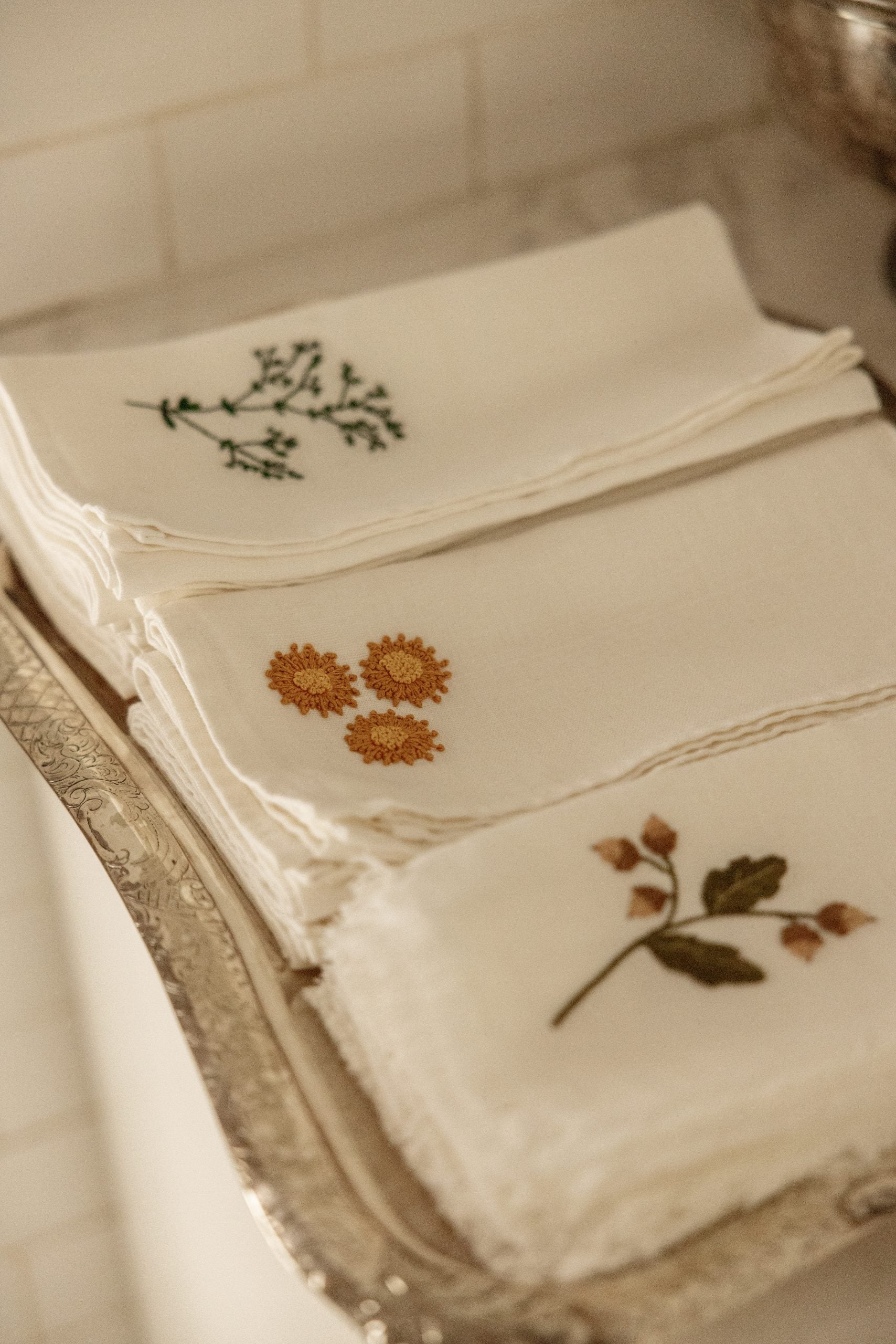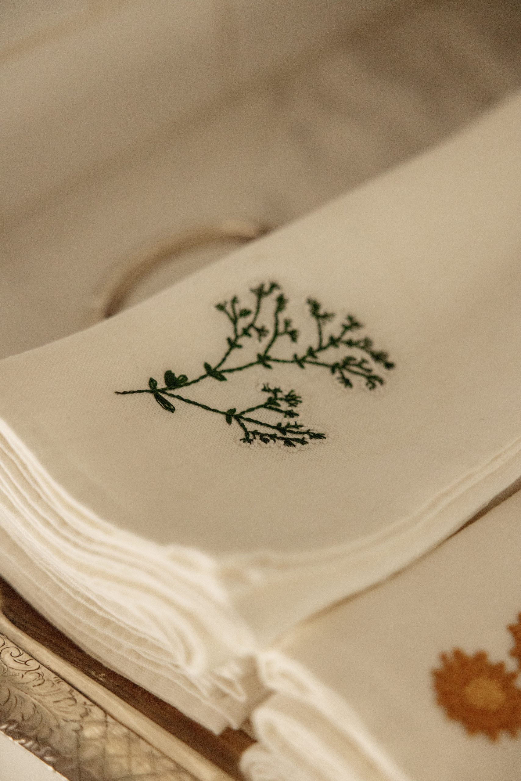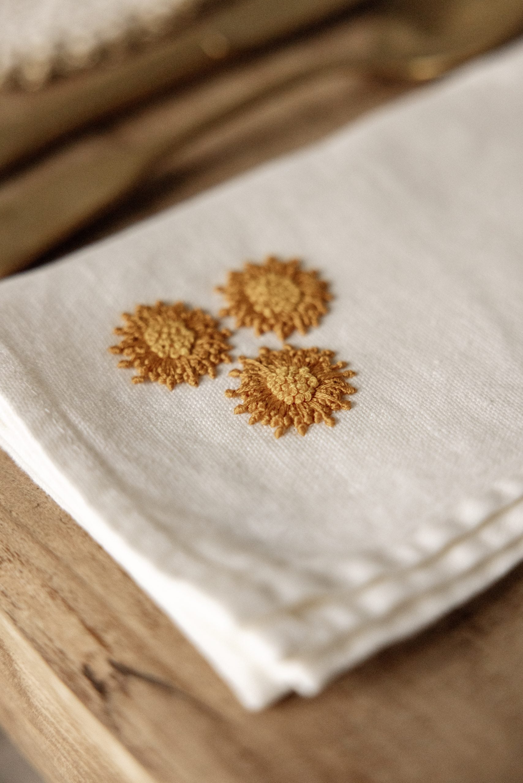 Servilletas de lino bordadas a mano en España, elaboradas con lino 100% italiano de color blanco. Cada pieza es única y artesanal, pensada para vestir la mesa con elegancia y sencillez.