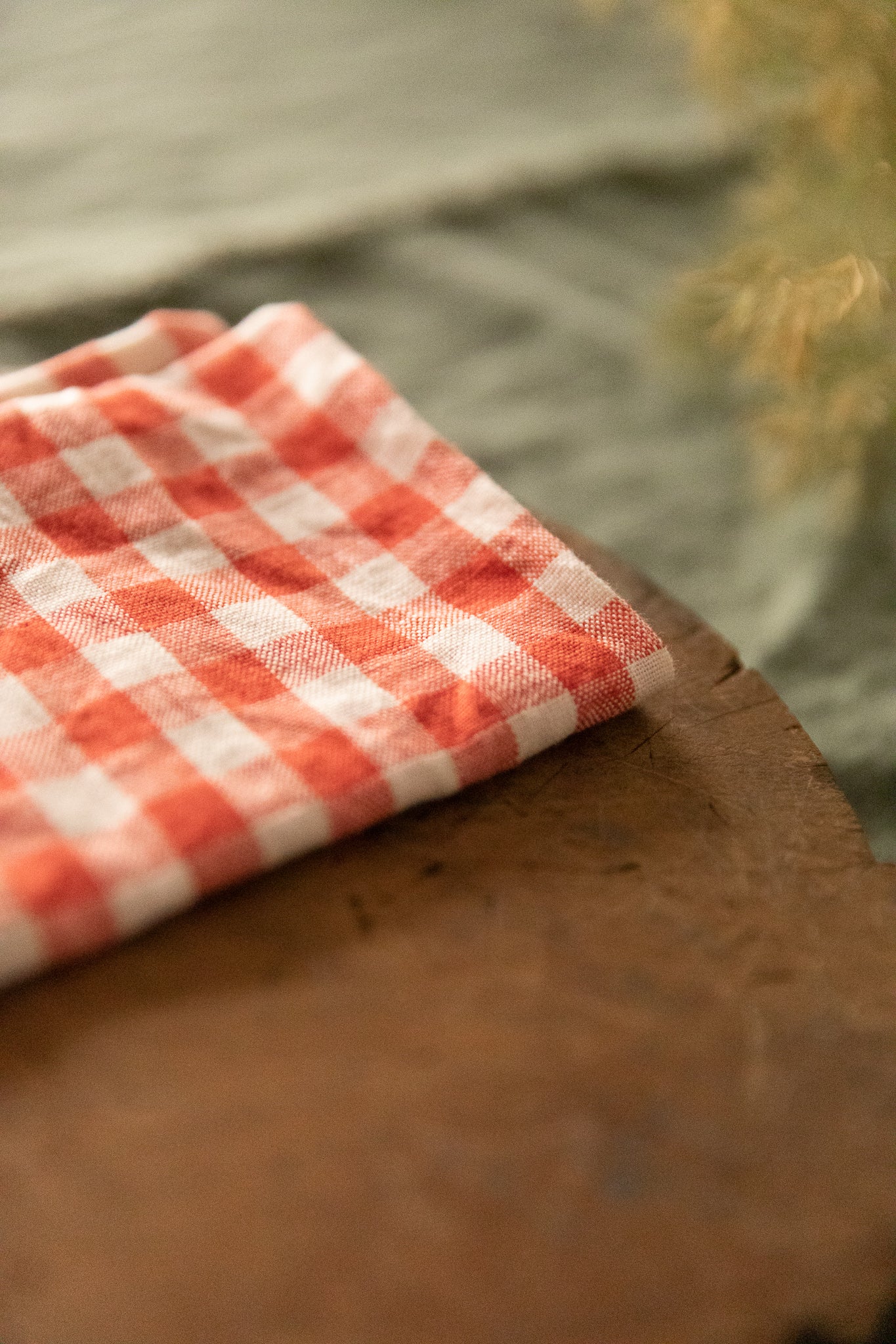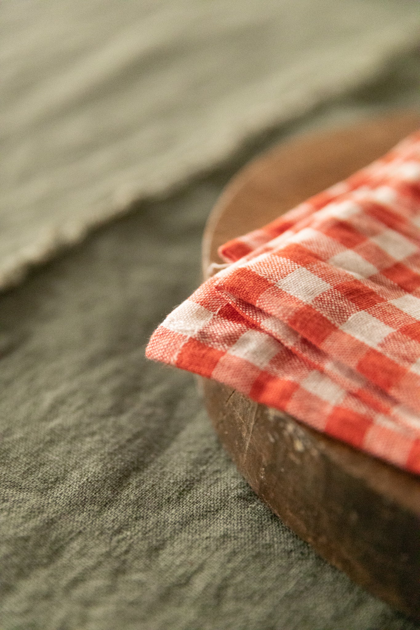Servilletas de lino lavado 100%, elaboradas artesanalmente en España con el clásico estampado vichy en rojo y blanco. Cuentan con certificación OEKO-TEX® Standard 100, que asegura un proceso textil responsable y seguro.
