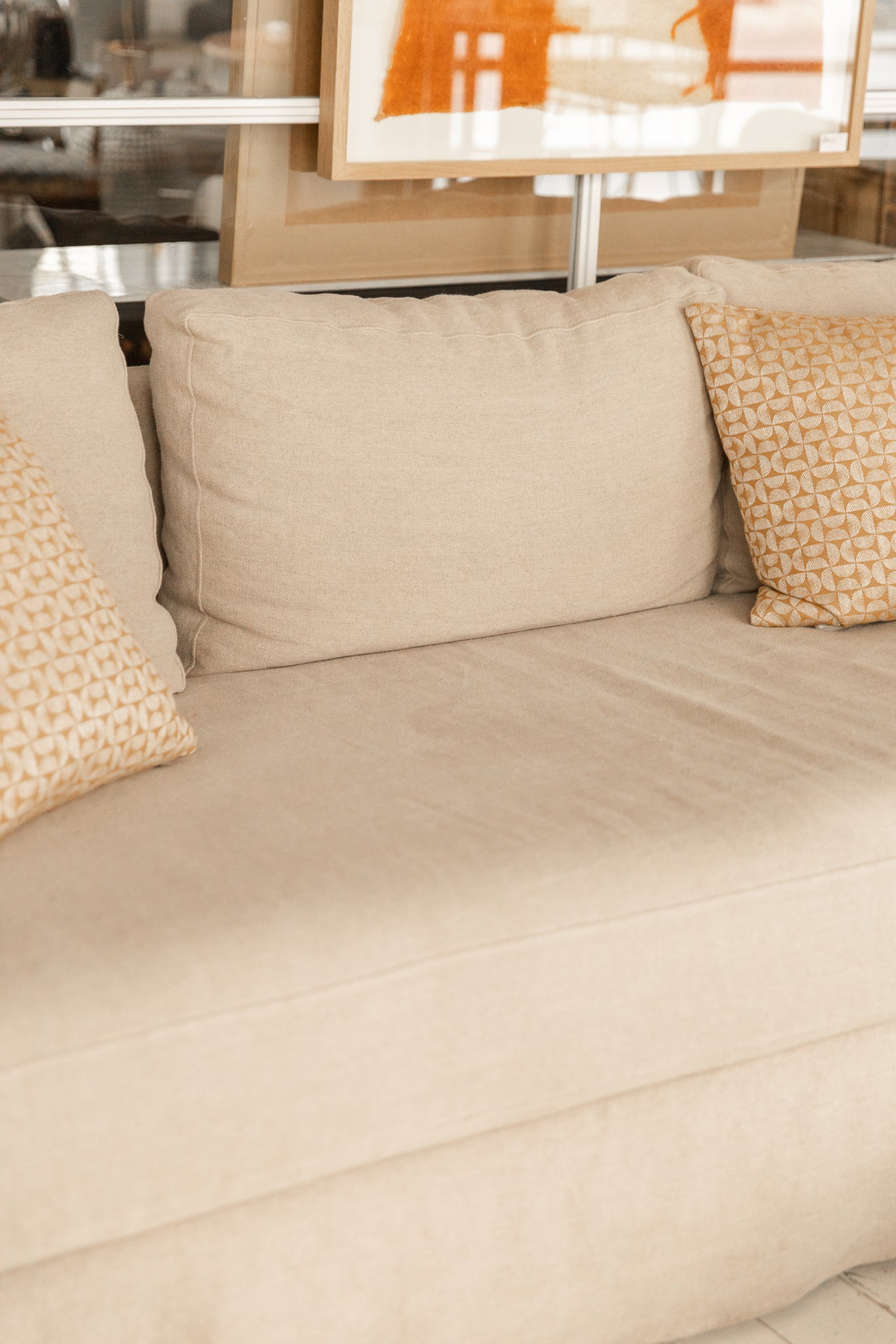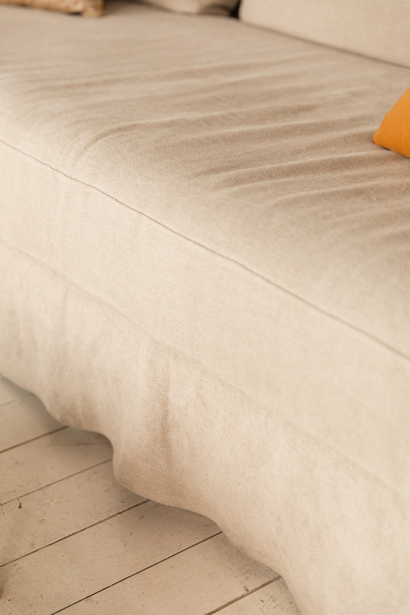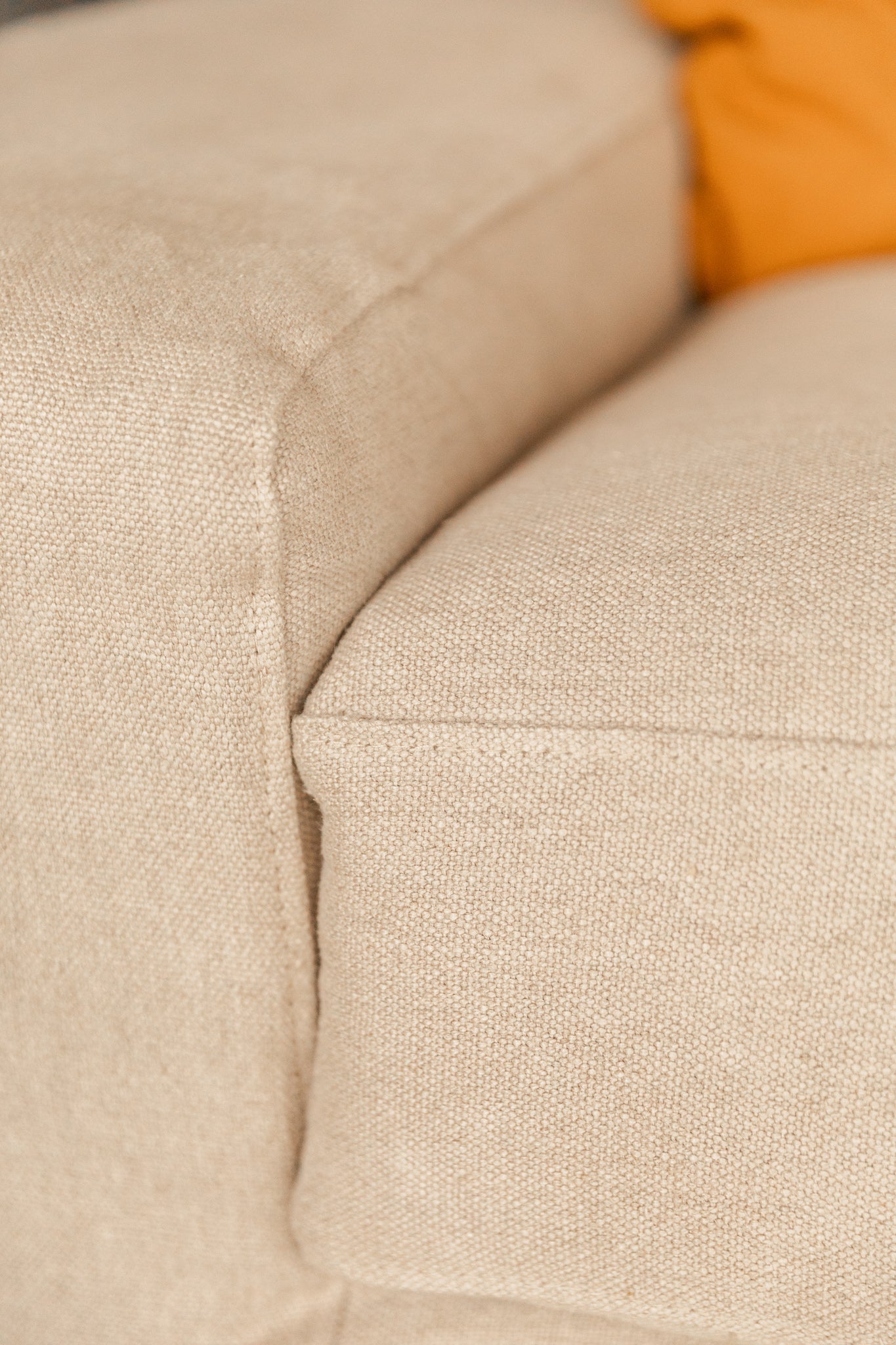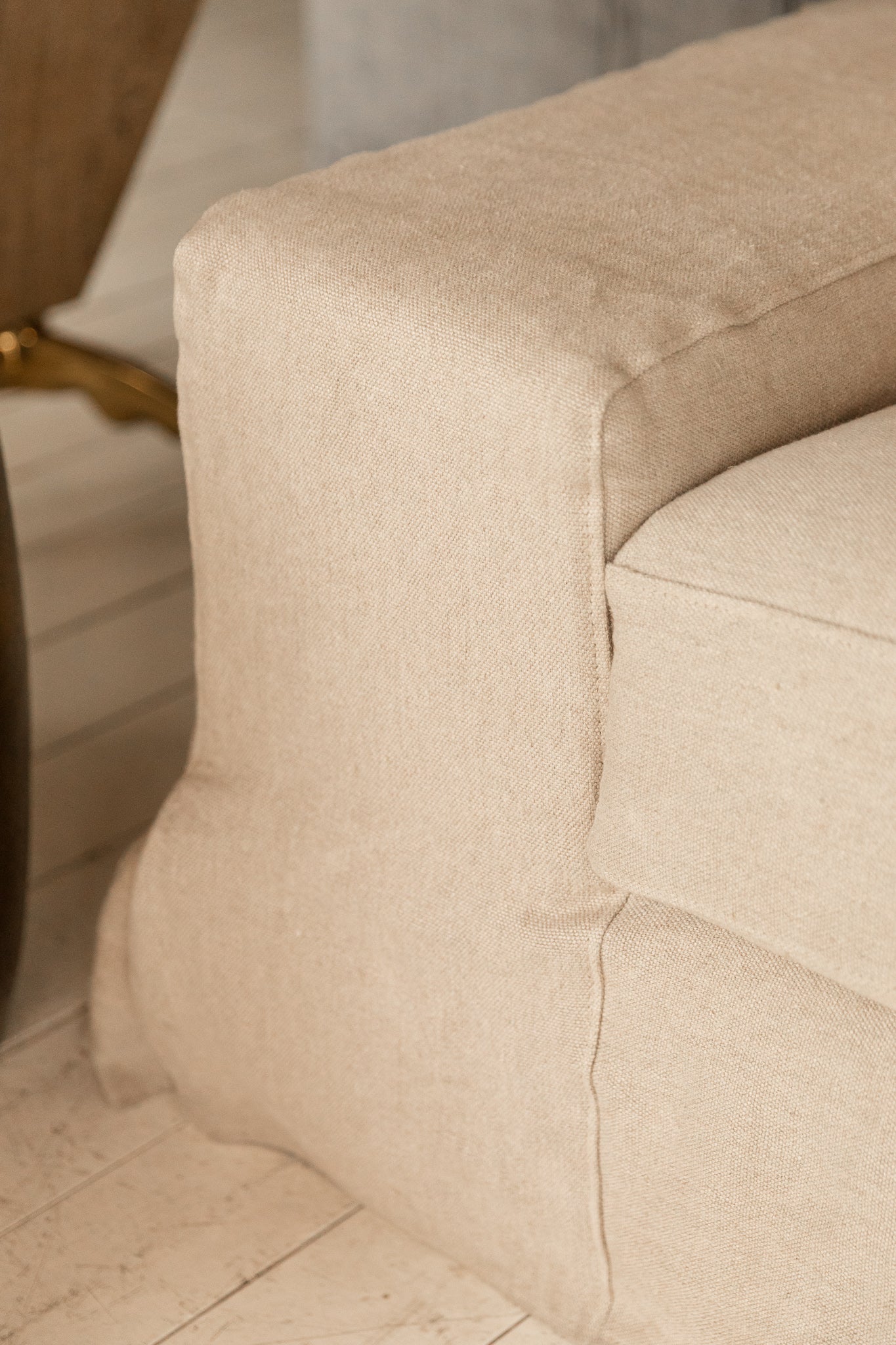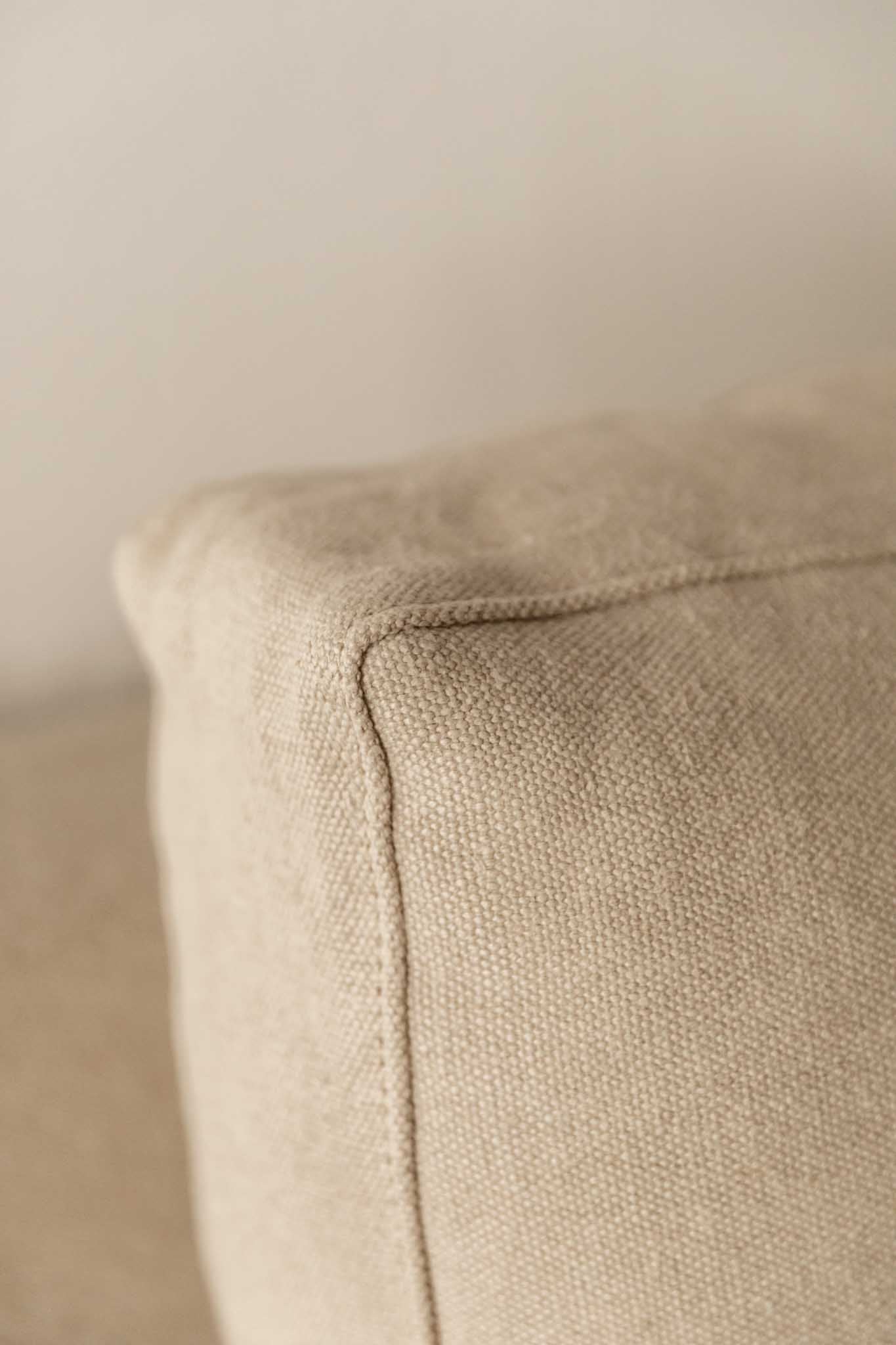 El sofá de lino desenfundable MZ.01, con brazo ancho, es un diseño propio de nuestra colección. Su estructura es de madera de pino y haya, con asientos de espuma de alta densidad recubiertos de pluma y cojines de pluma. Está tapizado con funda de 100% lino de alto gramaje.