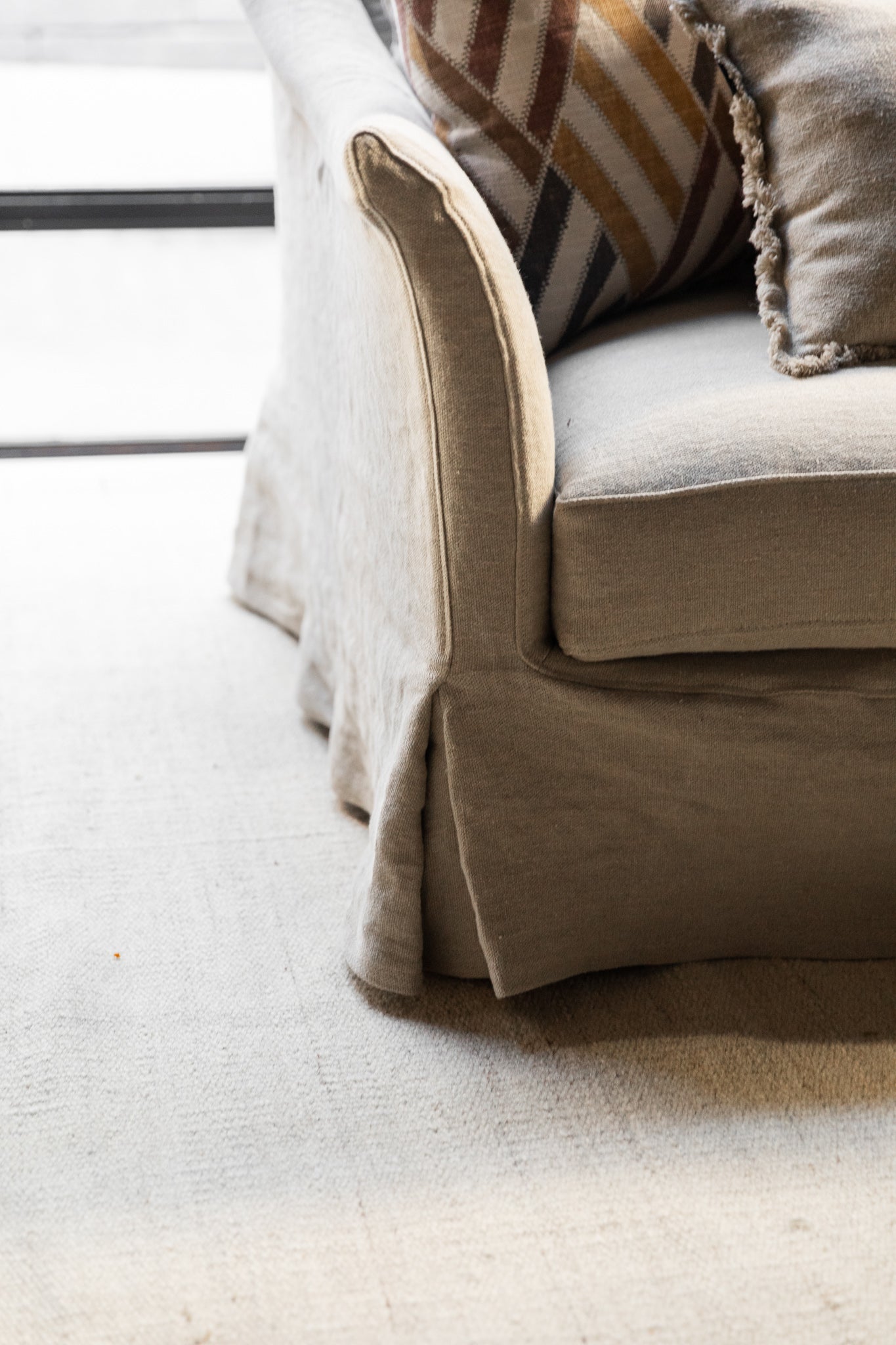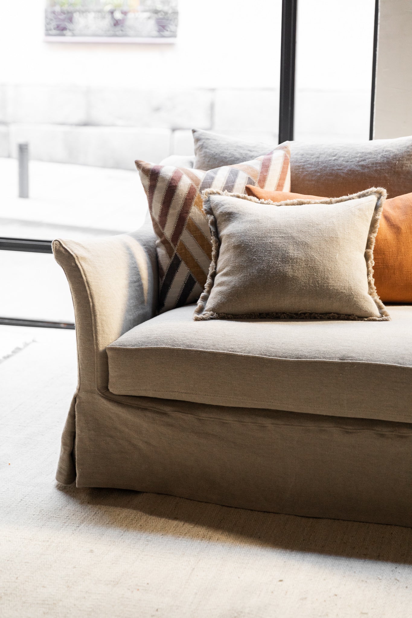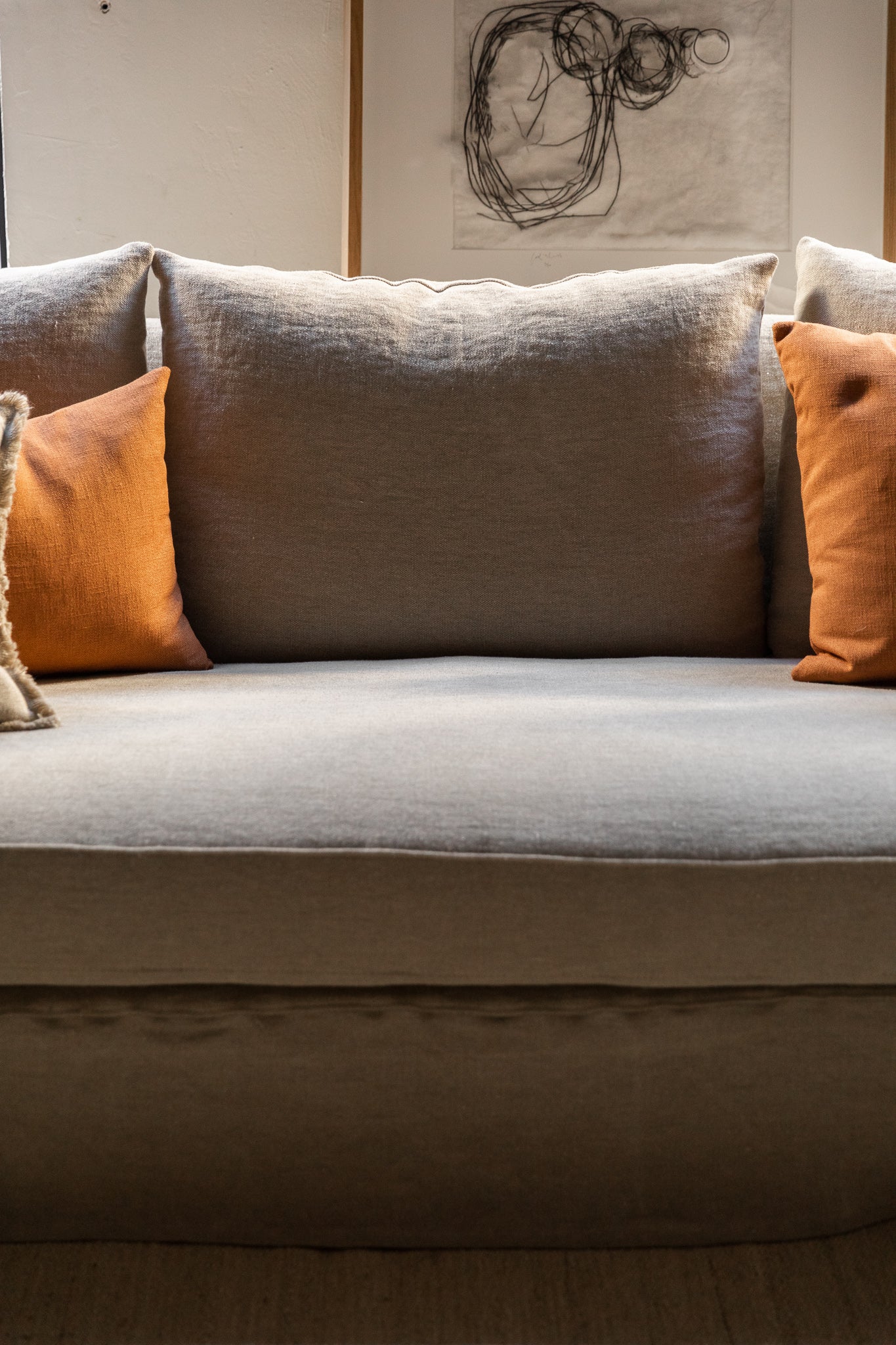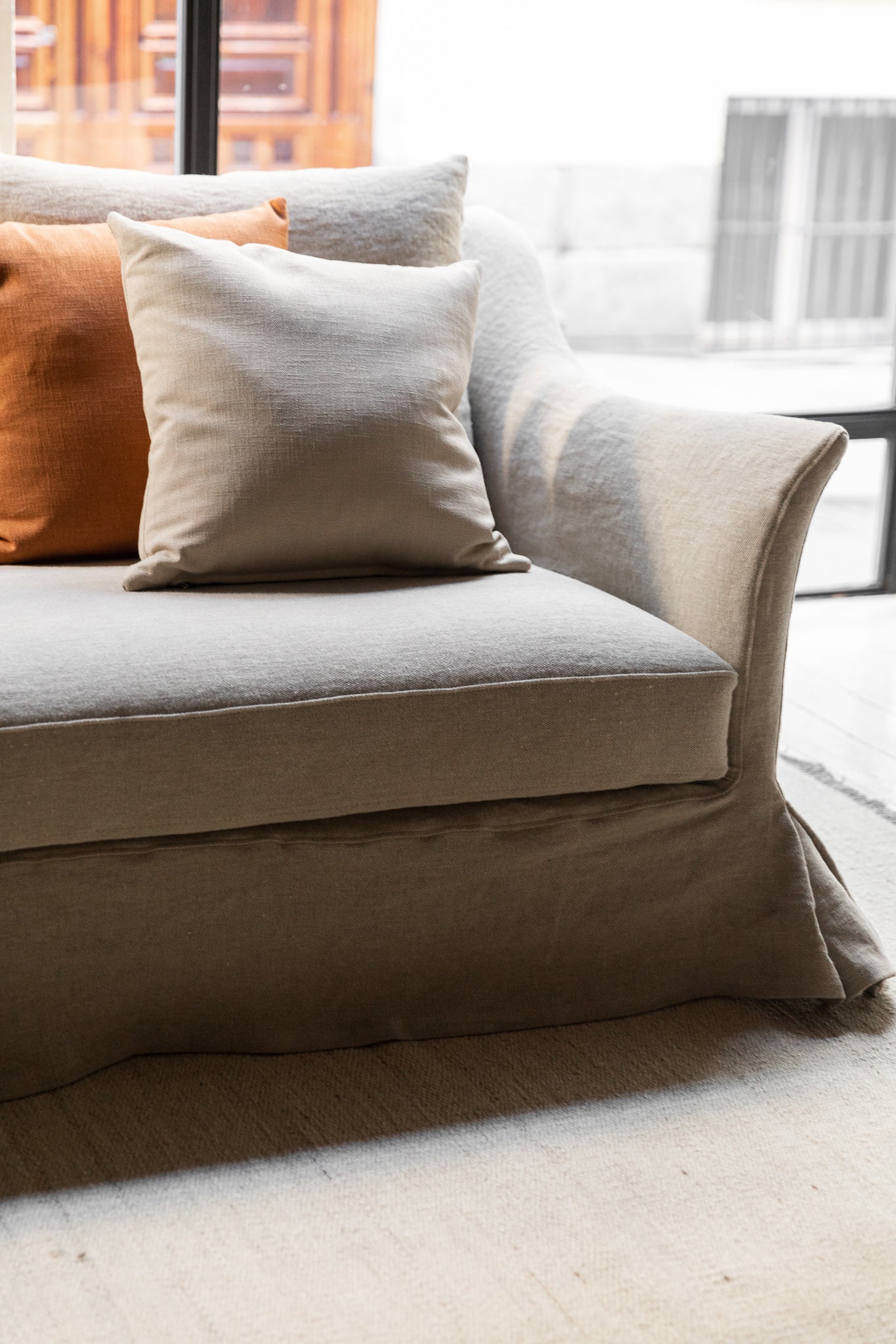 El sofá de lino desenfundable MZ.02, con brazo curvo, es un diseño propio de nuestra colección. Su estructura es de madera de pino y haya, con asientos de espuma de alta densidad recubiertos de pluma y cojines de pluma. Está tapizado con funda de 100% lino de alto gramaje.