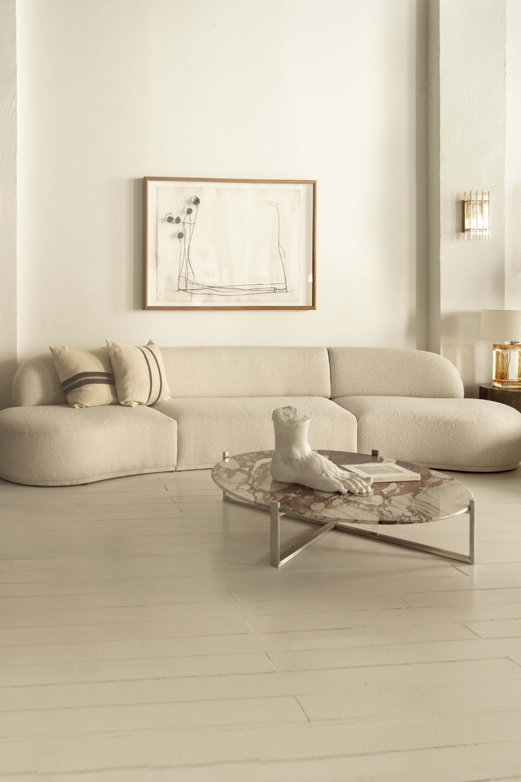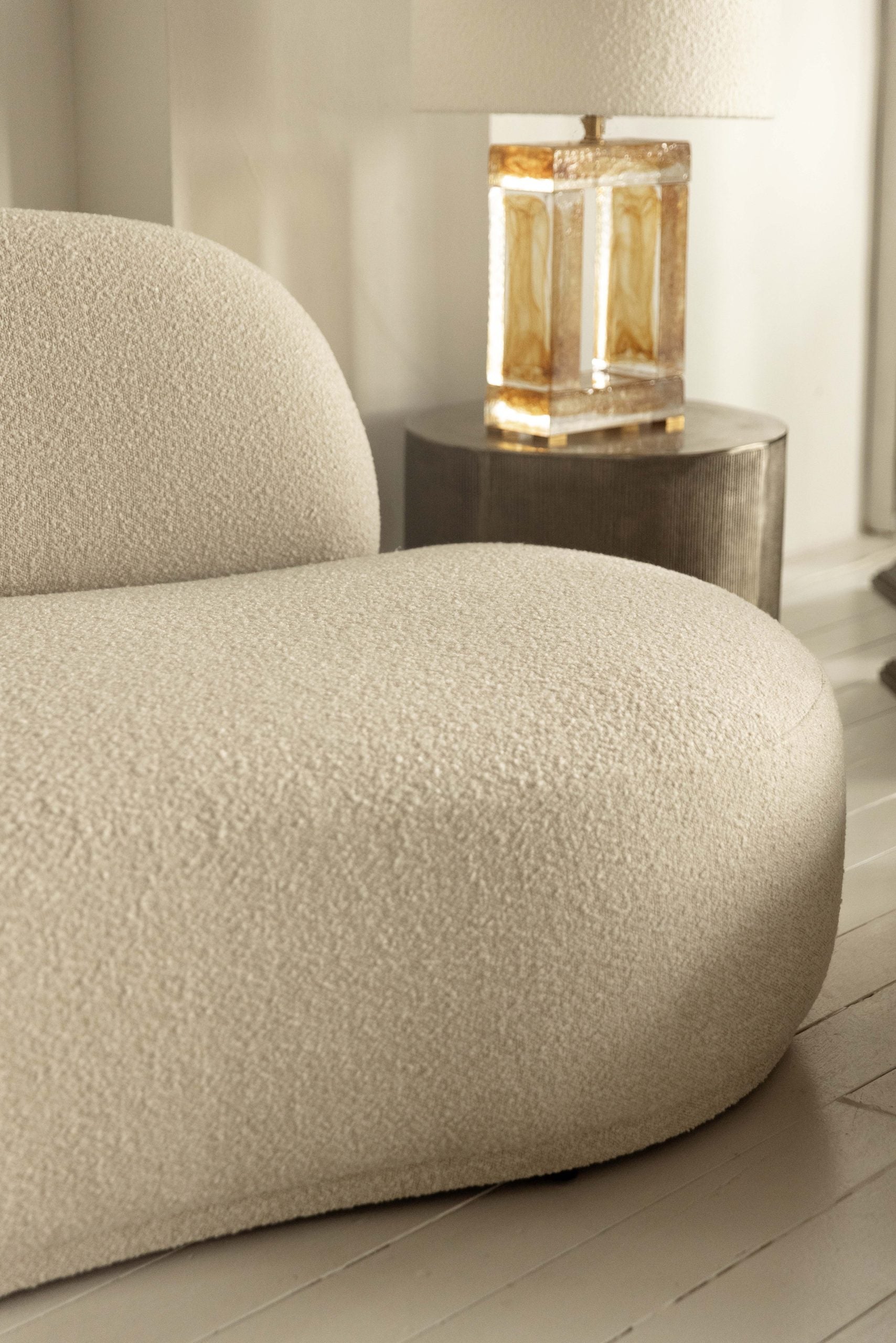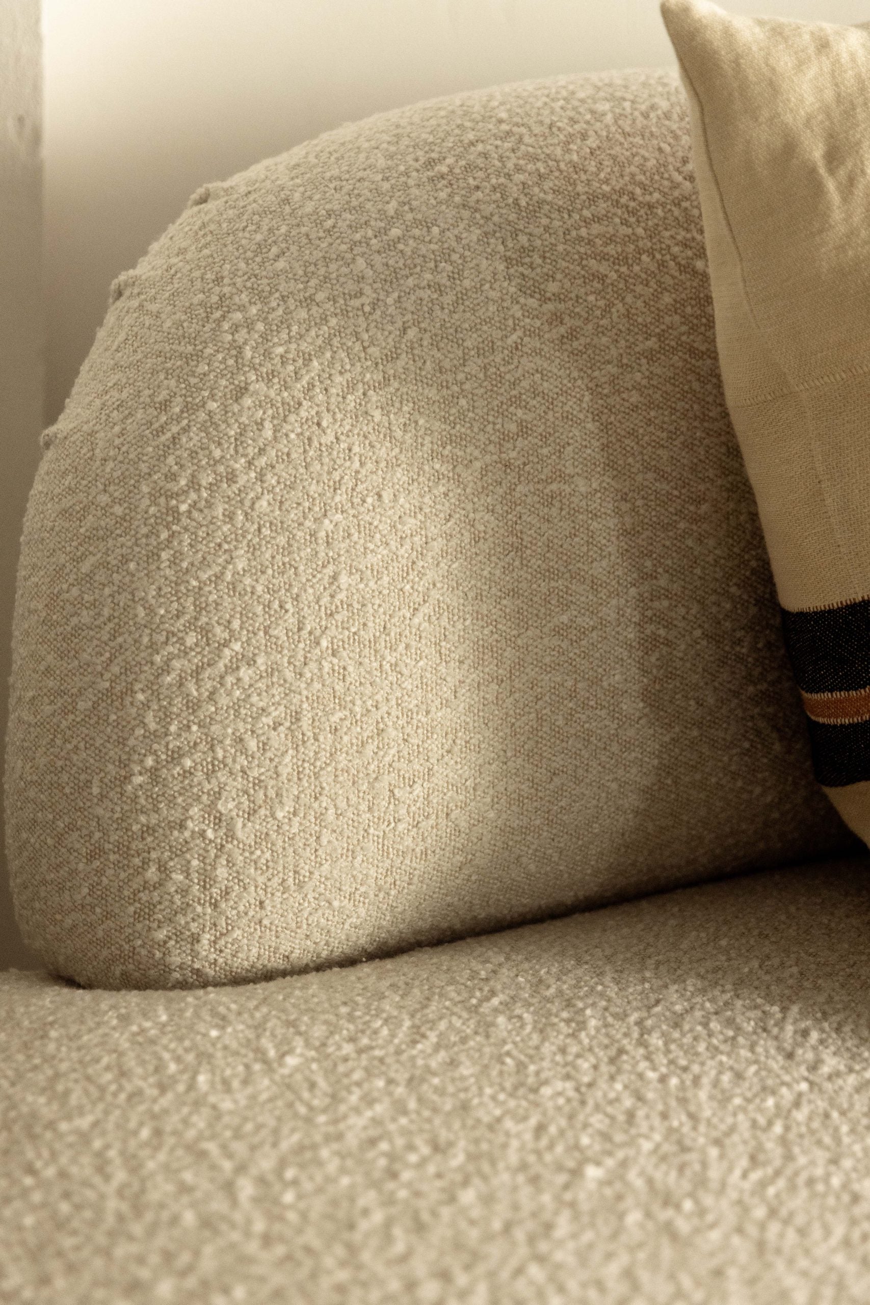 Su silueta curva y el tejido bouclé aportan textura, calidez y elegancia contemporánea a los espacios donde se encuentre.