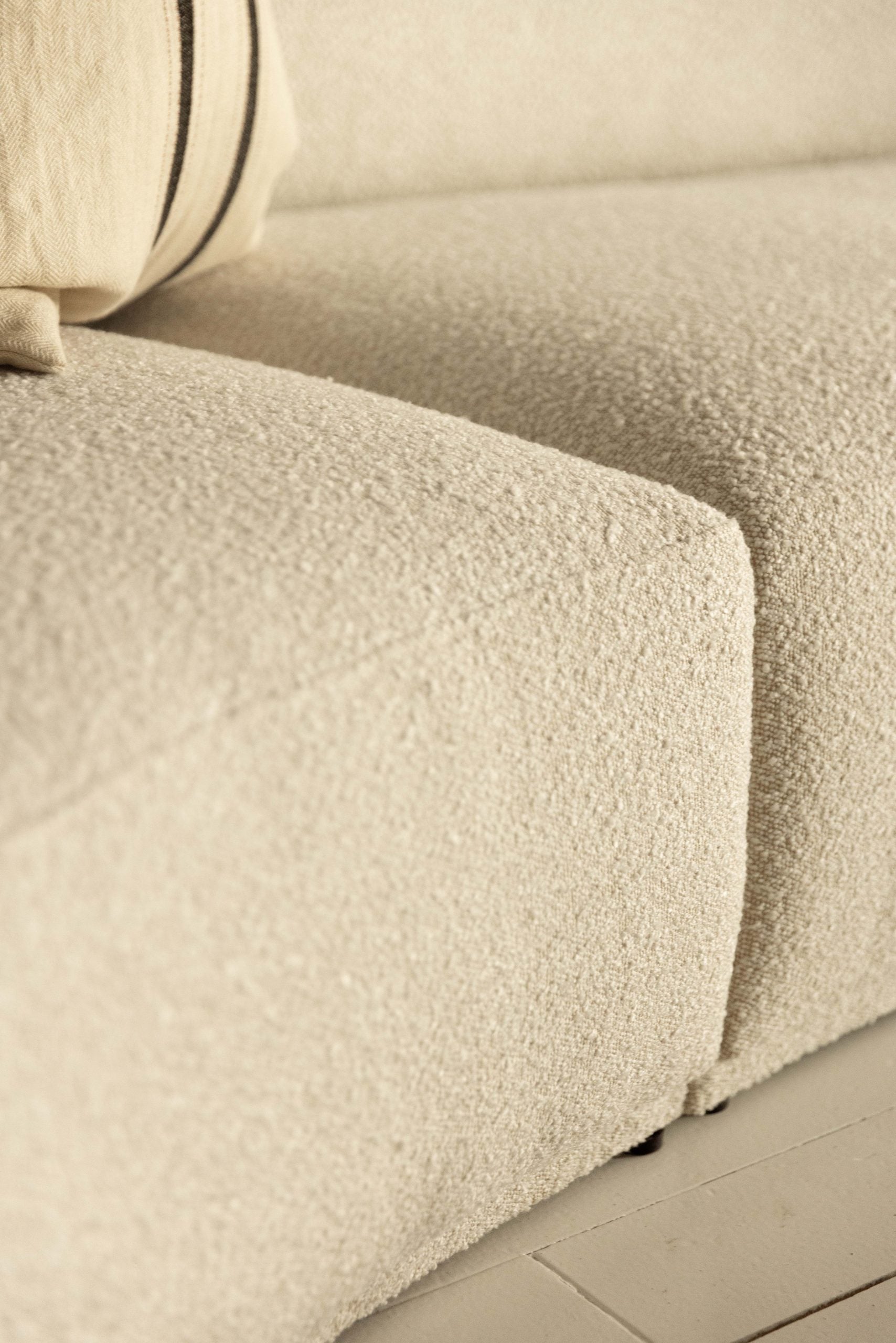 El sofá modular MZ.05 es un diseño propio de nuestra colección. Su estructura es de madera de pino y haya, asientos y respaldo de espuma de alta densidad y tapizado en un tejido semi bouclé muy ligero.