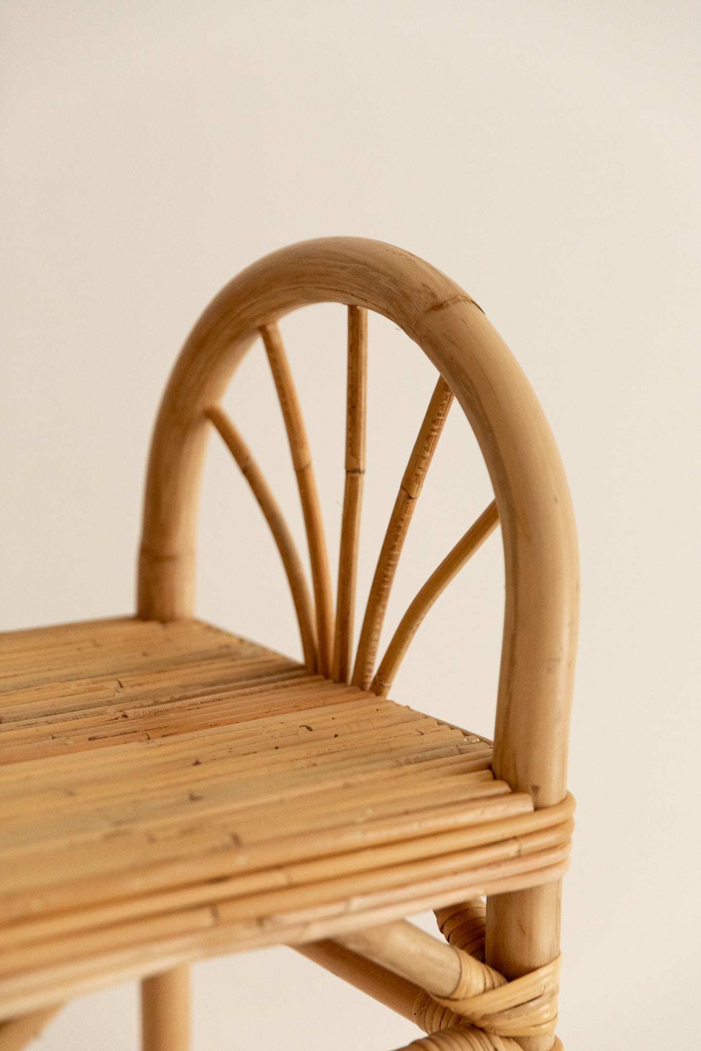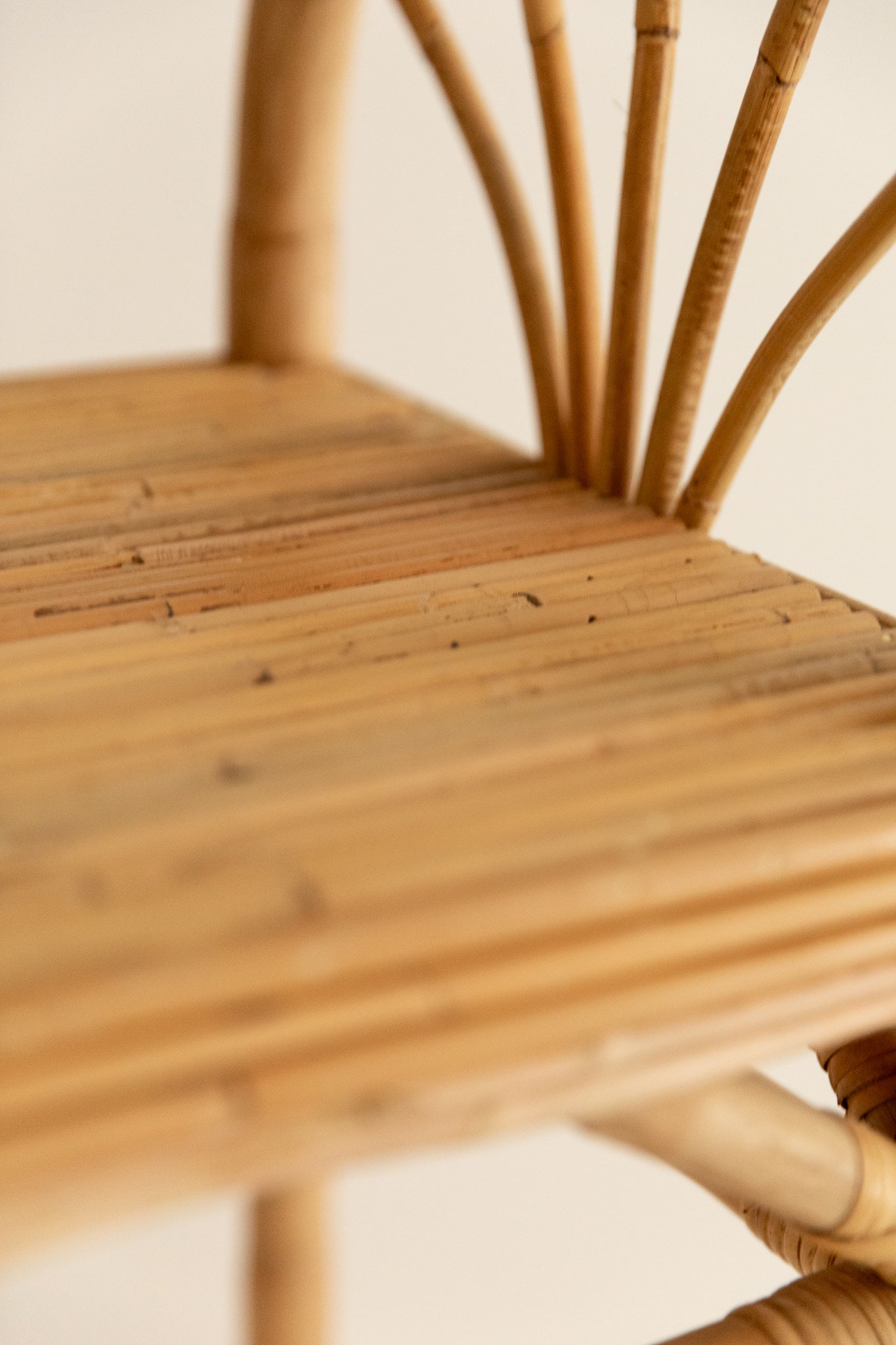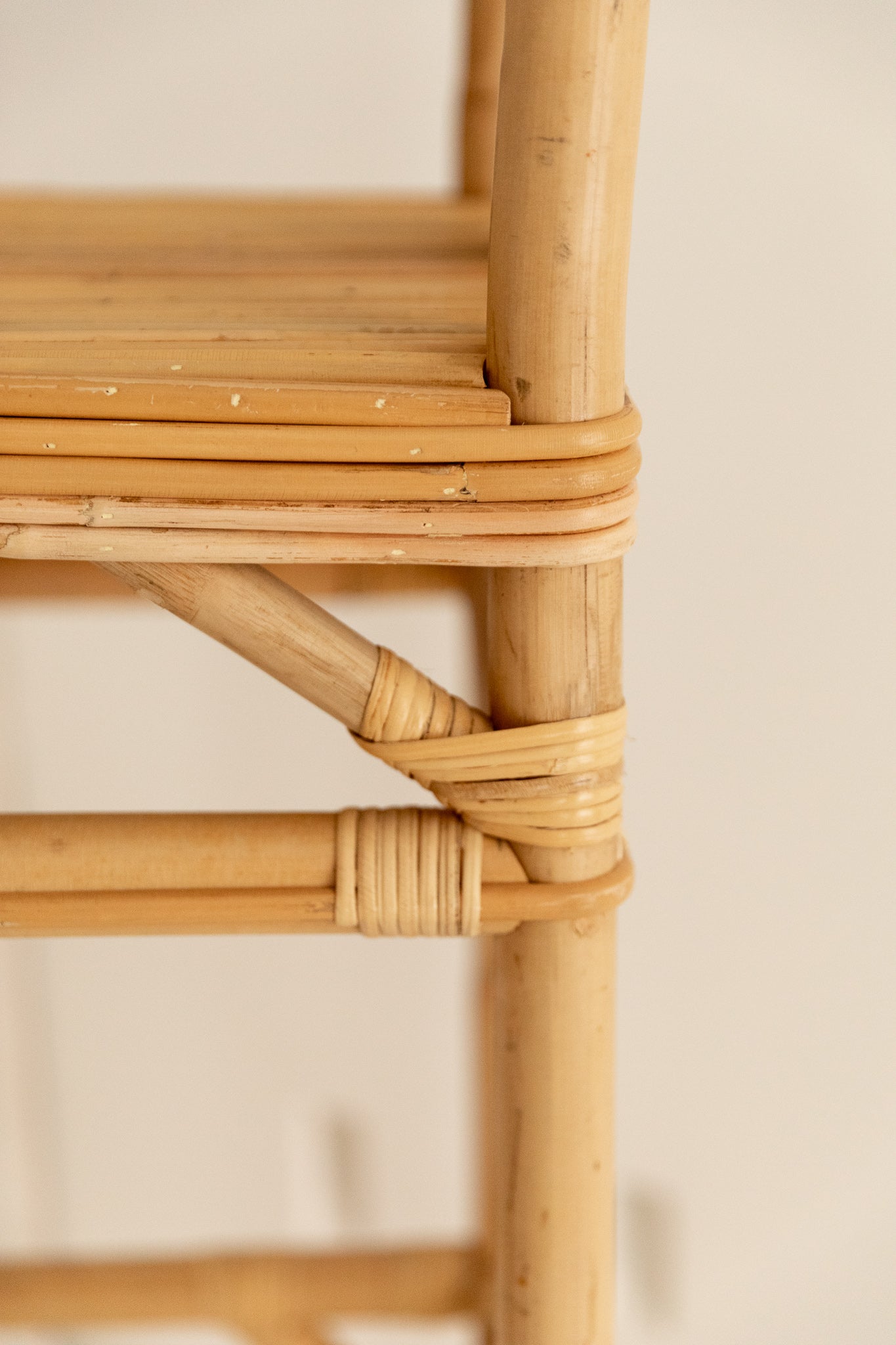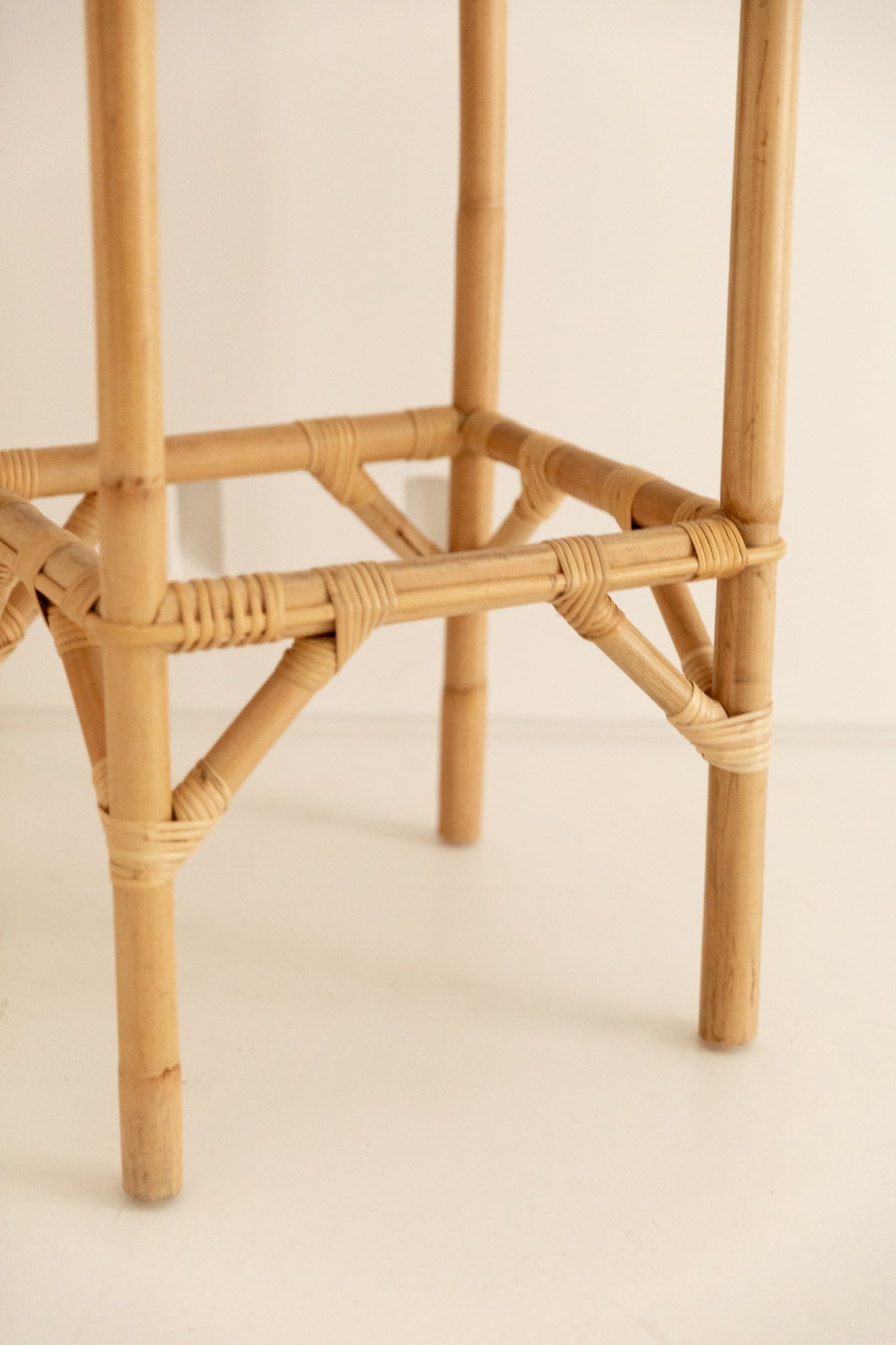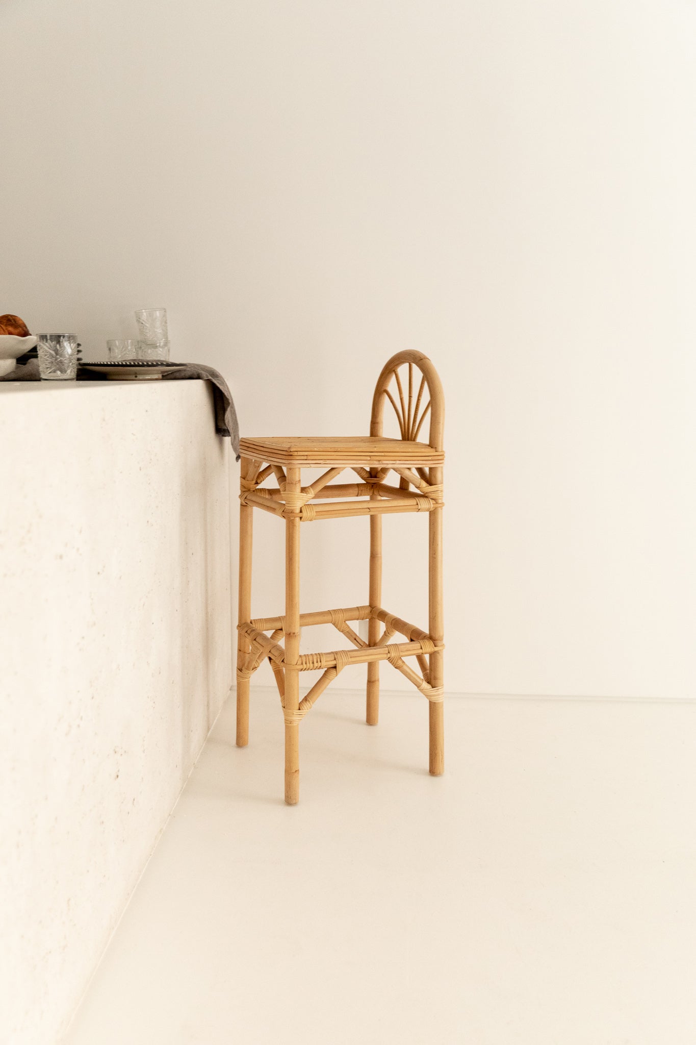 Taburete artesanal de ratán con respaldo curvo y reposapiés. Estructura formada por cañas de ratán natural unidas y trenzadas manualmente, lo que le confiere ligereza y resistencia.