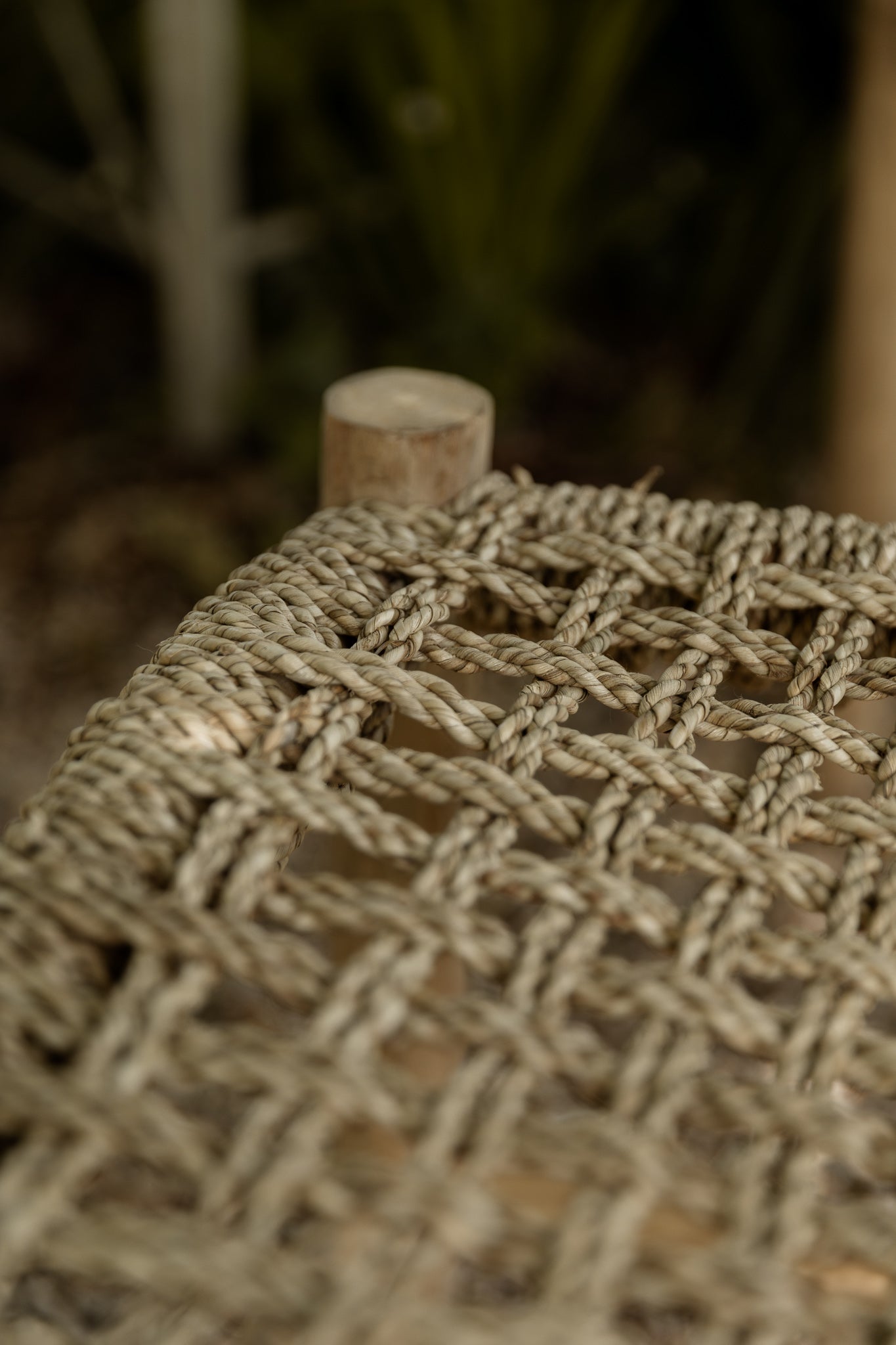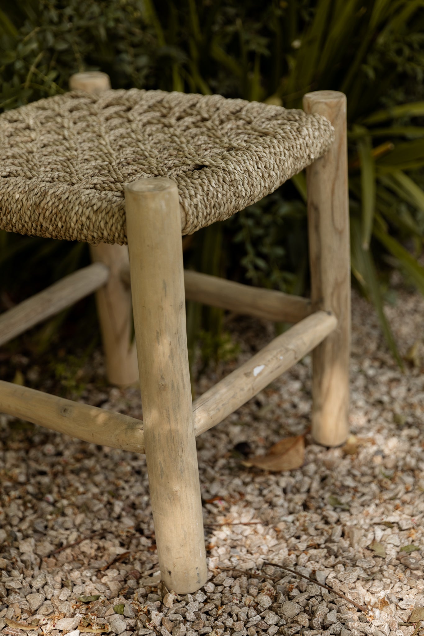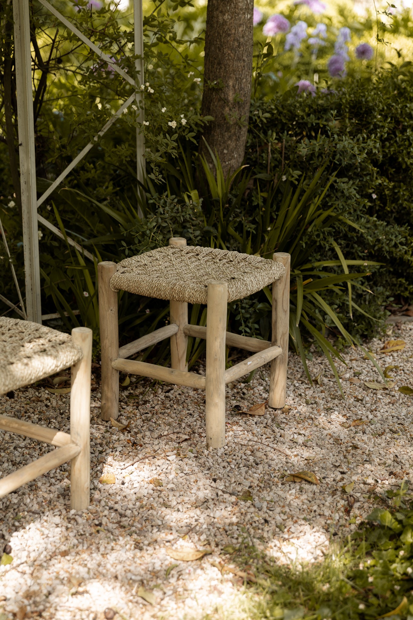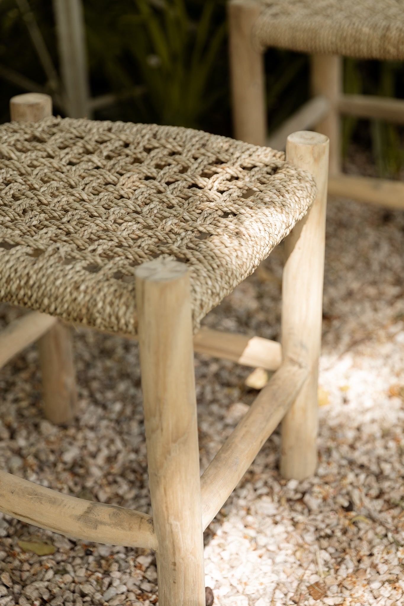 Taburete artesanal de forma cuadrada, elaborado en madera de teca y fibras naturales trenzadas. La estructura, realizada en teca maciza, garantiza estabilidad y durabilidad, mientras que el asiento tejido a mano introduce textura y calidez al diseño.