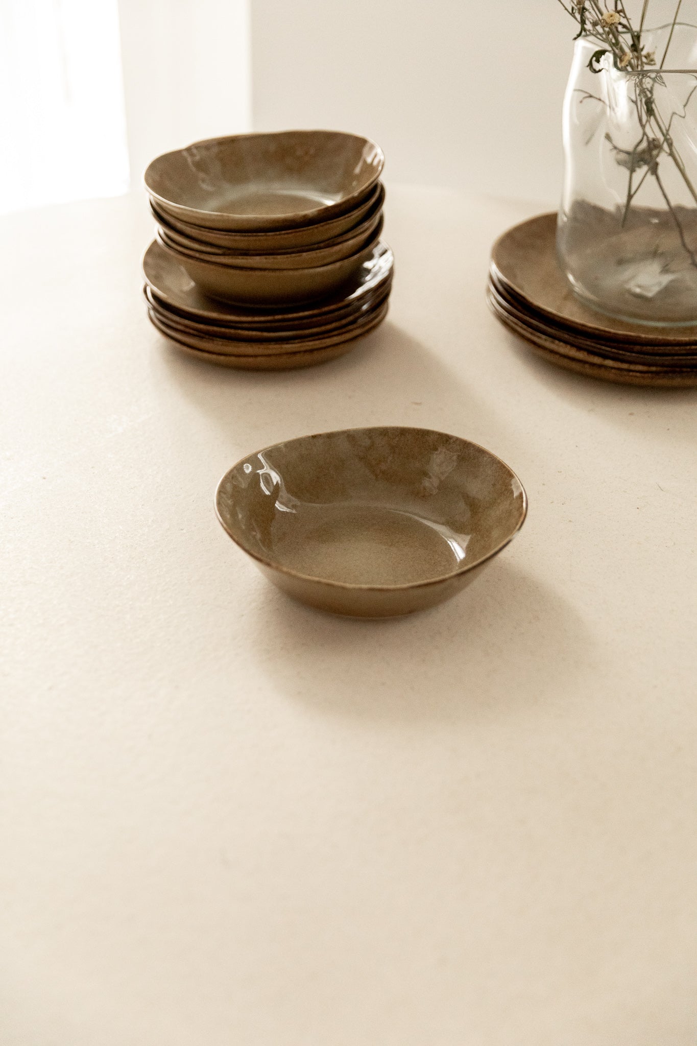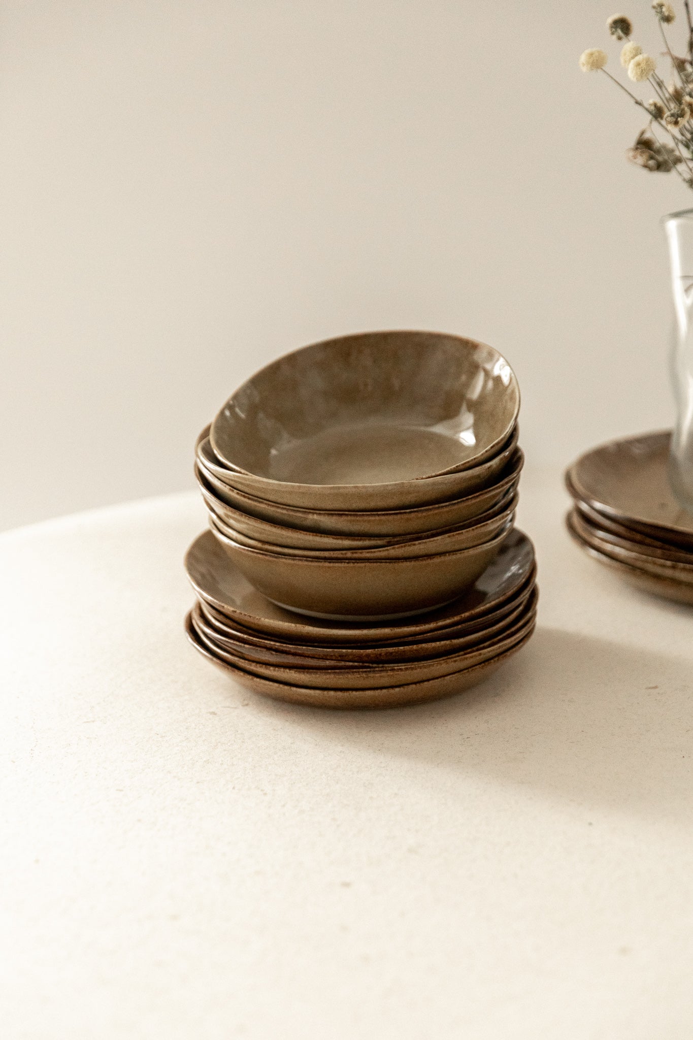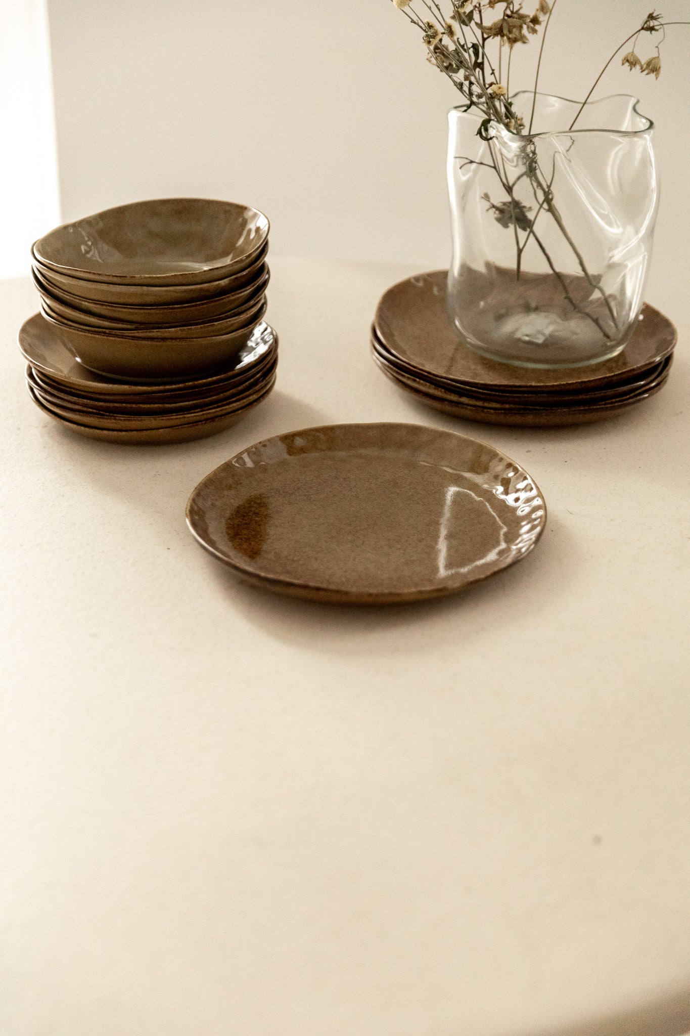 Vajilla de cerámica esmaltada en tonos marrones y beige. diseñada para aportar calidez y naturalidad a la mesa.