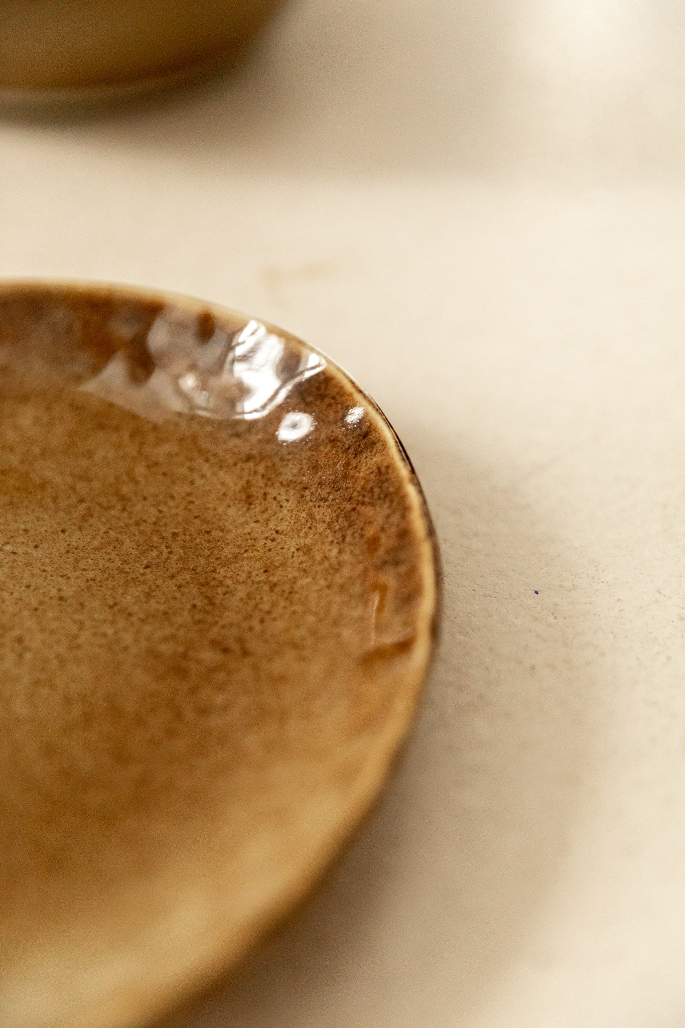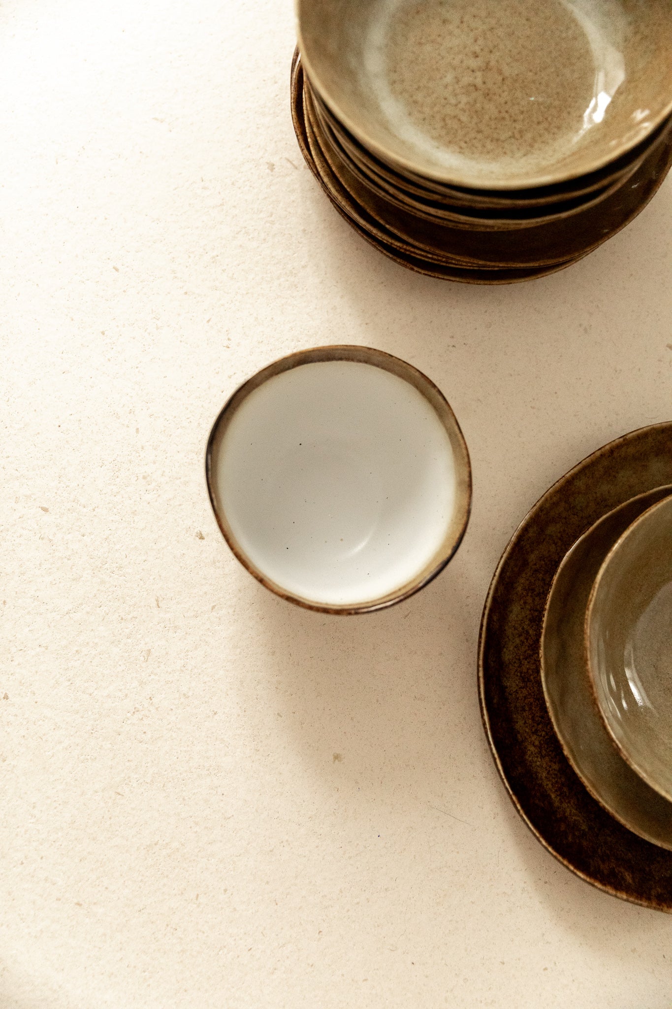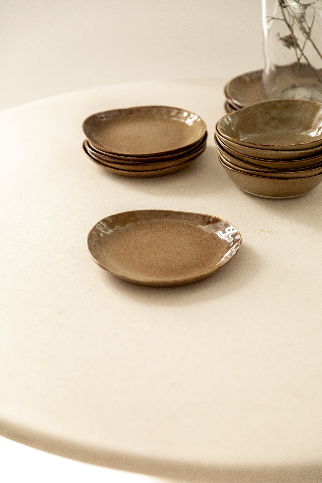 Vajilla de cerámica esmaltada en tonos marrones y beige. diseñada para aportar calidez y naturalidad a la mesa.