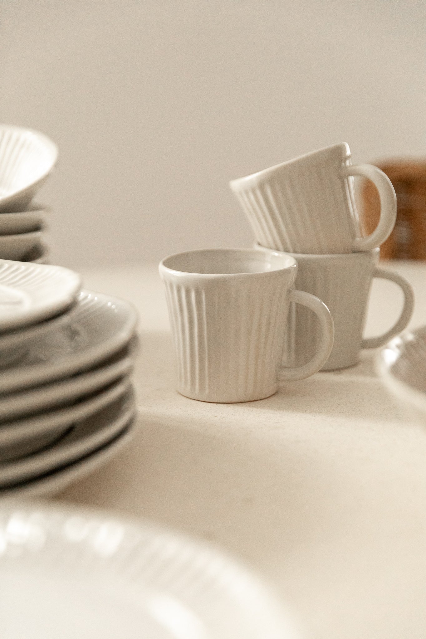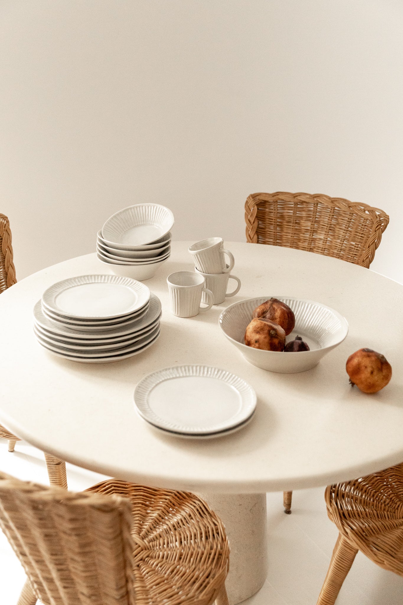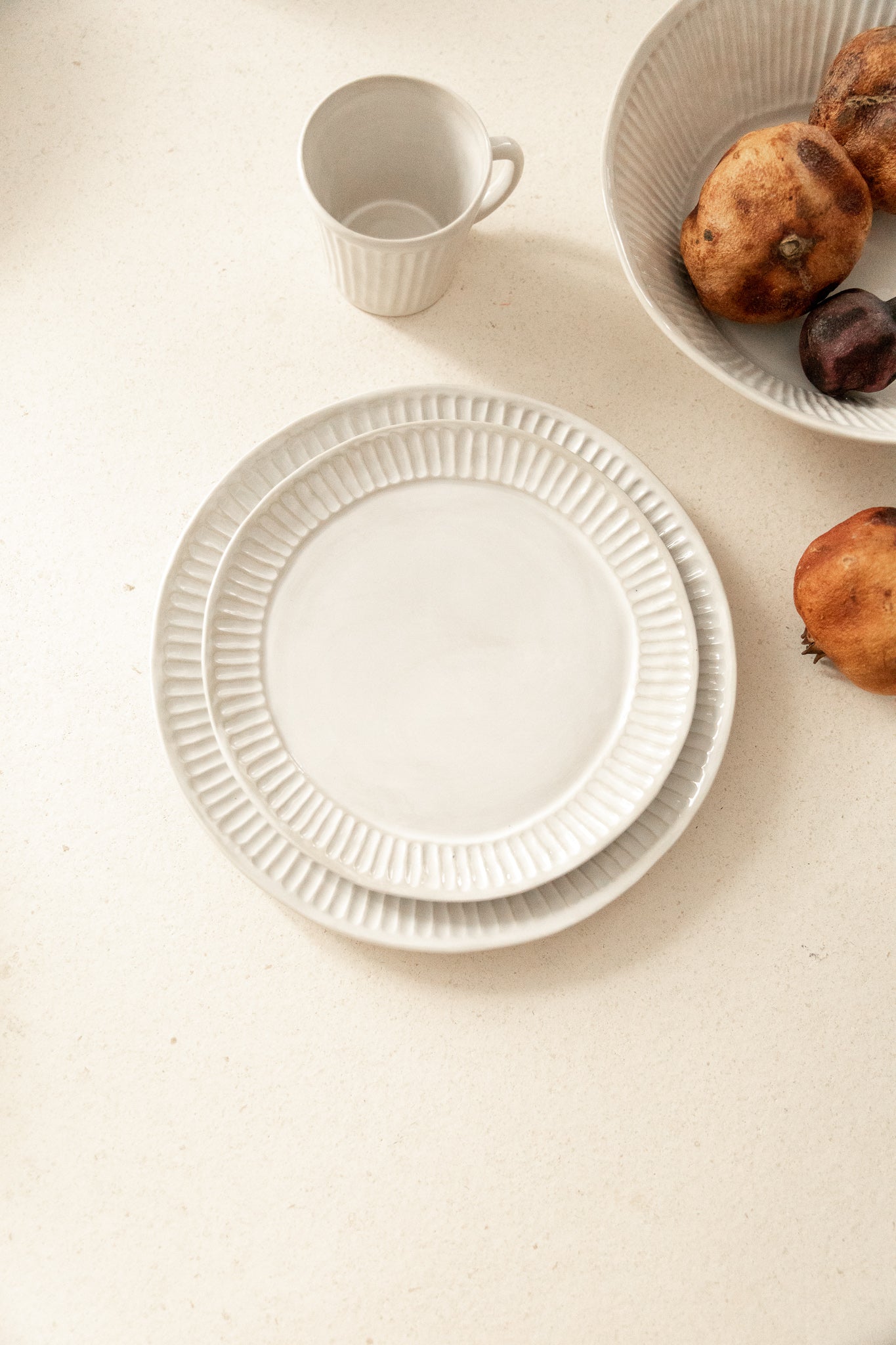 Vajilla de Gres Blanca Estriada. El gres, material reconocido por su resistencia y durabilidad, ofrece un acabado liso y robusto, ideal tanto para el uso diario como para ocasiones especiales.