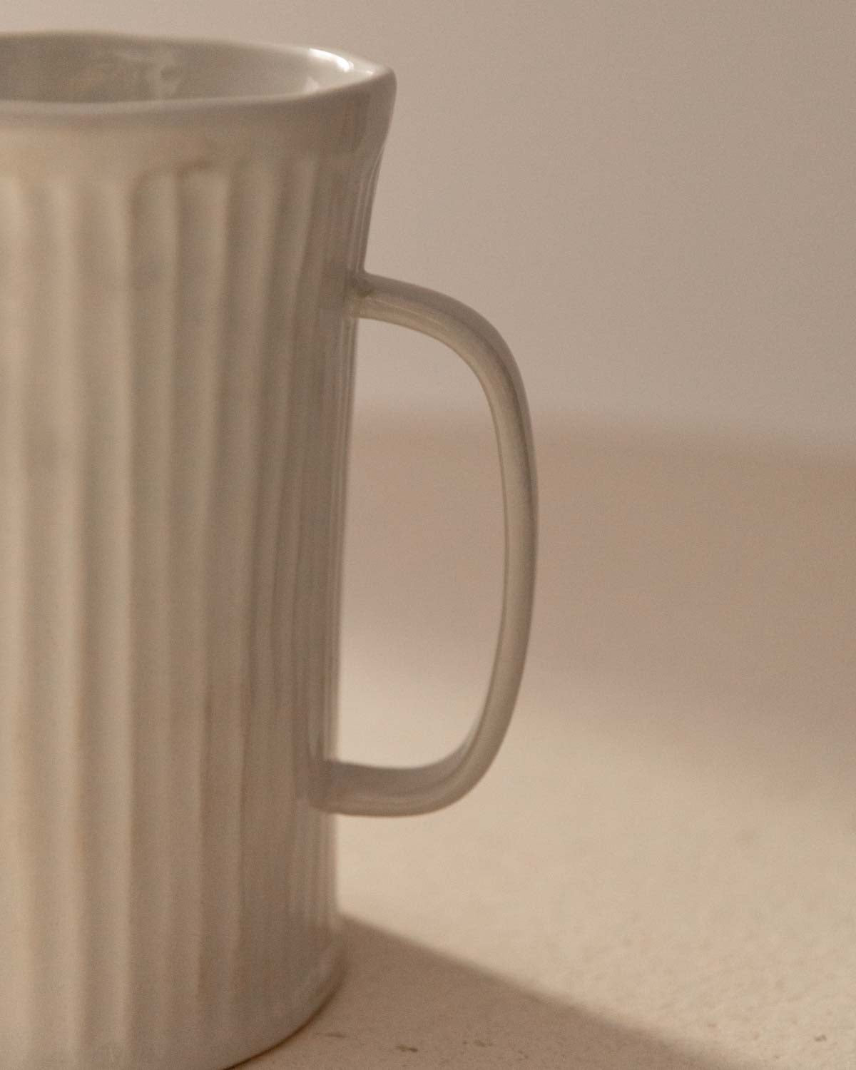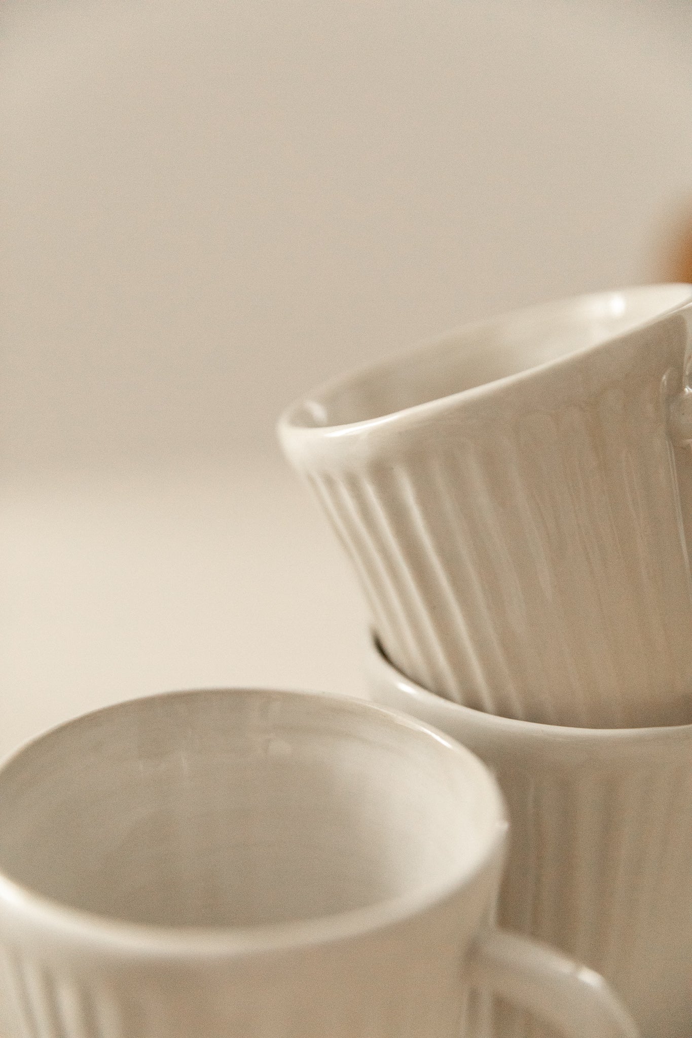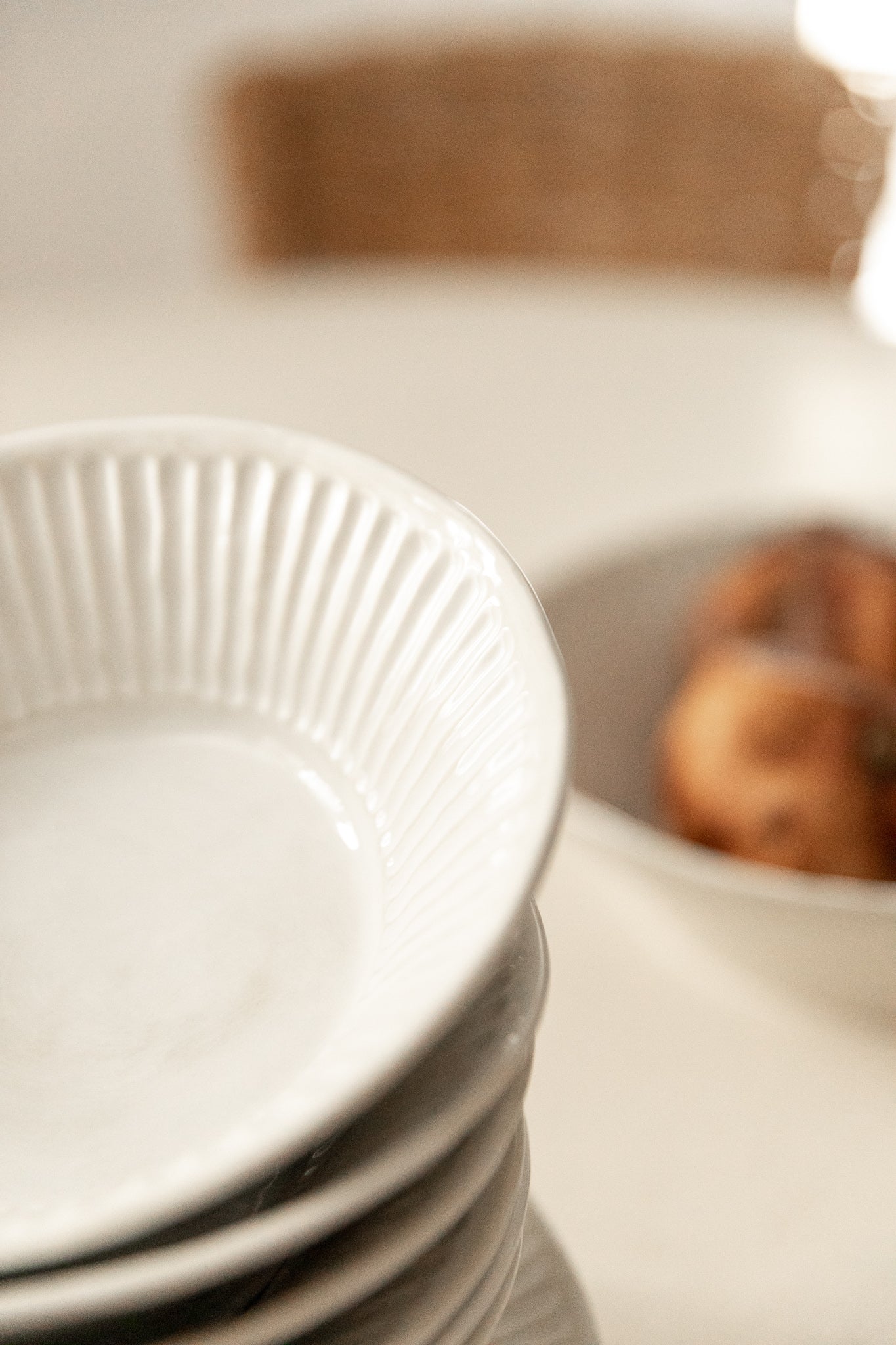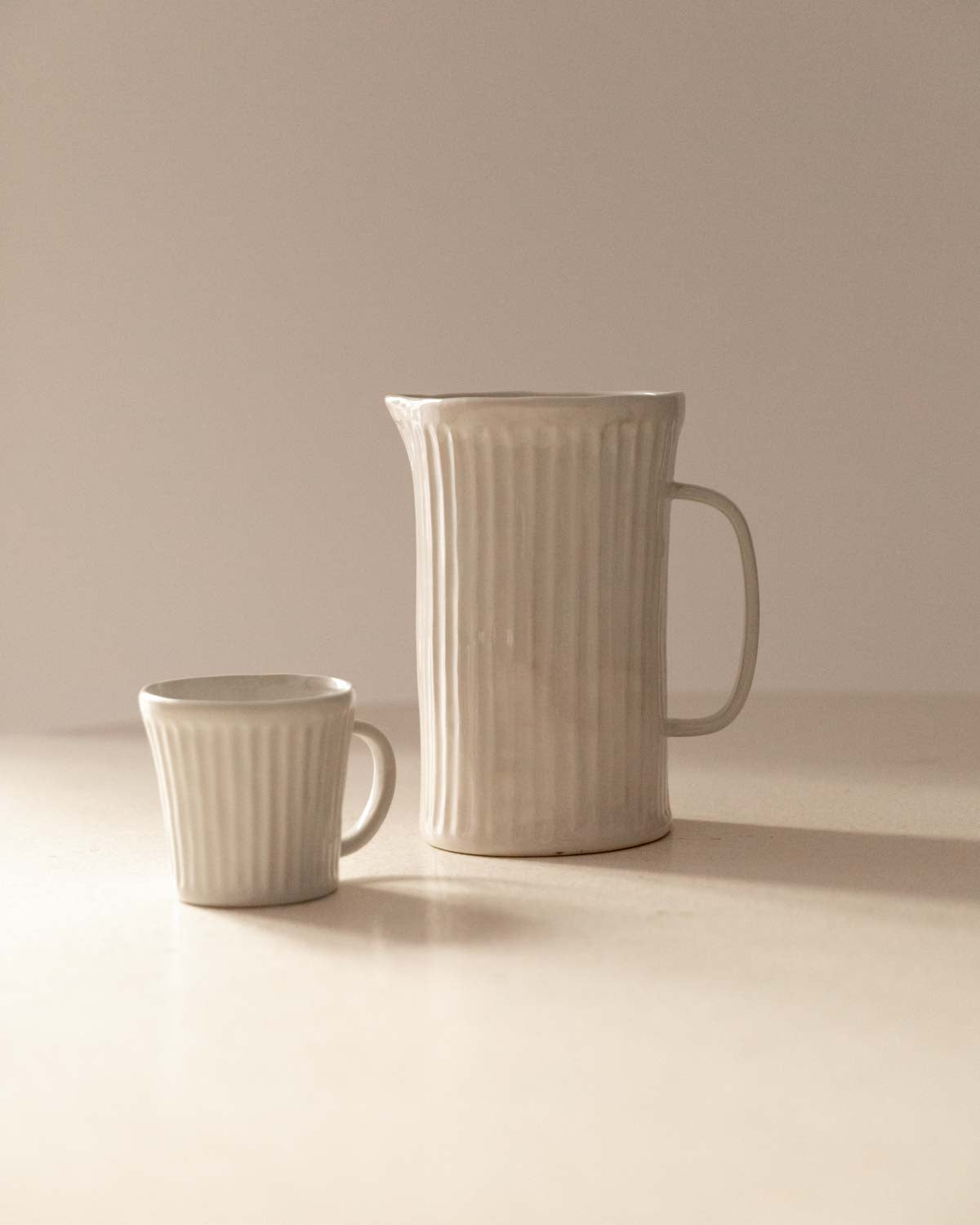 Vajilla de Gres Blanca Estriada. El gres, material reconocido por su resistencia y durabilidad, ofrece un acabado liso y robusto, ideal tanto para el uso diario como para ocasiones especiales.