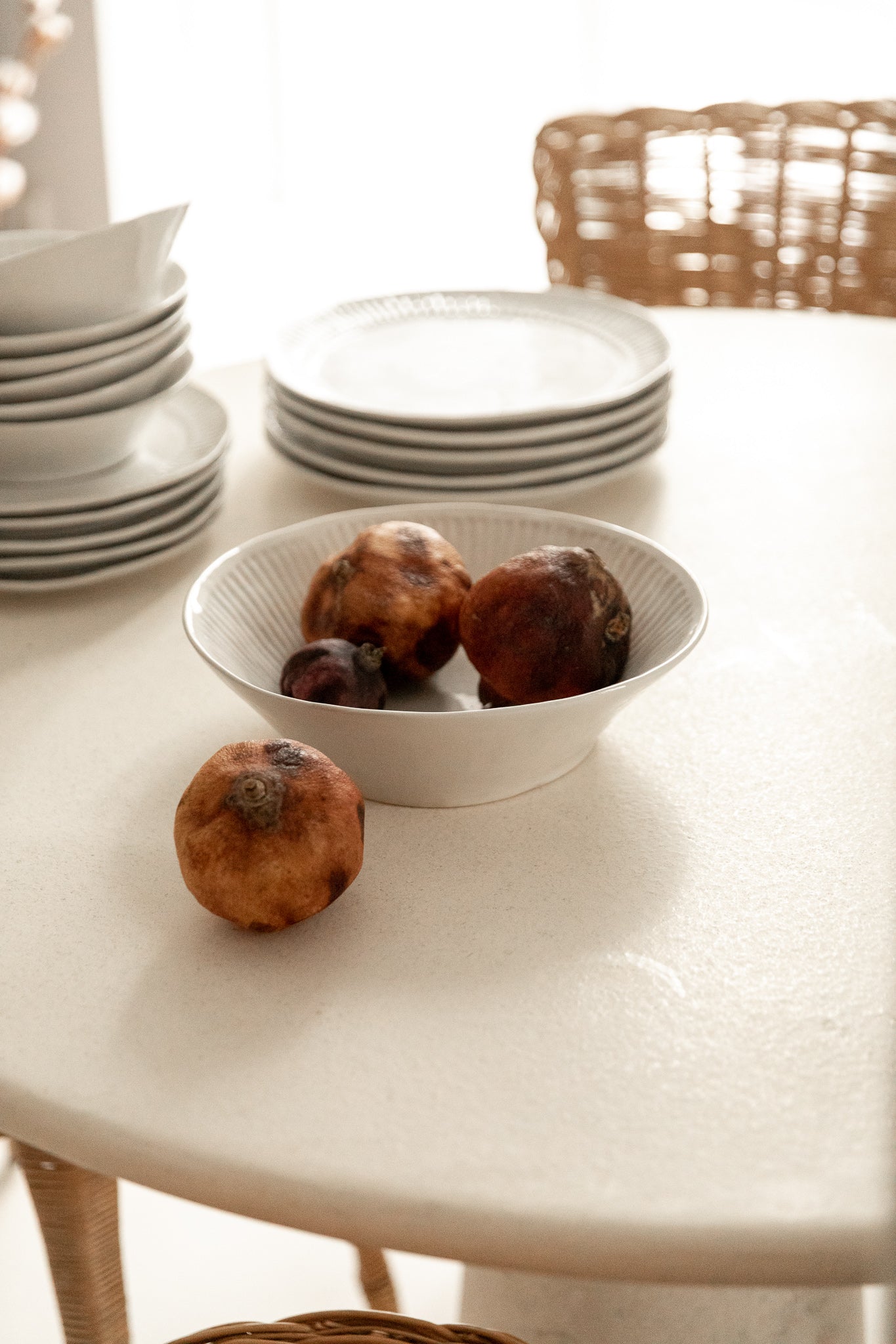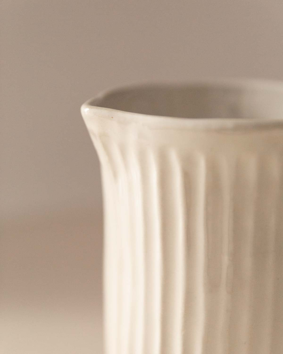 Su diseño sutil combina sencillez y artesanía, aportando calidez y refinamiento a la mesa. La superficie estriada interactúa con la luz, generando profundidad y una presencia serena y contemporánea.