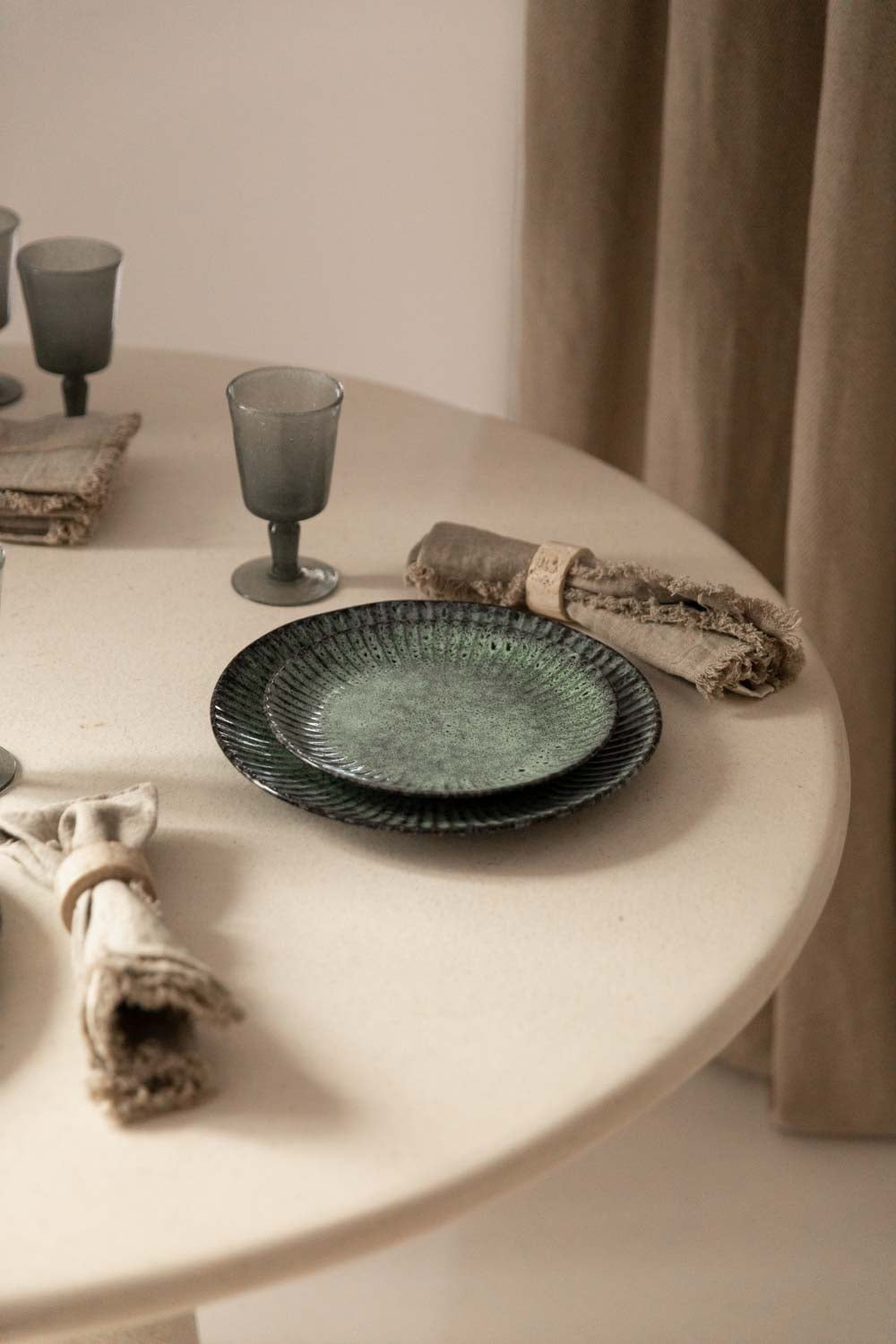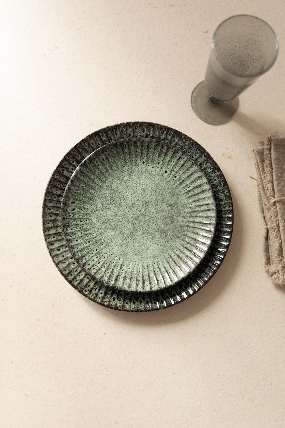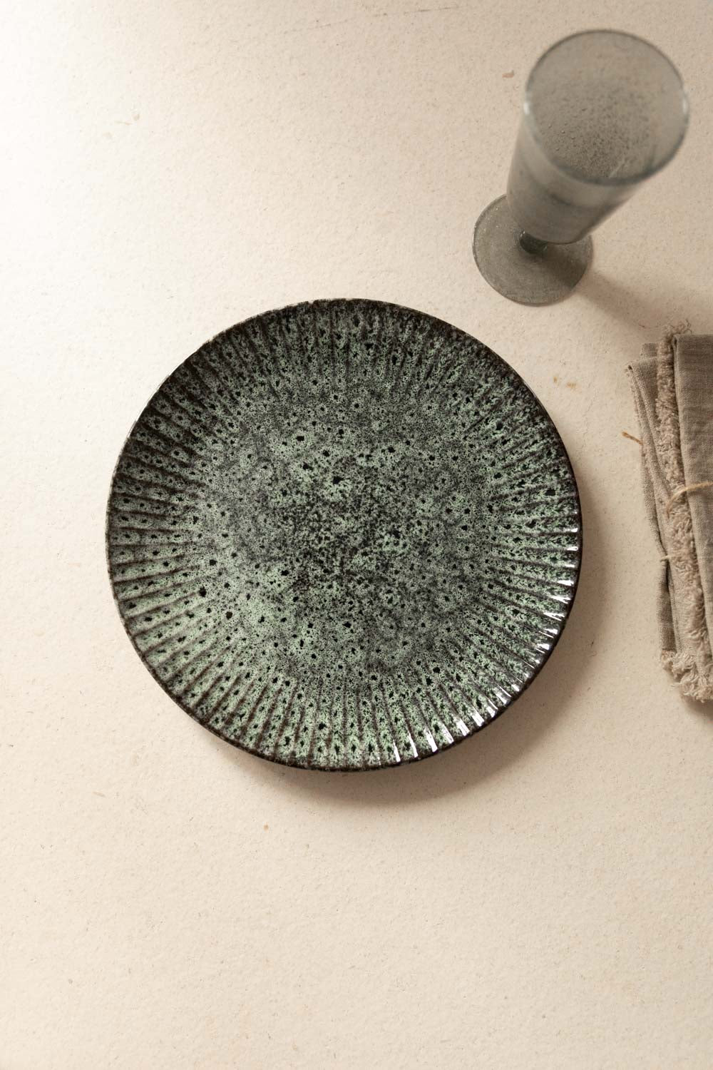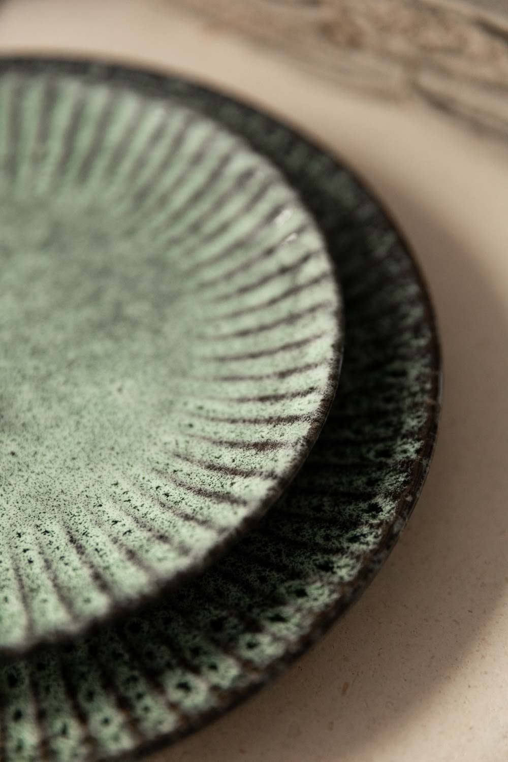 Vajilla de cerámica en color verde con motas marrones oscuras, diseñada para aportar carácter y frescura a la mesa.